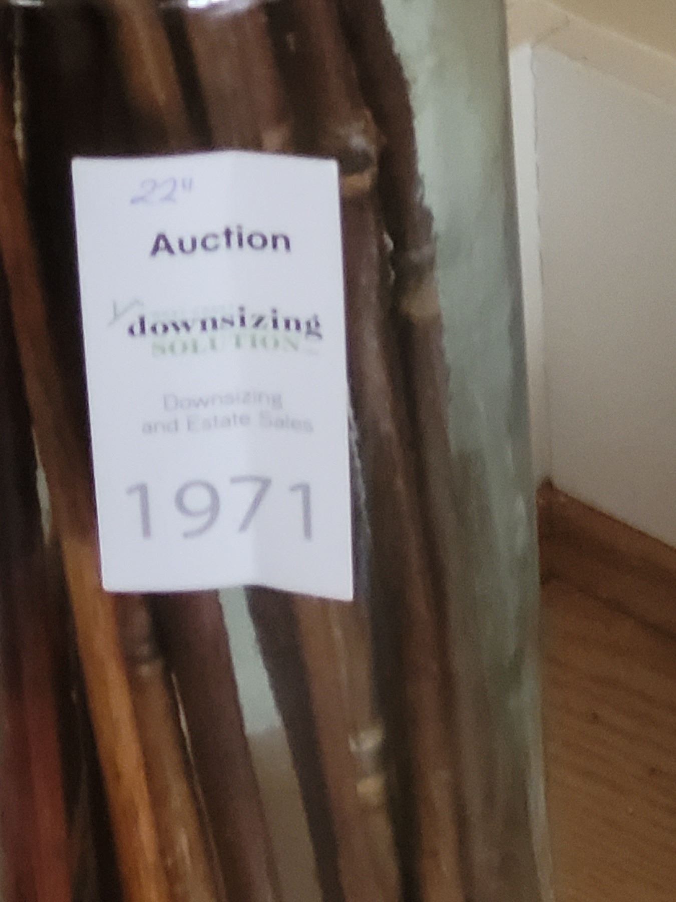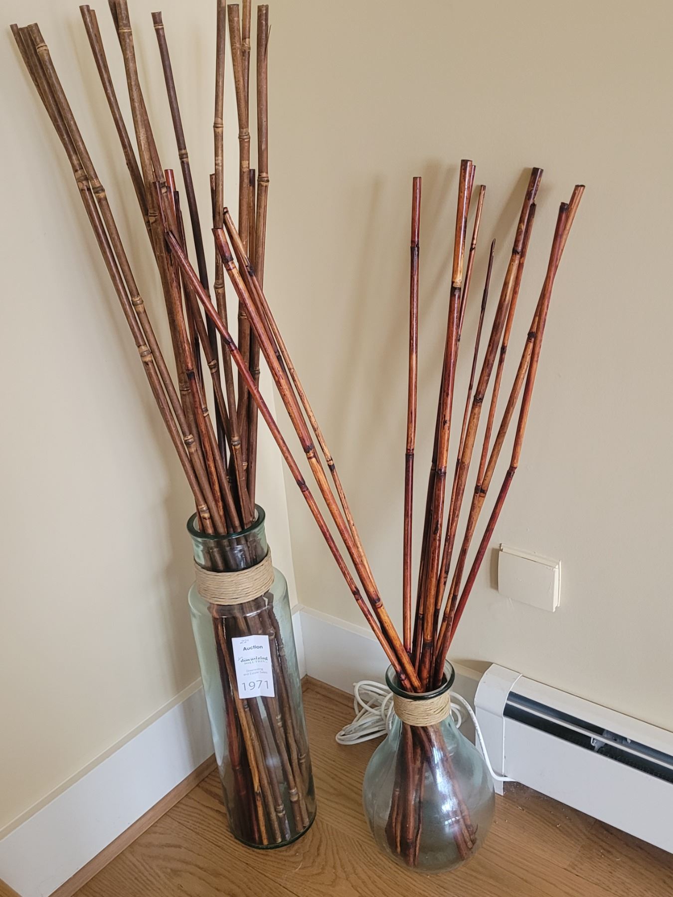 Glass vases with varnished bamboo sticks. 22" tallest. Pick up 9-10