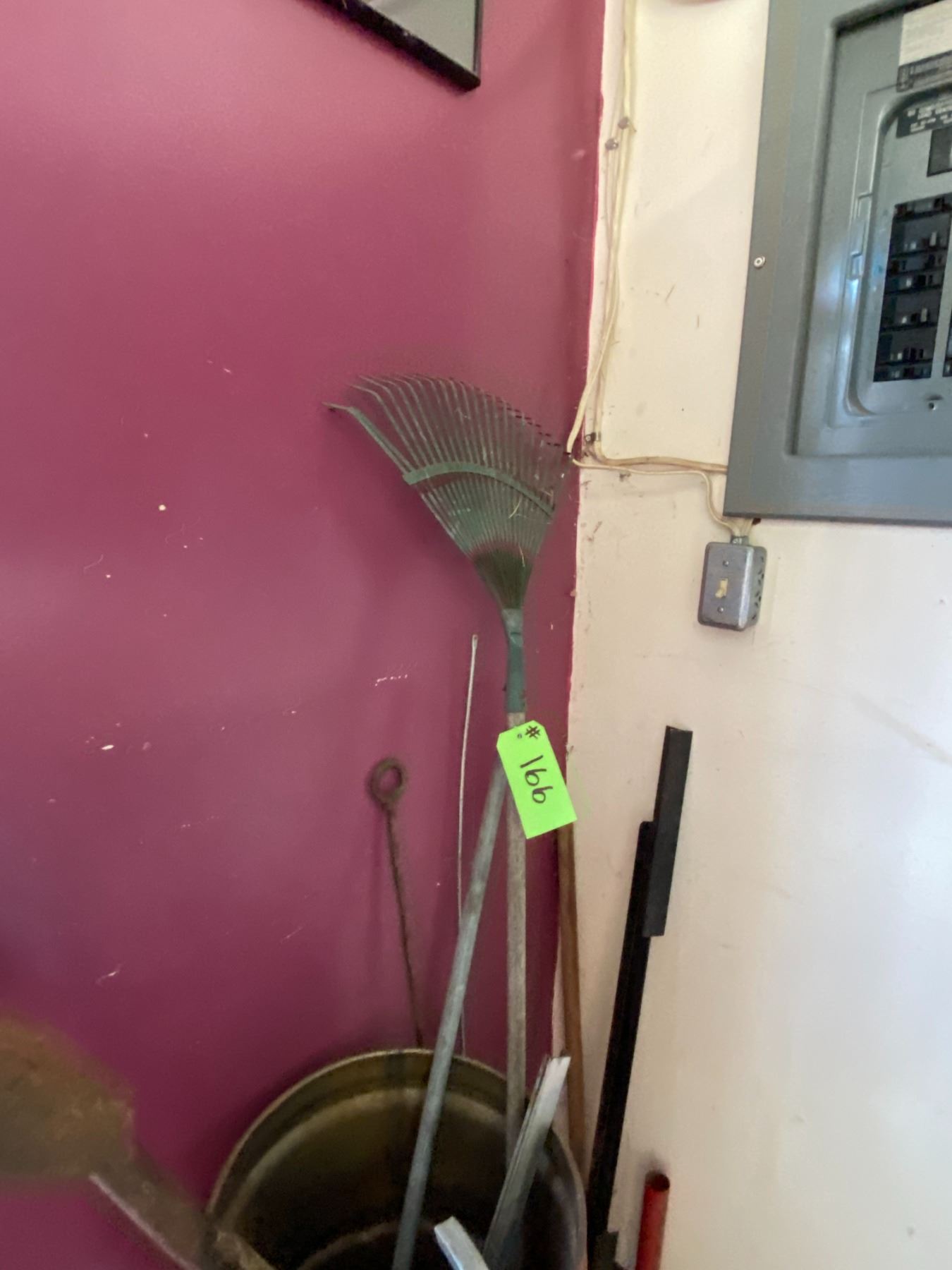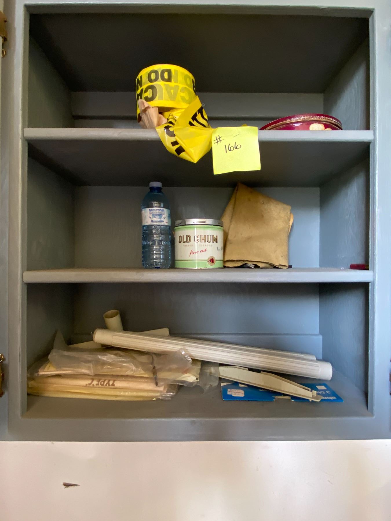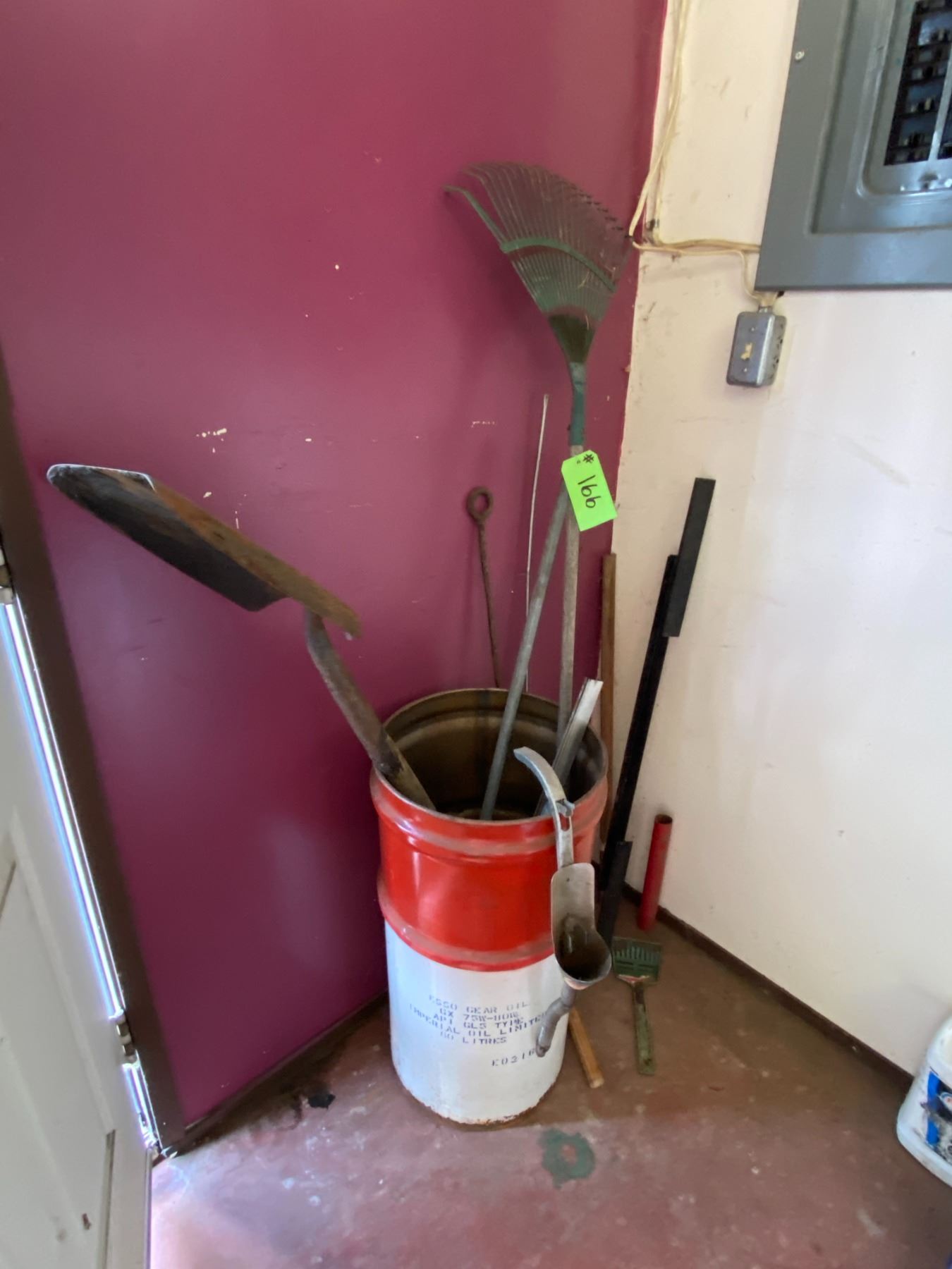 Barrel c/w misc. tools, 2 Rolls of Caution Tape & misc. in cupboard