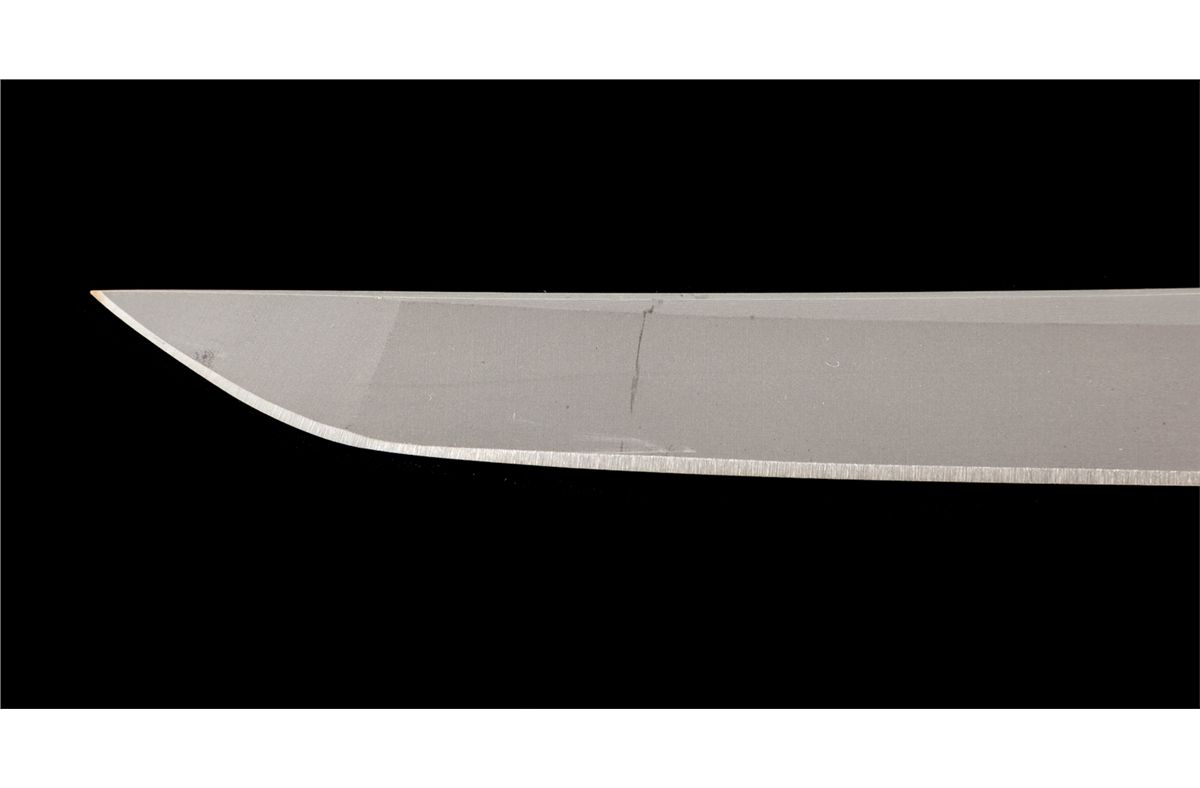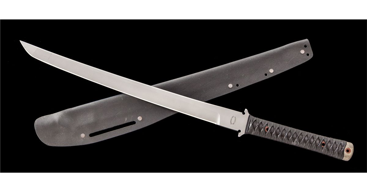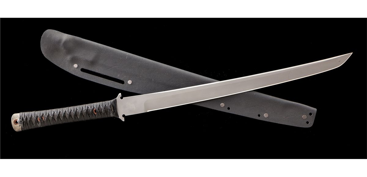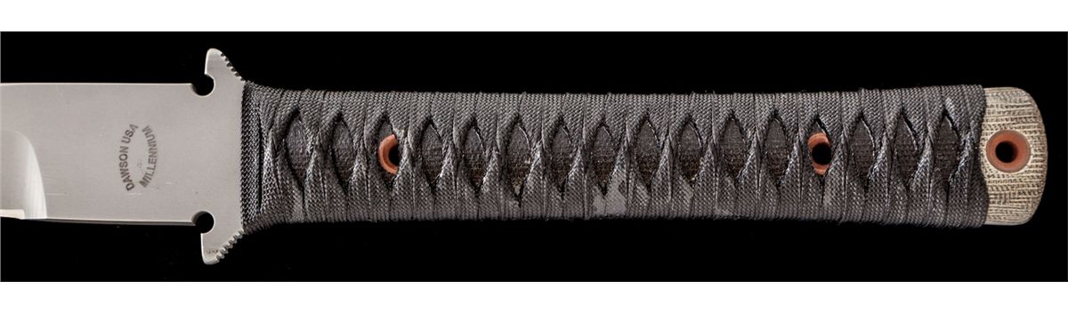 Barry Dawson Millennium Sword. Classic midnight finish blade measures 16-1/4'' and is marked ''DAWSON USA/MILLENNIUM''. Overall length is 23-3/4''. Micarta handle with signature Japanese interlocking wrap. With custom fitted black Kydex sheath. Condition is excellent and as new, showing no use. Blade is near mint with only one small black mark on either side near the tip. (It appears to be a rub mark from the sheath.) Wrapping on handle remains tight and is free of any fraying or defects. Kydex sheath with minor scuff marks from handling. Latest retail price on this sword is $1,025. Est.: $600-$800.