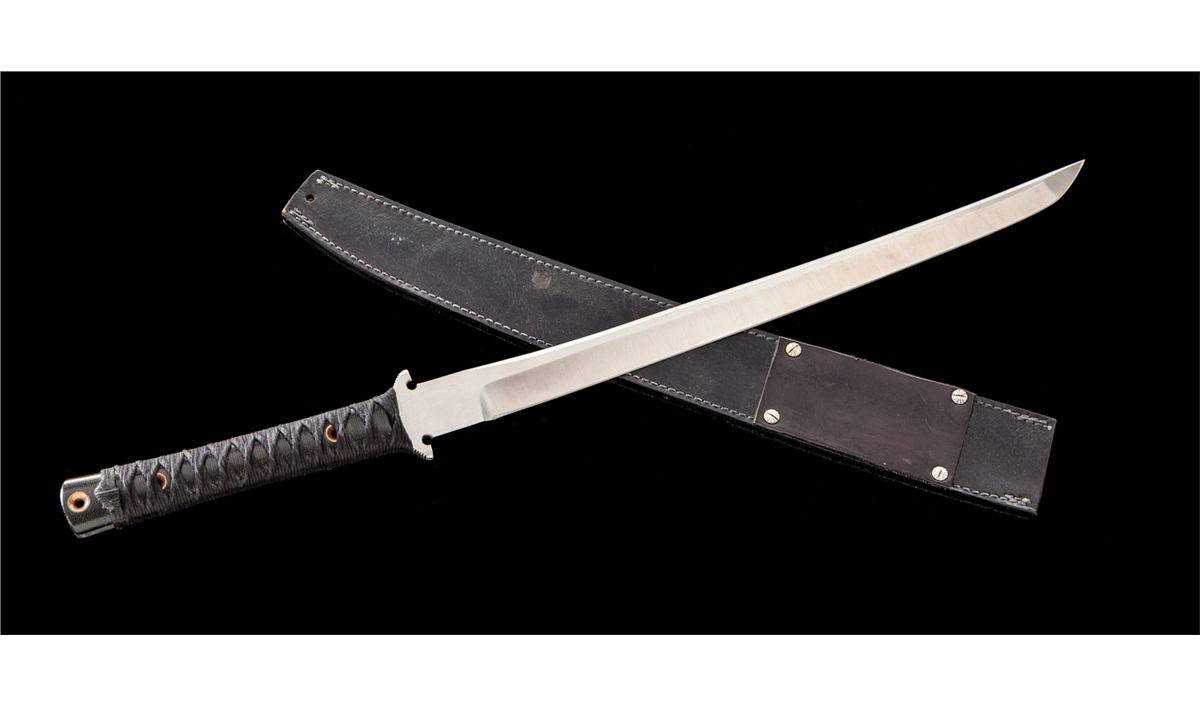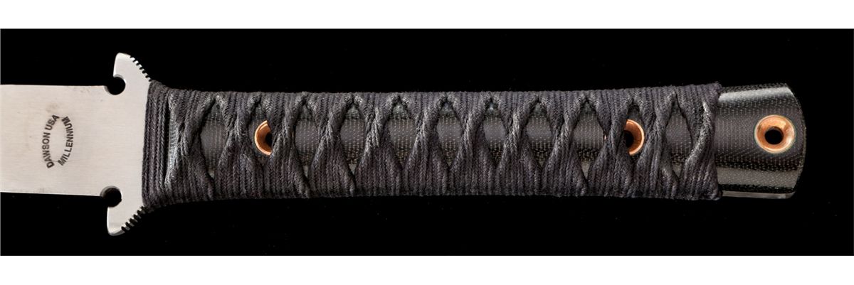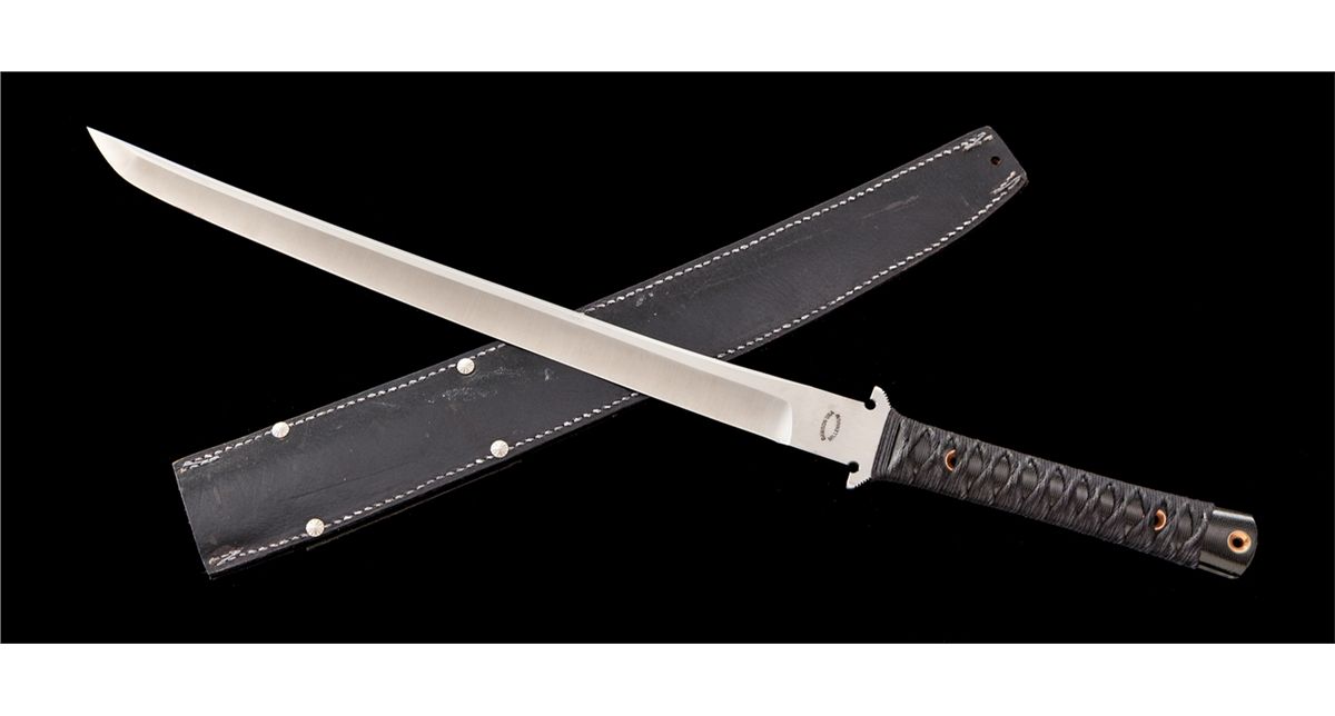 Barry Dawson Millennium Sword. Stainless steel blade measures 16-1/4'' and is marked ''DAWSON USA/MILLENNIUM''. Overall length is 23-3/4''. Black micarta handle with signature Japanese interlocking wrap. With unmarked black leather sheath. Condition is excellent and as new, showing no use. Blade with very few fine micro scratches from handling. Wrapping on handle remains tight and is free of any fraying or defects. Leather sheath with minor scuff marks; stitching and seams remain tight. Latest retail price on this sword is $1,025. Est.: $600-$800.