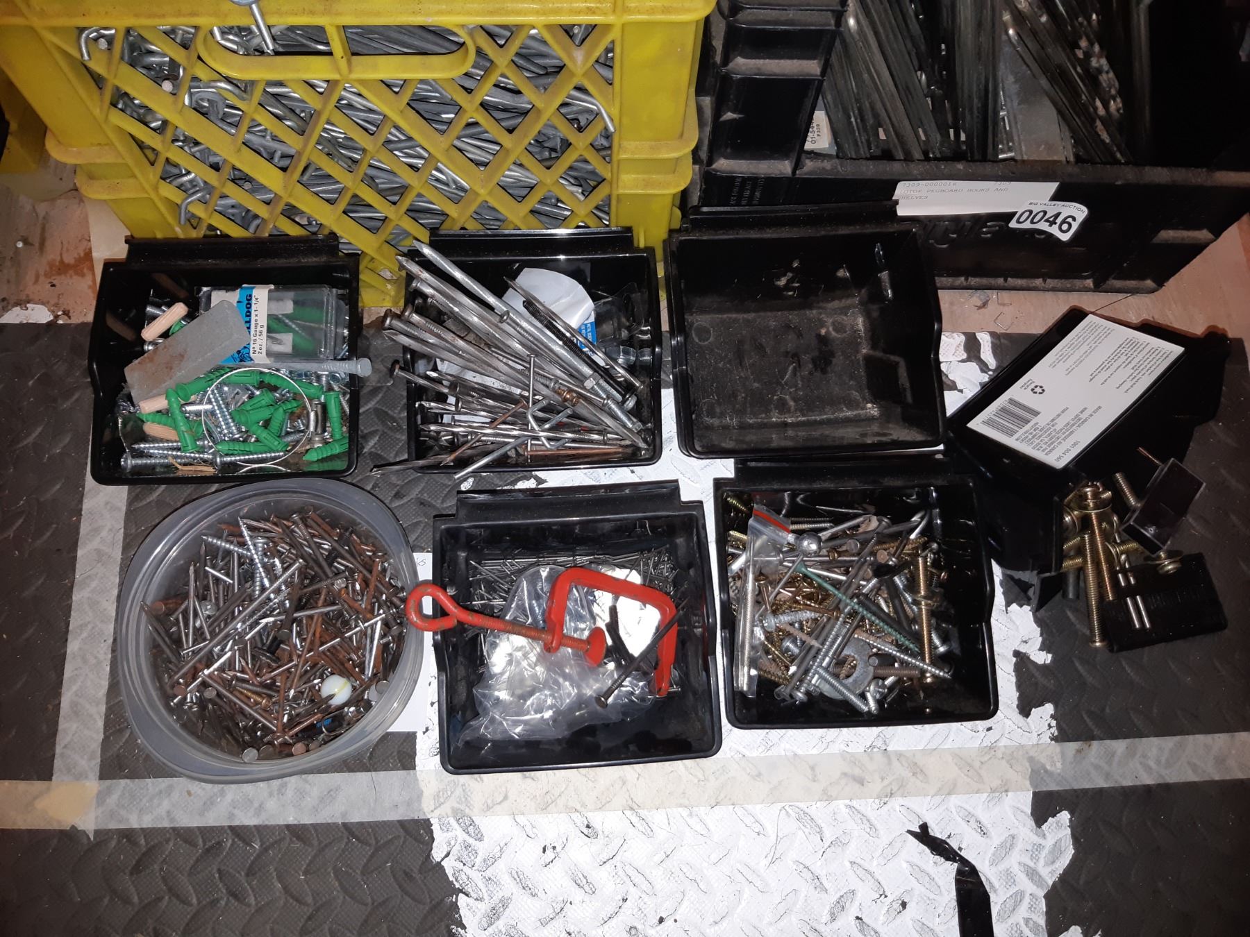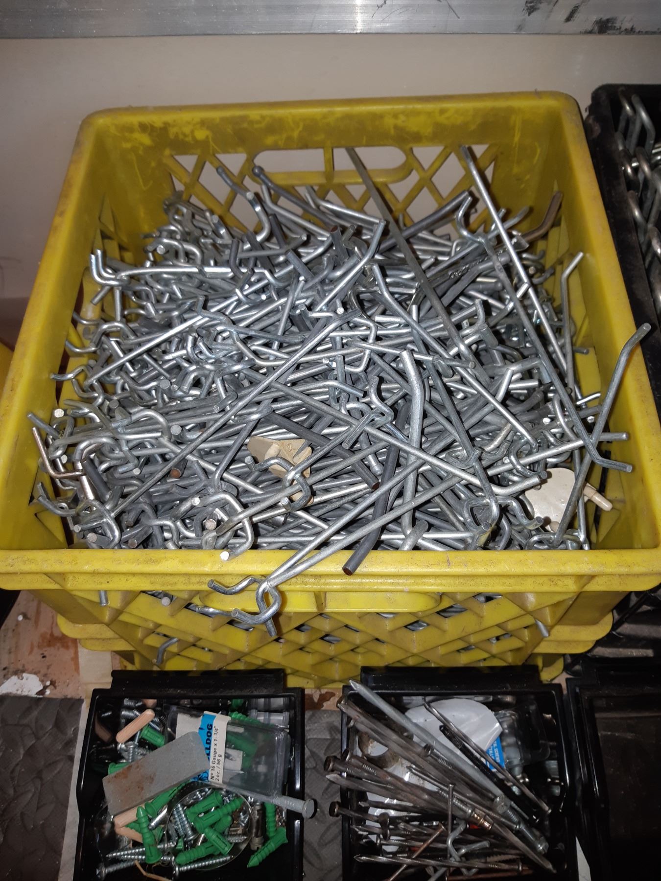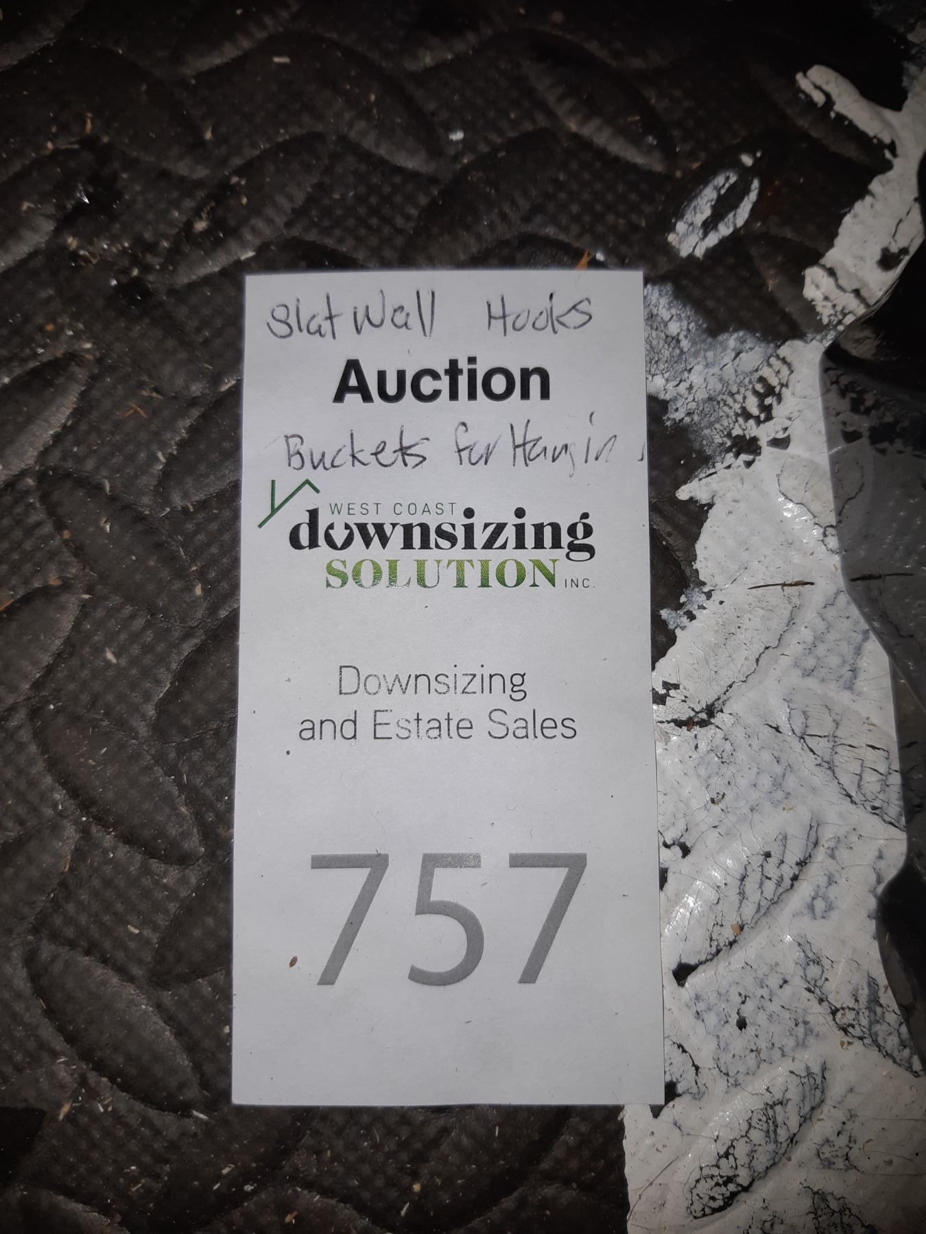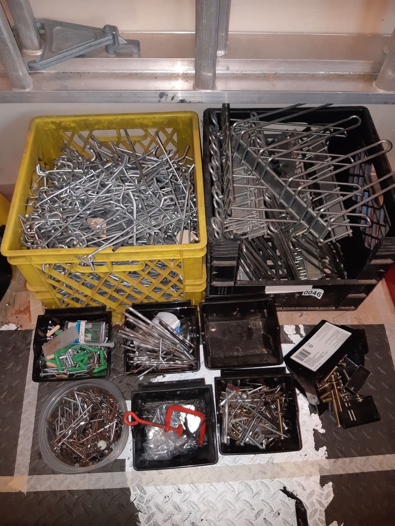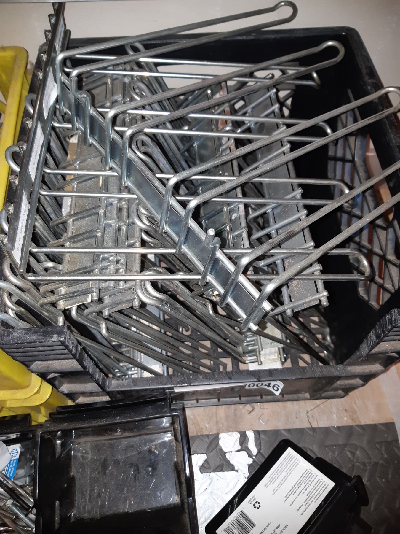Seven wall baskets with items, and 2 cases of hangers. Pickup at 9 - 11 am.