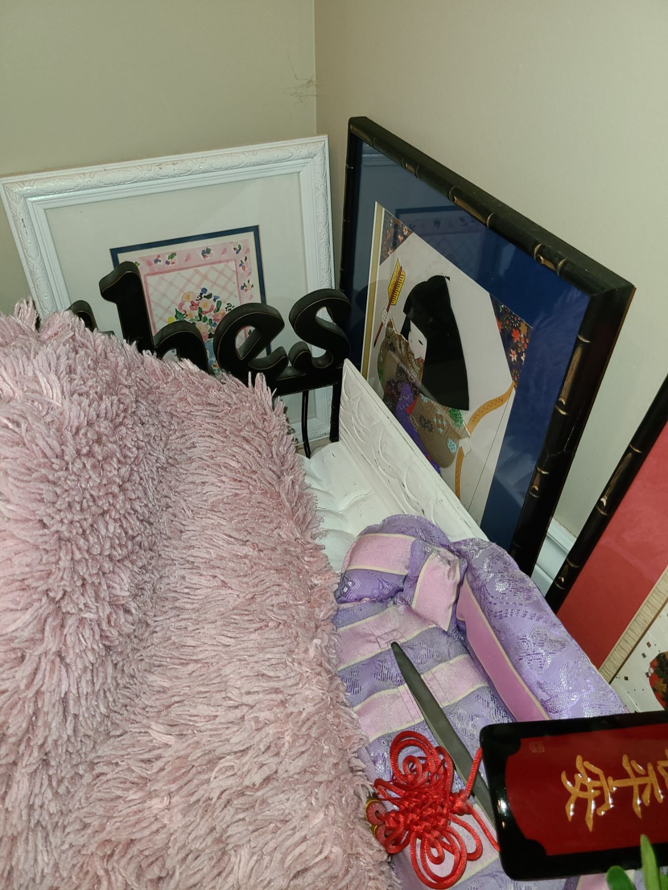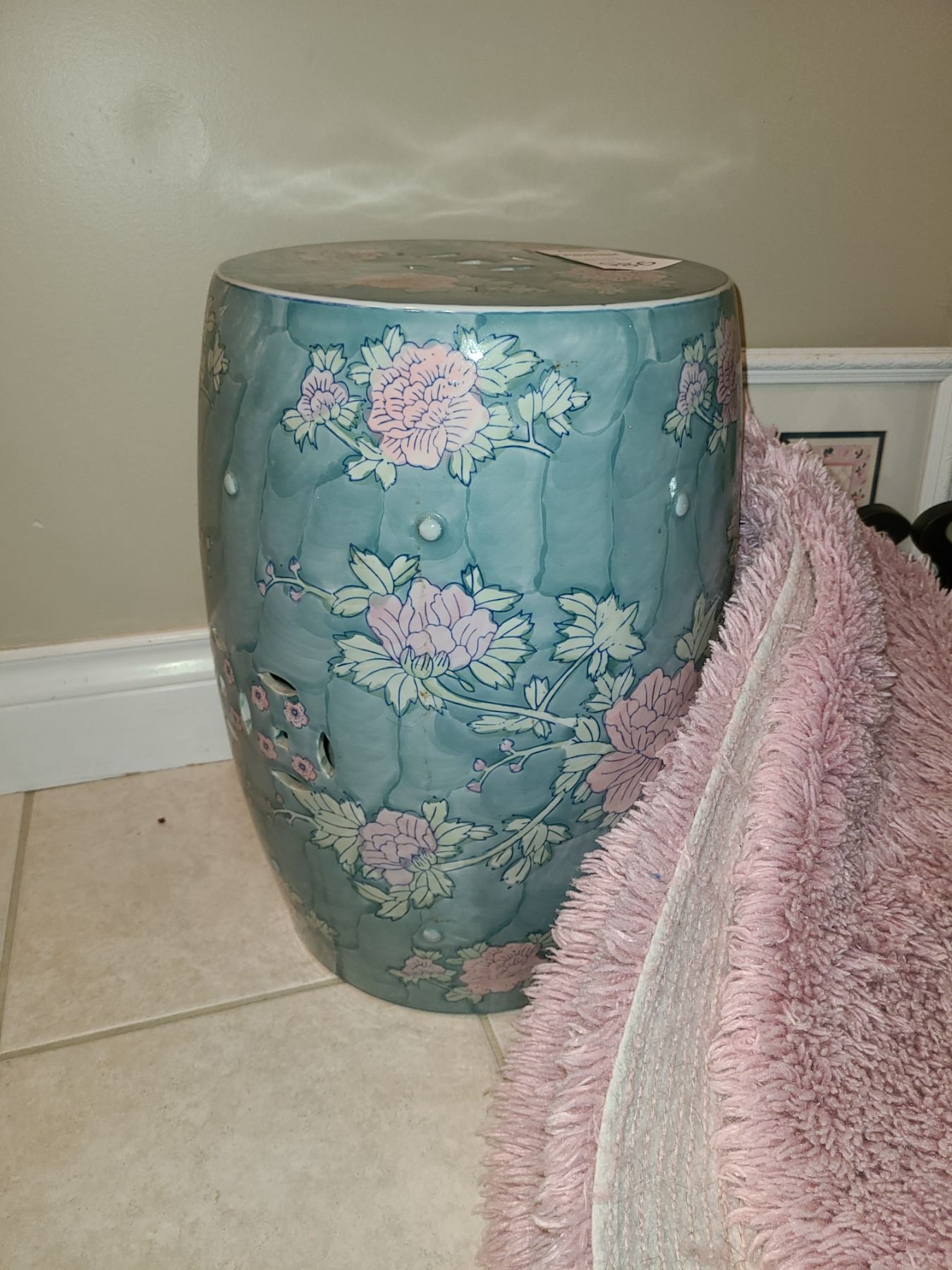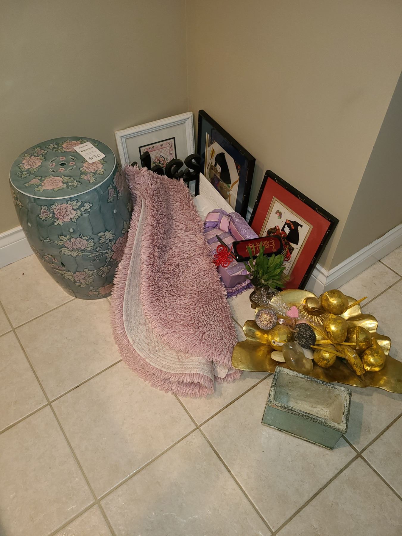 Ceramic seat/ stand 19”, geisha pictures, bath mat, and decor included. Bring boxes. Pickup 9 am.