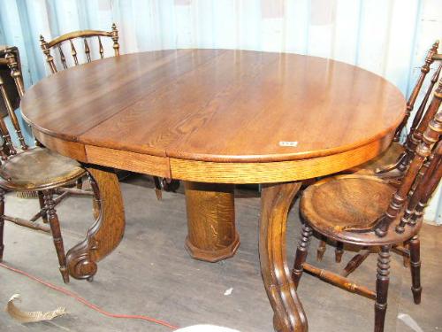 Beautiful round oak American table with 1 leaf and single pedestal, unusual carved legs (2)