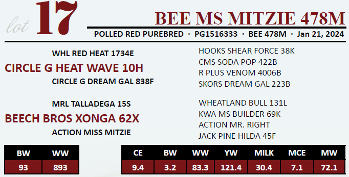 BEE MS MITZIE 478M - Homo Polled. Dilutor Free. - AI’ed Mar 23, 2025 to Perks Red Wolf 44G Reg# 1285705 Exposed to Moes Go Getter 46K – Reg# 1417356 from Apr 10, 2025 to May 22, 2025 Ultrasounded safe to AI on May 22, 2025. Approximate due date: Jan. 2, 202