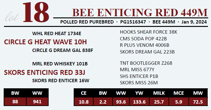 BEE ENTICING RED 449M - Homo Polled. Dilutor Free - AI’ed Apr 3, 2025 to Perks Red Wolf 44G Reg# 1285705 Exposed to Moes Go Getter 46K – Reg# 1417356 from Apr 10, 2025 to May 22, 2025 Ultrasounded safe to AI on May 22, 2025. Approximate due date: Jan. 13, 2026