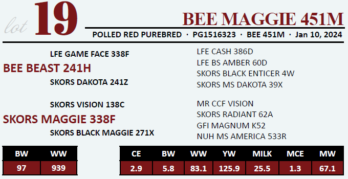 BEE MAGGIE 451M - Homo Polled. Dilutor Free - AI’ed Mar 24, 2025 to Perks Red Wolf 44G Reg# 1285705 Exposed to Moes Go Getter 46K – Reg# 1417356 from Apr 10, 2025 to May 22, 2025 Ultrasounded safe to AI on May 22, 2025. Approximate due date: Jan. 3, 2026