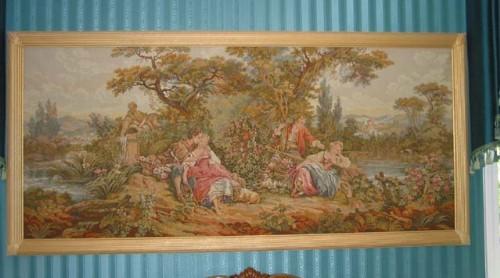 Belgium woven tapestry after Watteau in frame offluted gilded wood with a canthus leave corners 33" x 69"