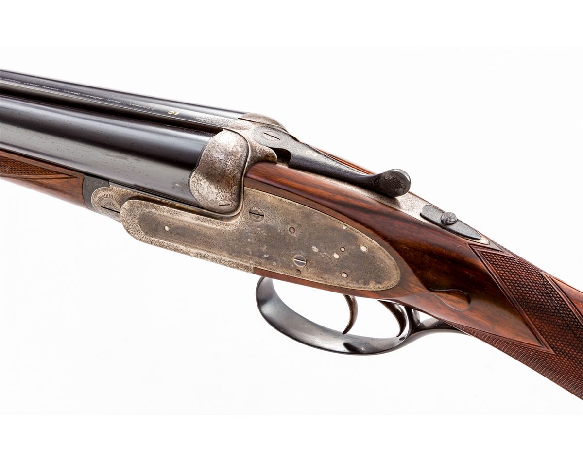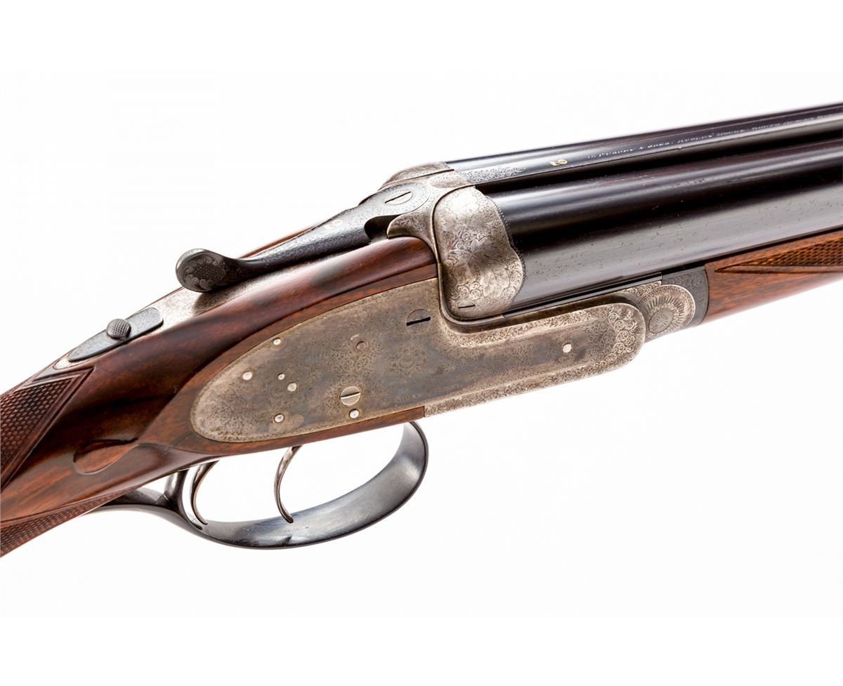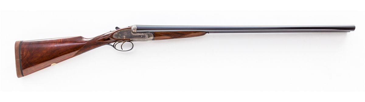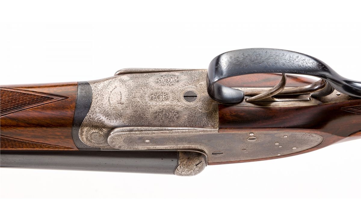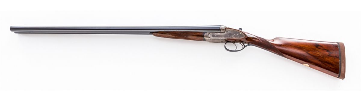 Best Quality Purdey & Sons Side-by-Side Shotgun, #20681, 12 ga., 30'' game rib barrels choked IC/IC , case hardened banknote and rosette engraved frame and sideplates, finely checkered English straight-grip walnut stock with splinter forend, and later added brown rubber butt pad. Top of barrel marked ''J. Purdey & Sons, Audley House, South Audley Street, London'', and ''Made of Sir Joseph Whitworth's Fluid Pressed Steel''. Steel front bead, double triggers, manual safety with ejectors, cocking indicators, and ovoid plaque at bottom of stock. Shotgun is engraved on lever and at breech portion of rib, as well as the forend tip in gold, with the No. 2, indicating that this is No. 2 of a two-gun set. (The whereabouts of the other shotgun are currently unknown.) Mfg'd 1911, with only 253 produced that year. Condition is excellent. Barrels retain approx. 98% of a fine English blue showing only light micro-scratching and thinning along the high edges of rib. Approx. 85%-90% of the original case colors are retained, with thinning at high edges and balance point. Shotgun shows minor evidence of professional re-blackening to both barrels and triggerguard. Stock and checkering have been refreshened somewhat, with small fissure emanating from rear checkered diamond approx. 2'' behind upper tang. Action remains crisp, bores are mirror bright. Length of pull to end of wood: 13-3/16''; to end of pad 14-7/8''. Stock with very minor right-hand cast-off. Drop at heel 2-1/2''; drop at comb 1-5/8''. Est.: $12,000-$18,000. (C&R) (Ernest A. Bryant III estate)
