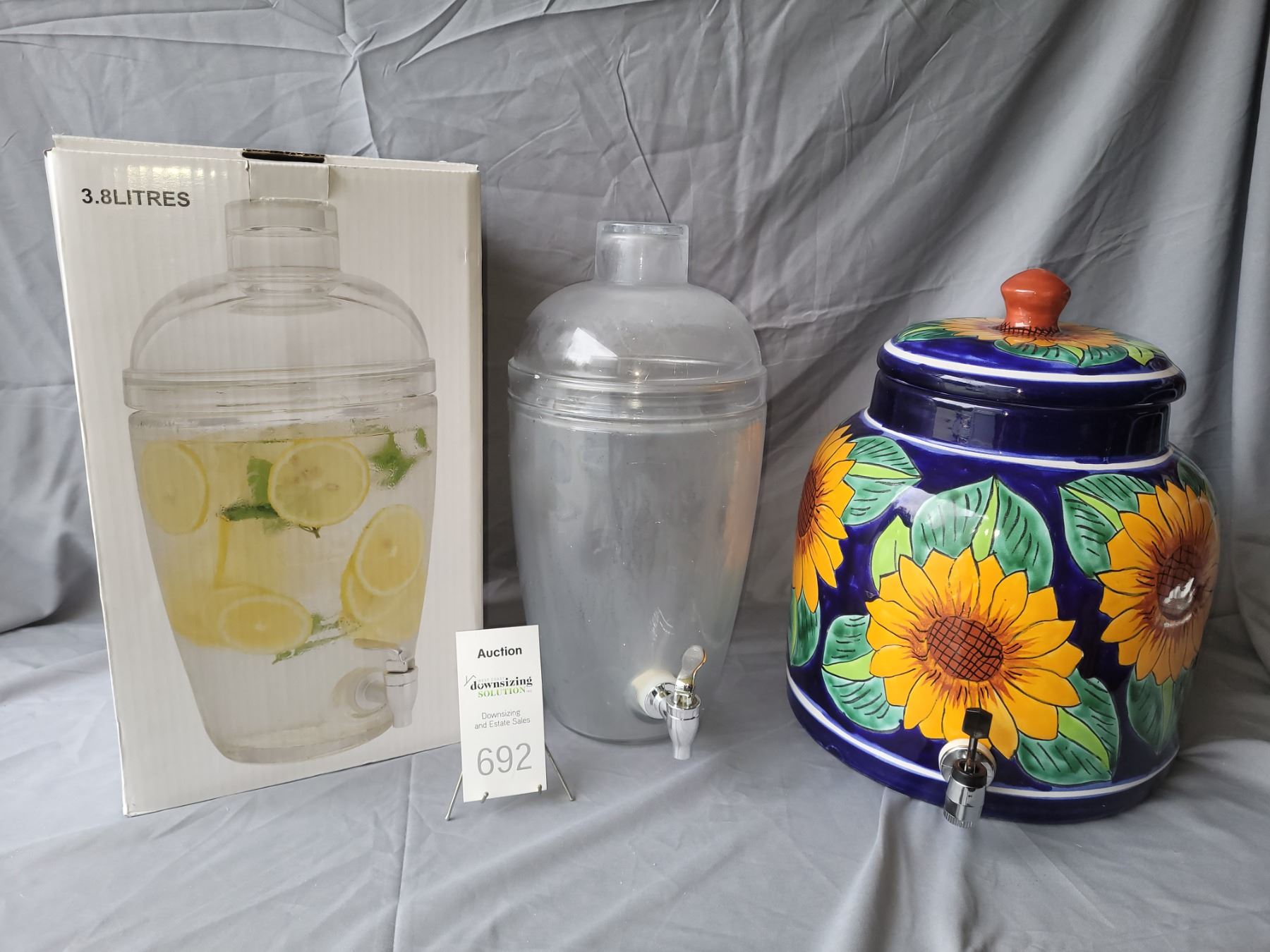 Large ceramic Sunflower drink dispenser. London Drugs 3.8 litre Glass Cocktail Shaket Beverage Dispenser. Pickup at 10 am