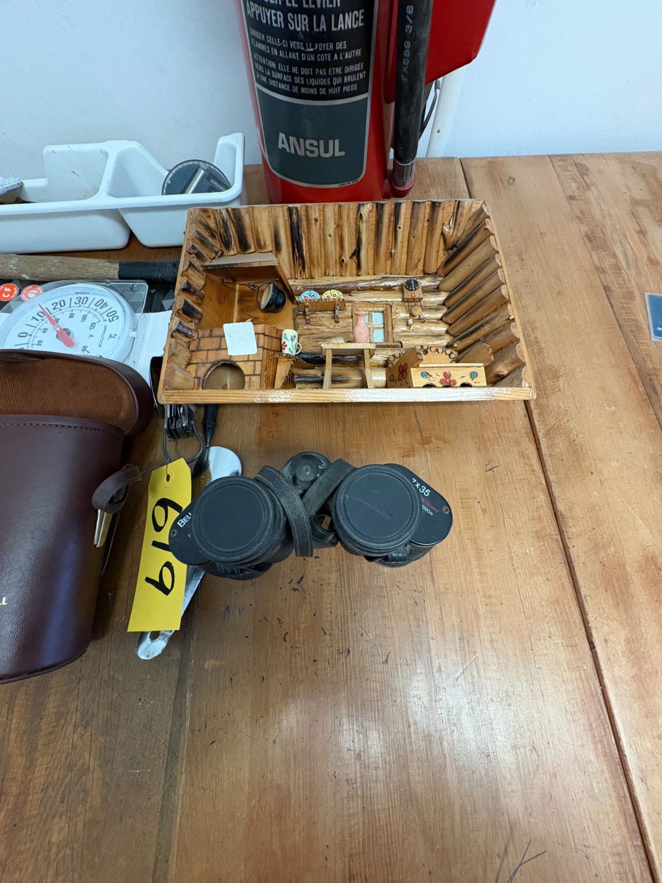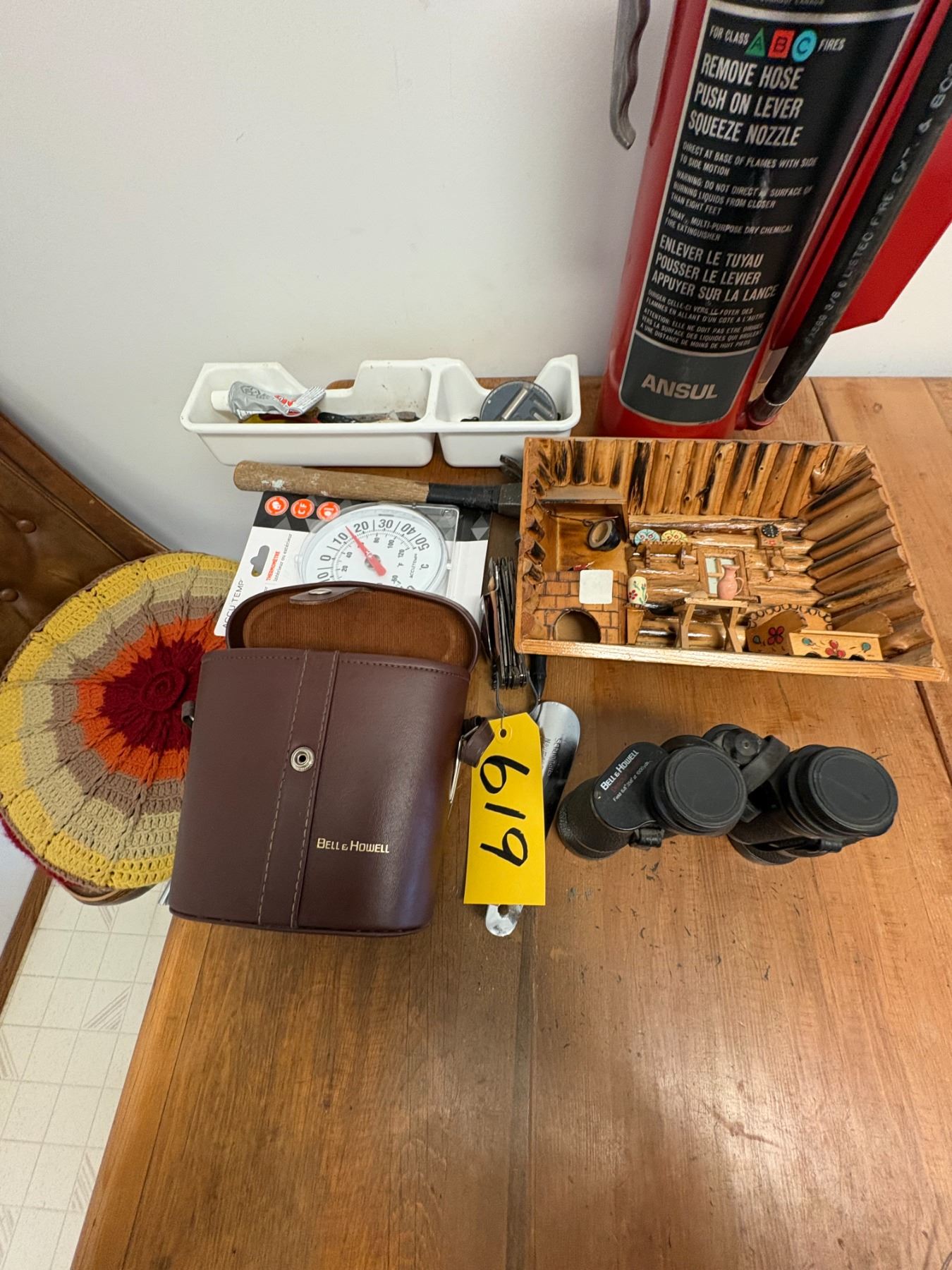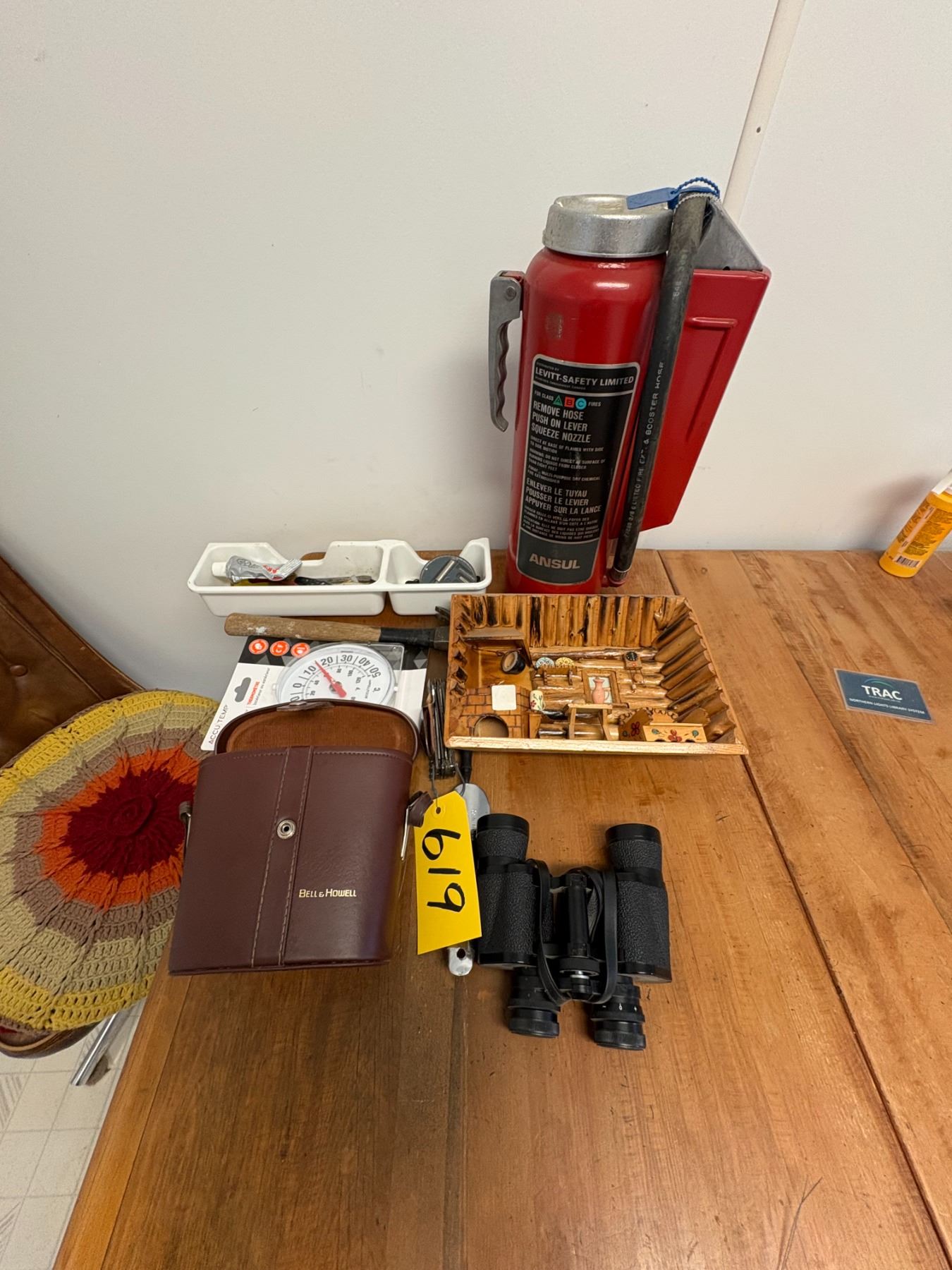 Binoculars, knife, thermometer, fire ext. hammer & misc.