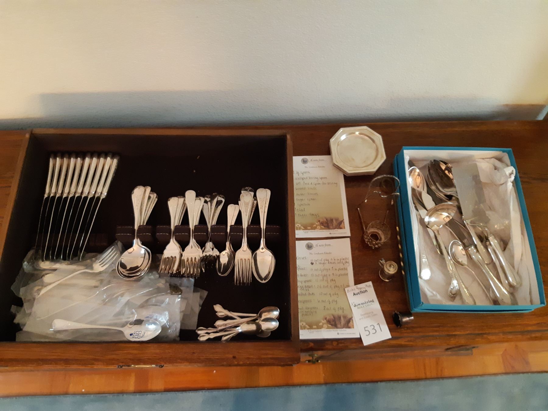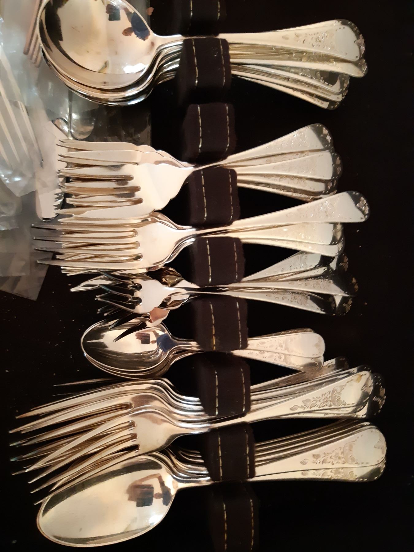 16 x Dinner Knives, 3 x Longer knives, 15 x Dessert spoons, 15x forks, 10x Soup spoons, 25 x sala/dessert forks, 10 x Seafood forks, 6 x teaspoons. Other pattern 8 x small spoons. 2 x large spoon, 1 x scalloped serving spoon, 1 x set fork & serving spoon, 1 x serrated knife, 2 x butter knives, 1 x sugar spoon, 1 x spatula, 1 x steel, 1 x sugar tongue. Bring packing material and pickup at 9 am
