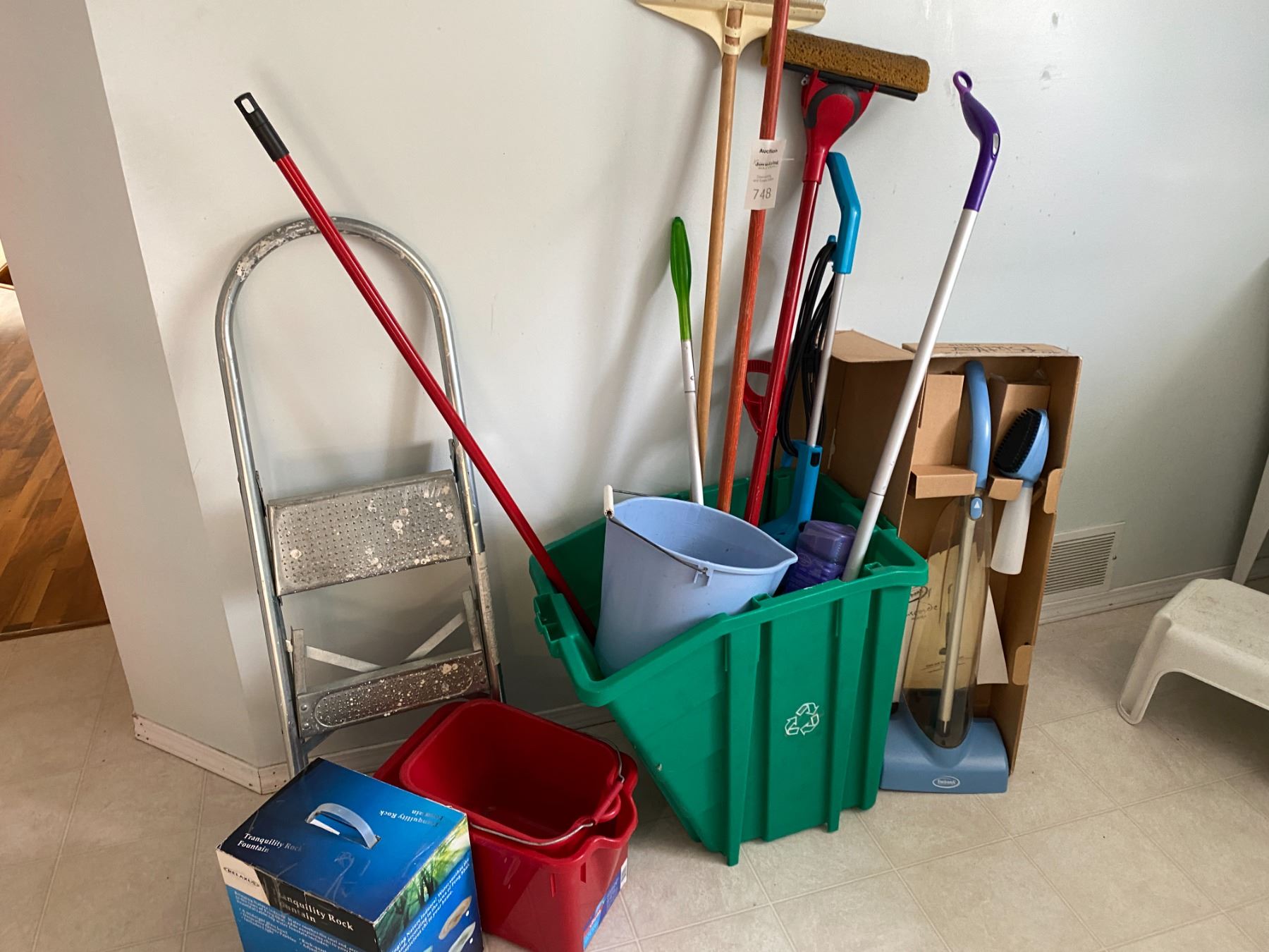 Cascade manual carpet cleaner, Bissell turbo featherweight vaccum, mops, brooms, table fountain. Pick up 9-10