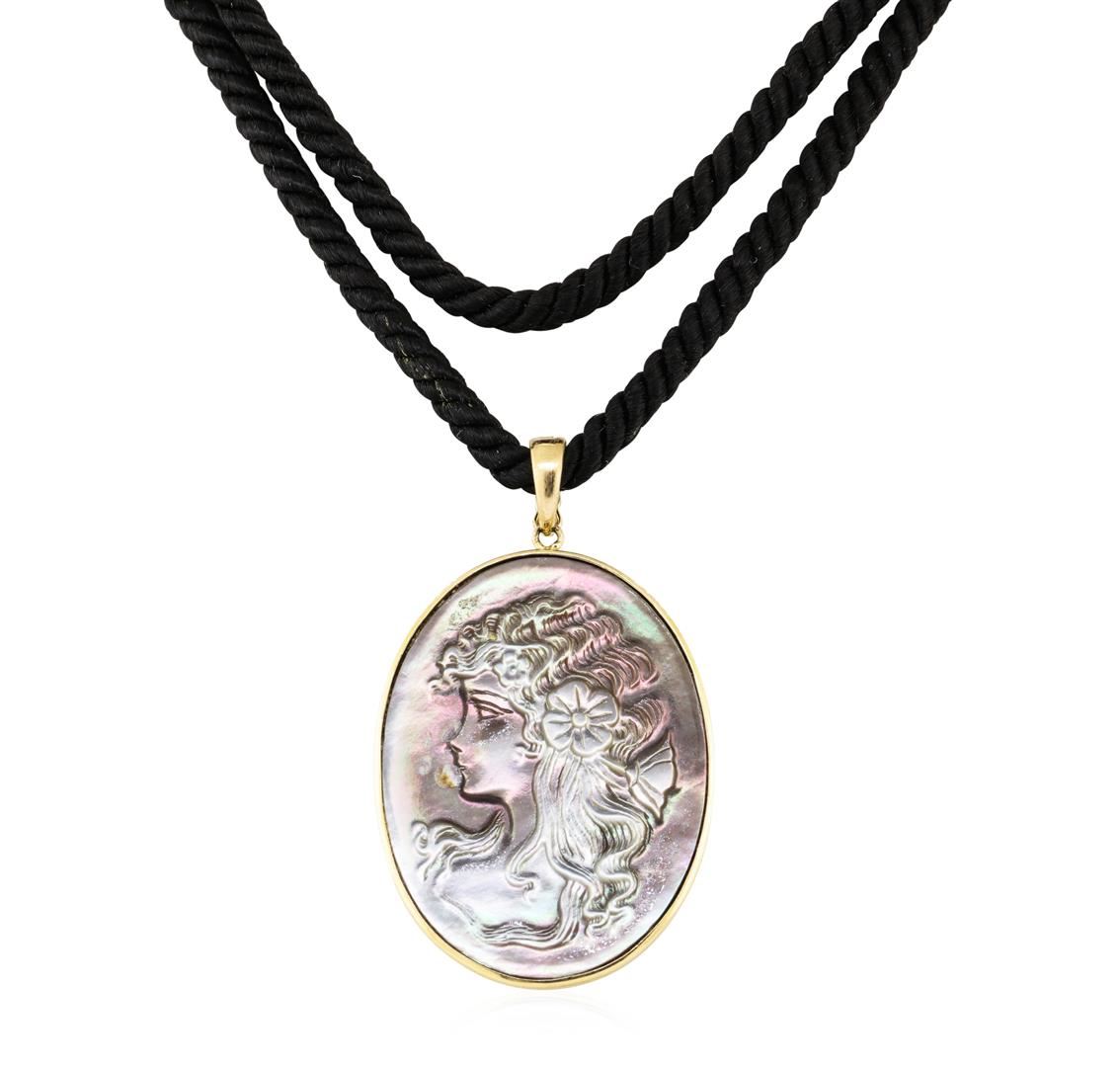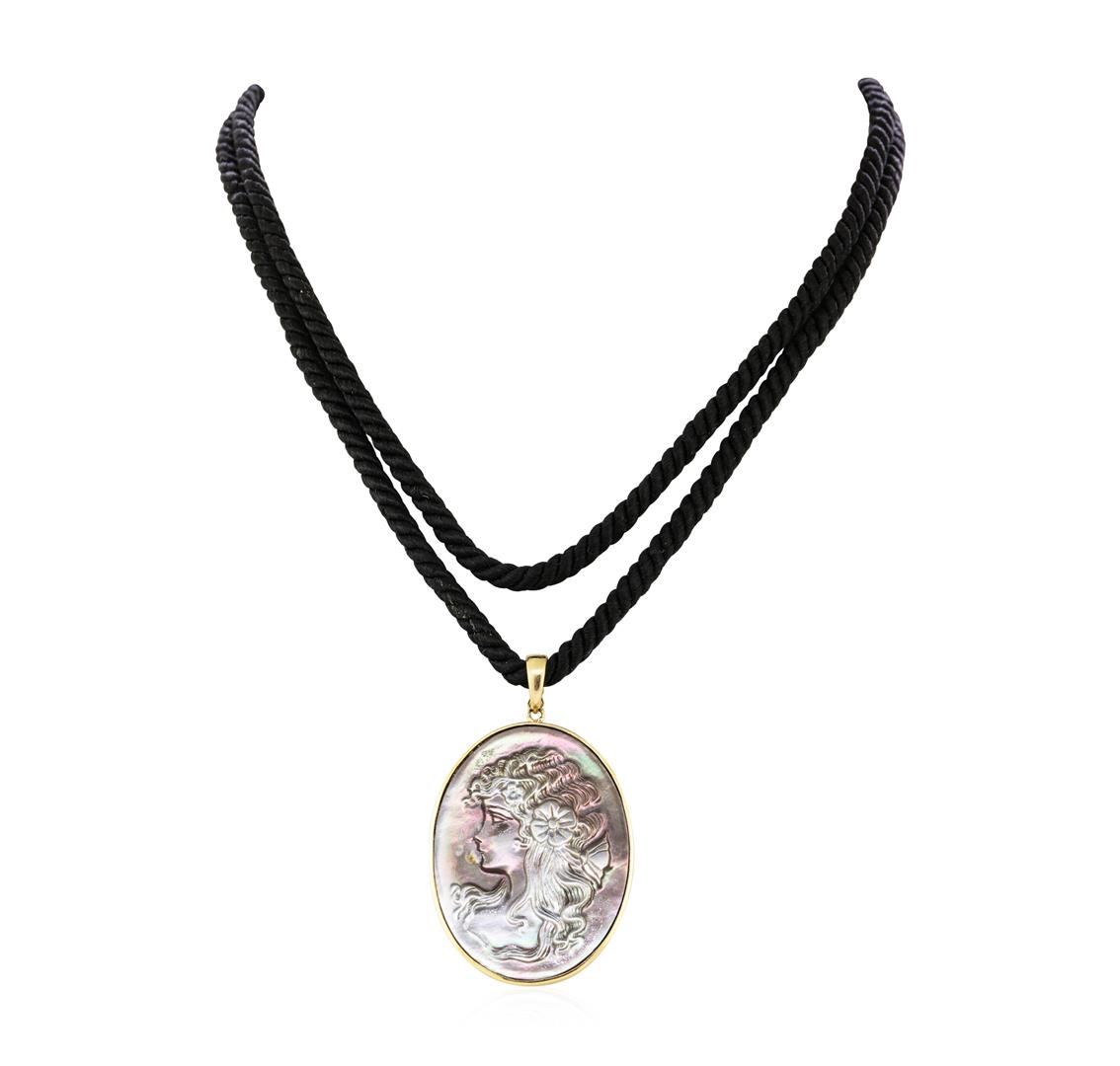 One pendant with an attached thirty-two inch long black silk cord featuring: 14KT yellow gold weighing 14.5 grams containing one hand-engraved oval-shaped black mother of pearl cameo measuring 40 by 30 millimeters.