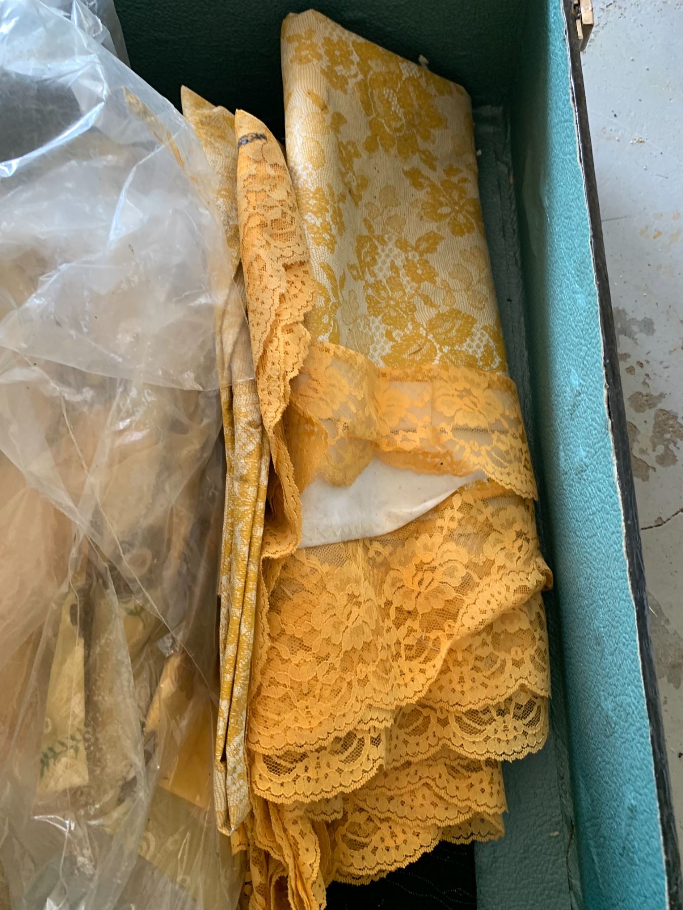 Black Suitcase with Art & Box of Assort. Of Cups, Saucers, Bowls
