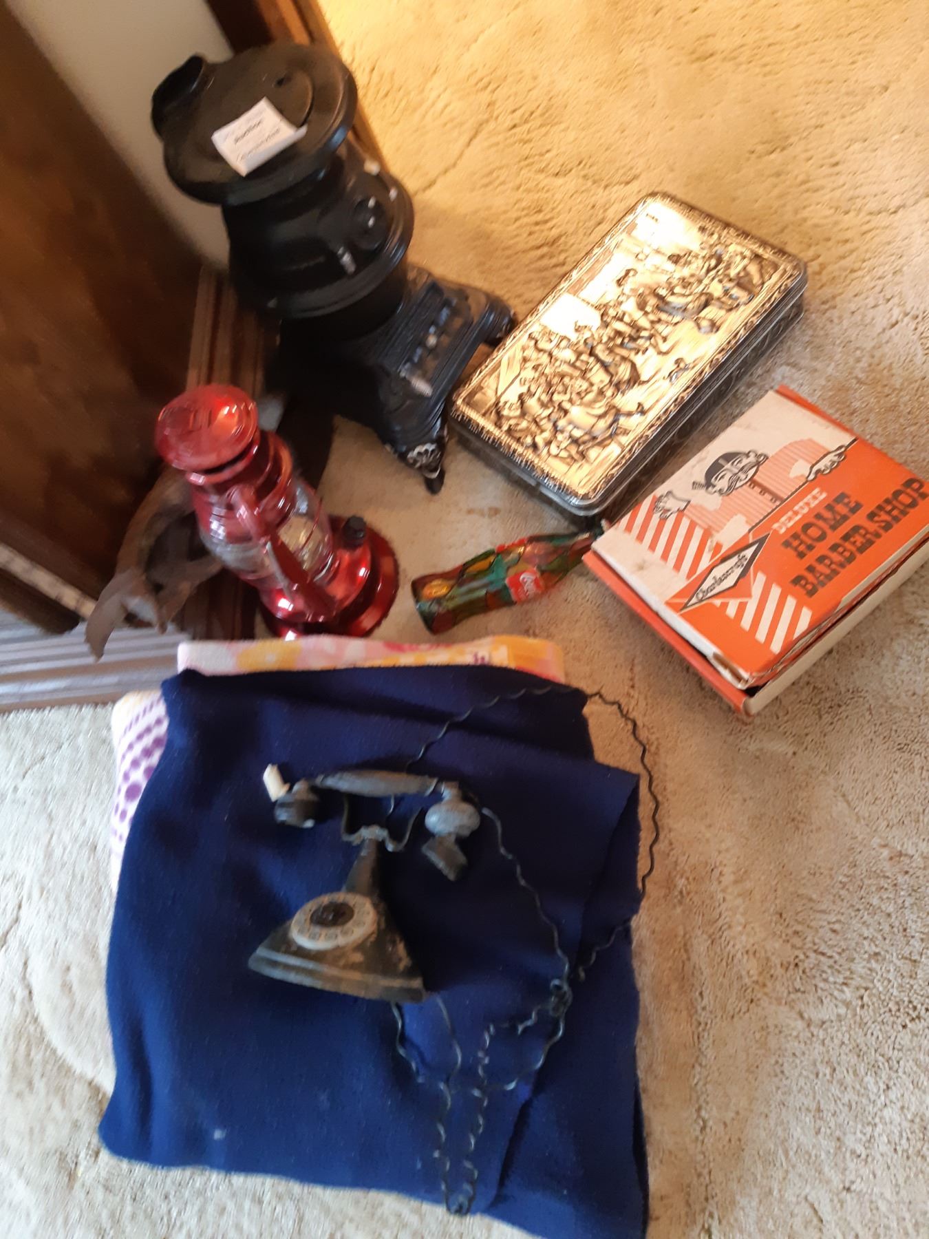 Blankets, lantern, mini stove decor, wood dolphins, vintage cigarette case, barbershop set untested, pickup 11am