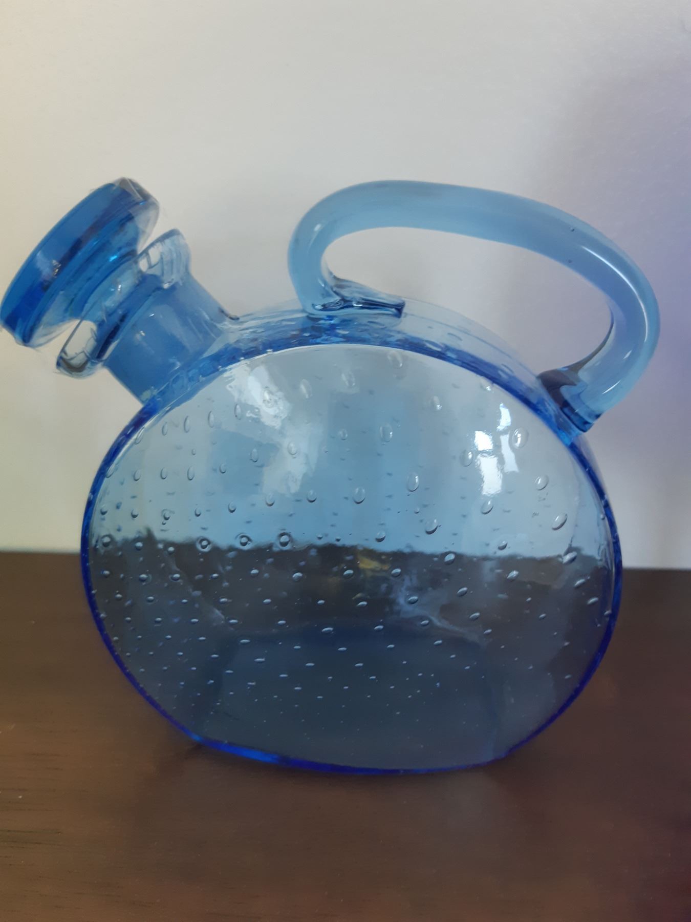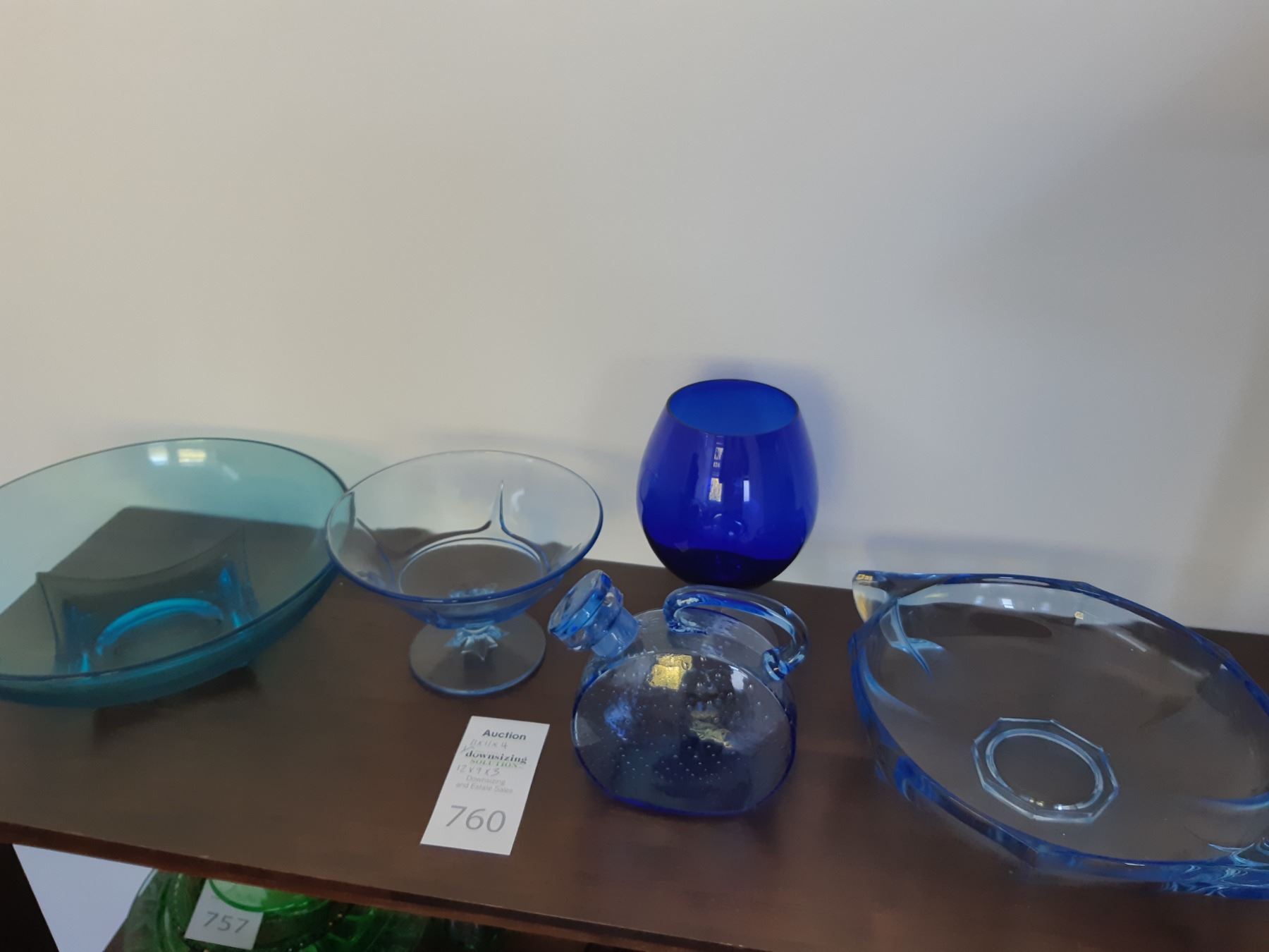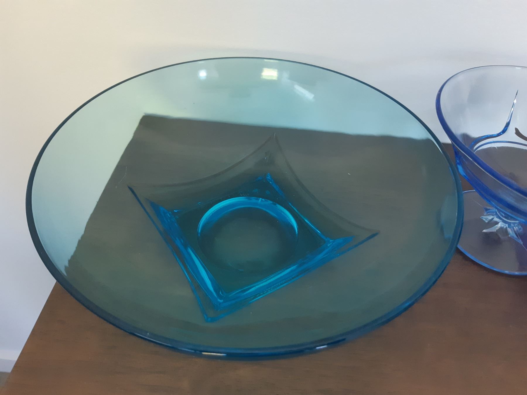 Glass Bowl 11x11x4, glass jug with stopper, Footed dish, darker blue blue dish 12x9x3 and Brandy Sniffer. Bring packing material and pickup at 9 am
