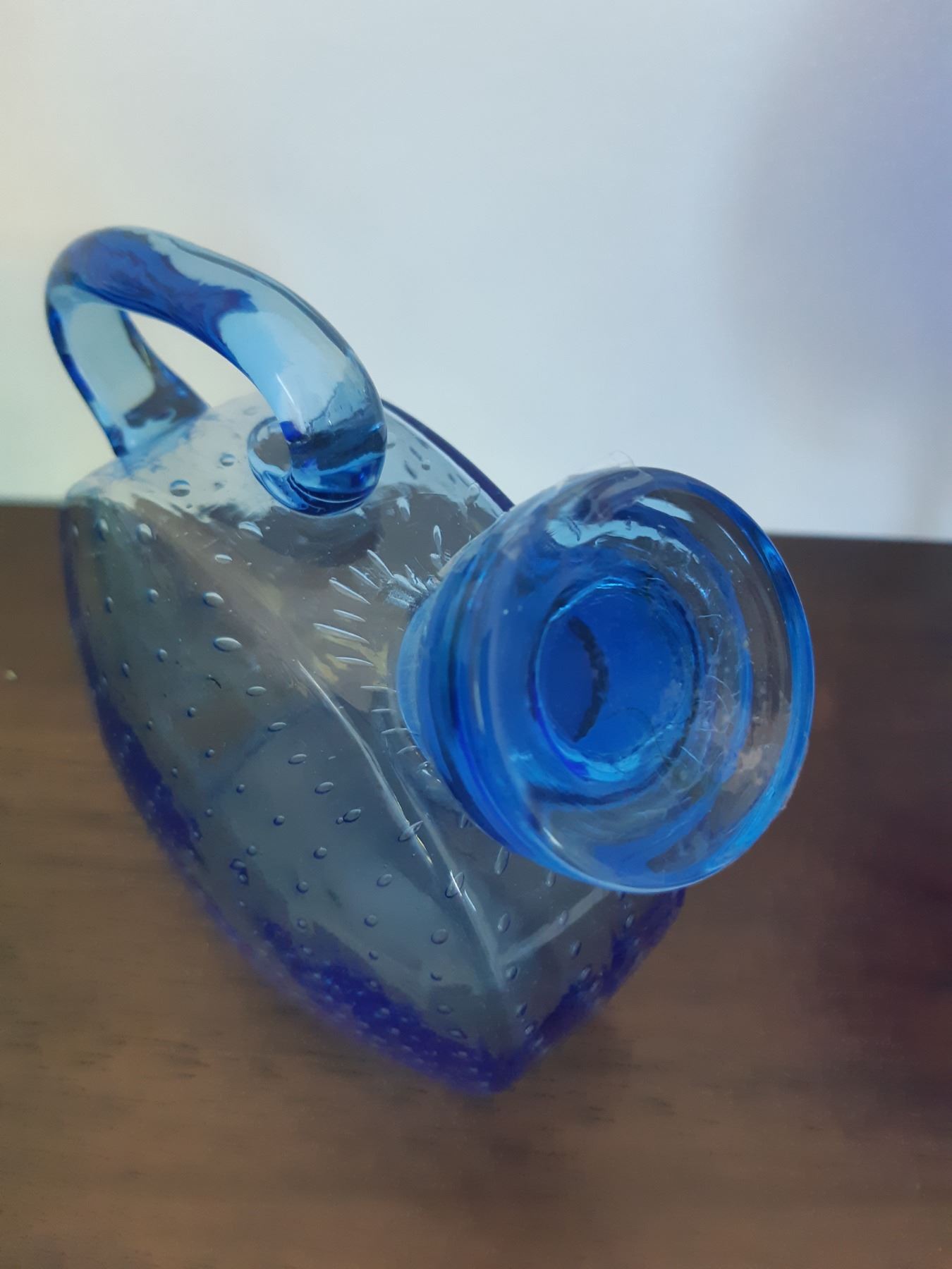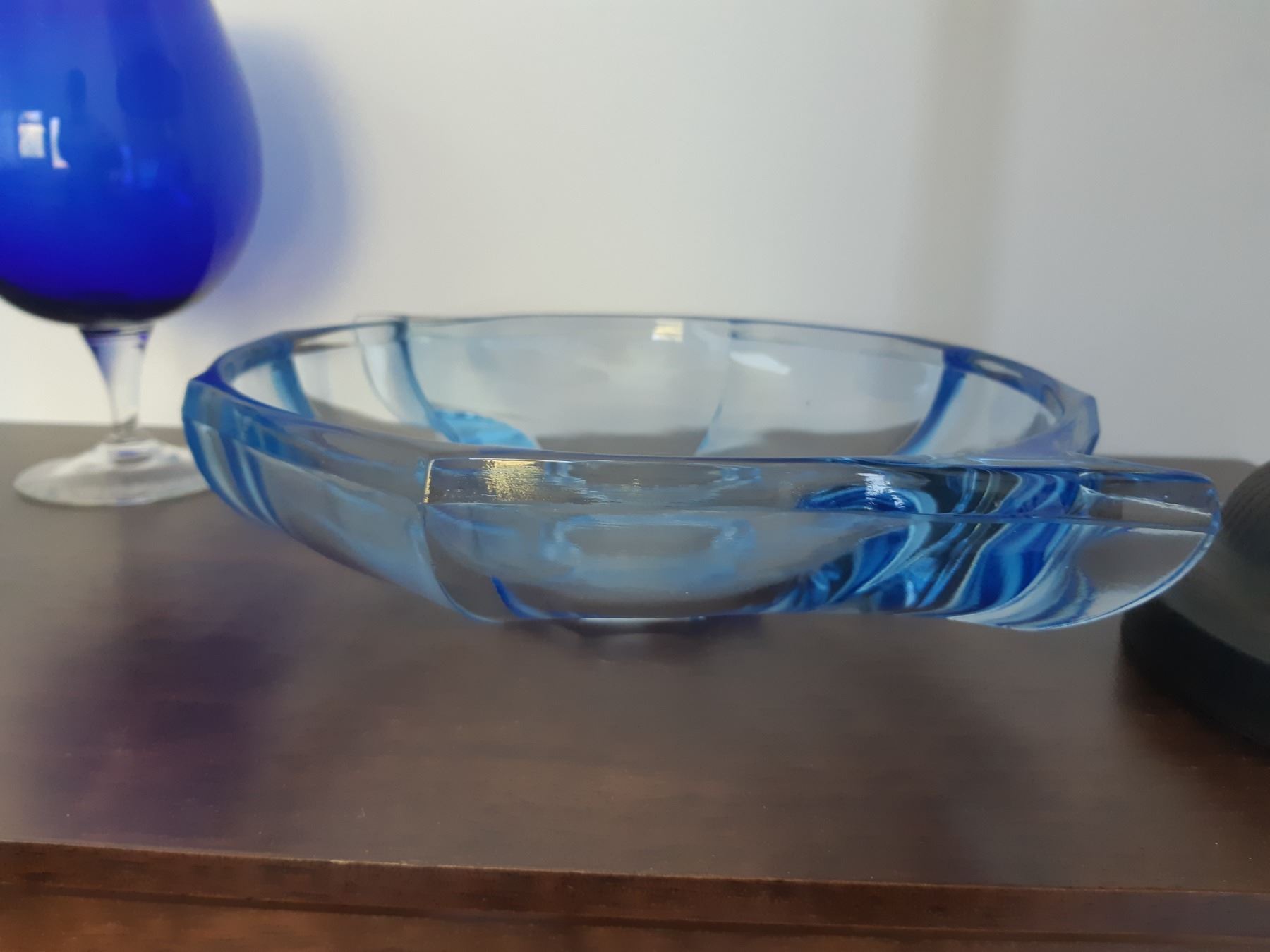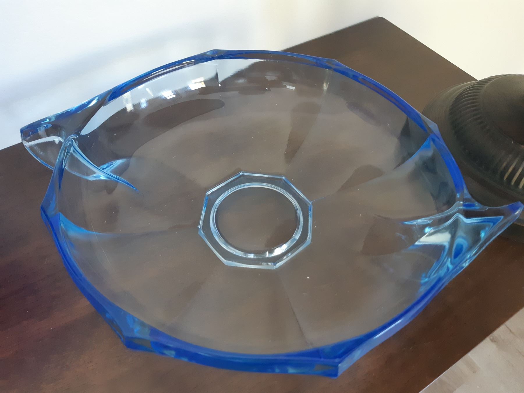 Glass Bowl 11x11x4, glass jug with stopper, Footed dish, darker blue blue dish 12x9x3 and Brandy Sniffer. Bring packing material and pickup at 9 am