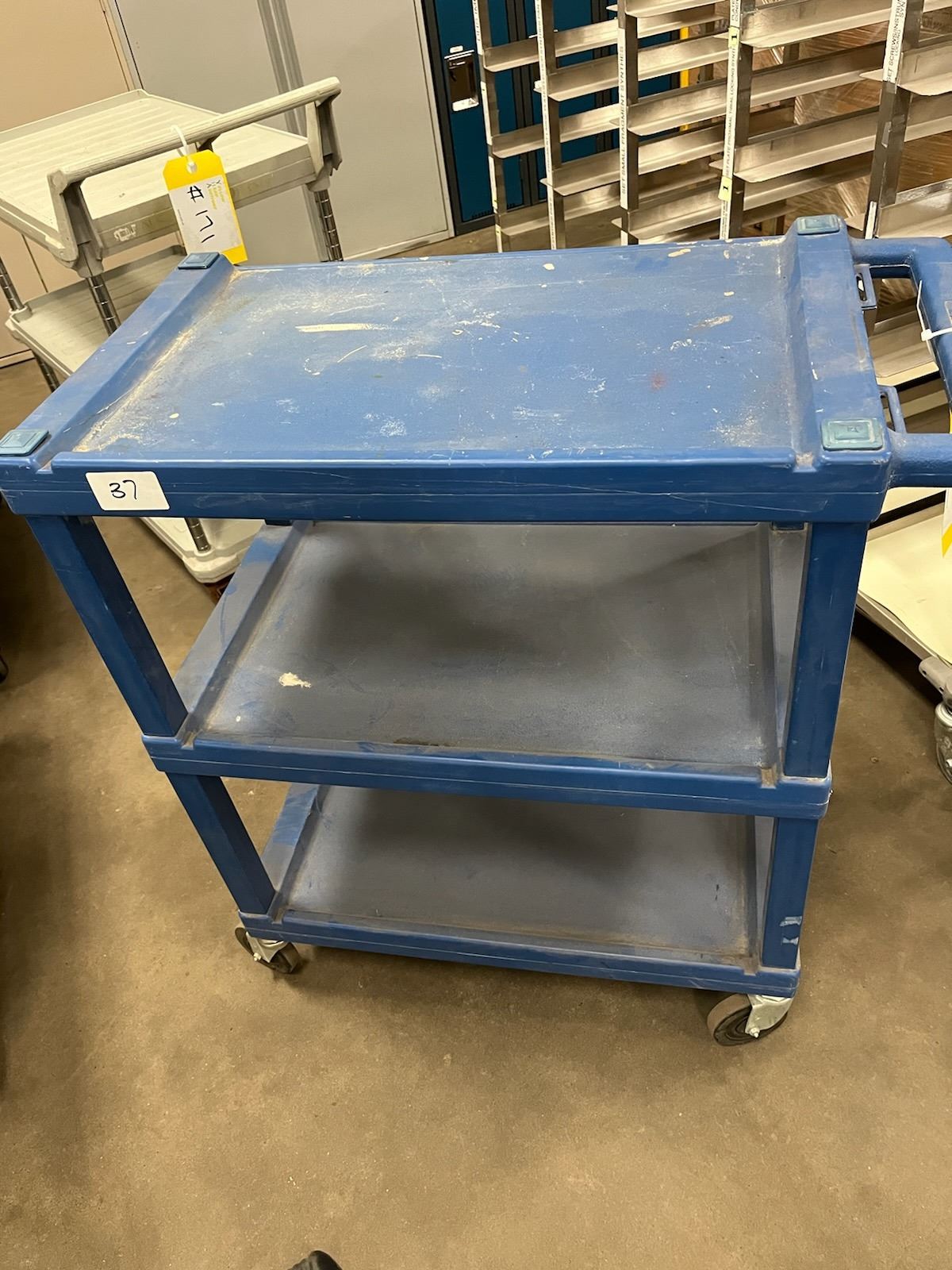 Blue Plastic Cart On Wheels, 39"l 36"w 33"h...used