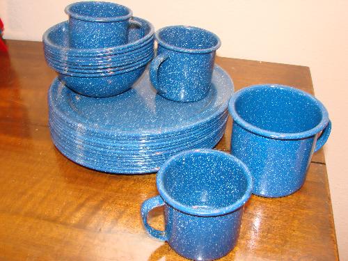 Blue & white enamel cups, plates & bowls, includes 13 dinner plates