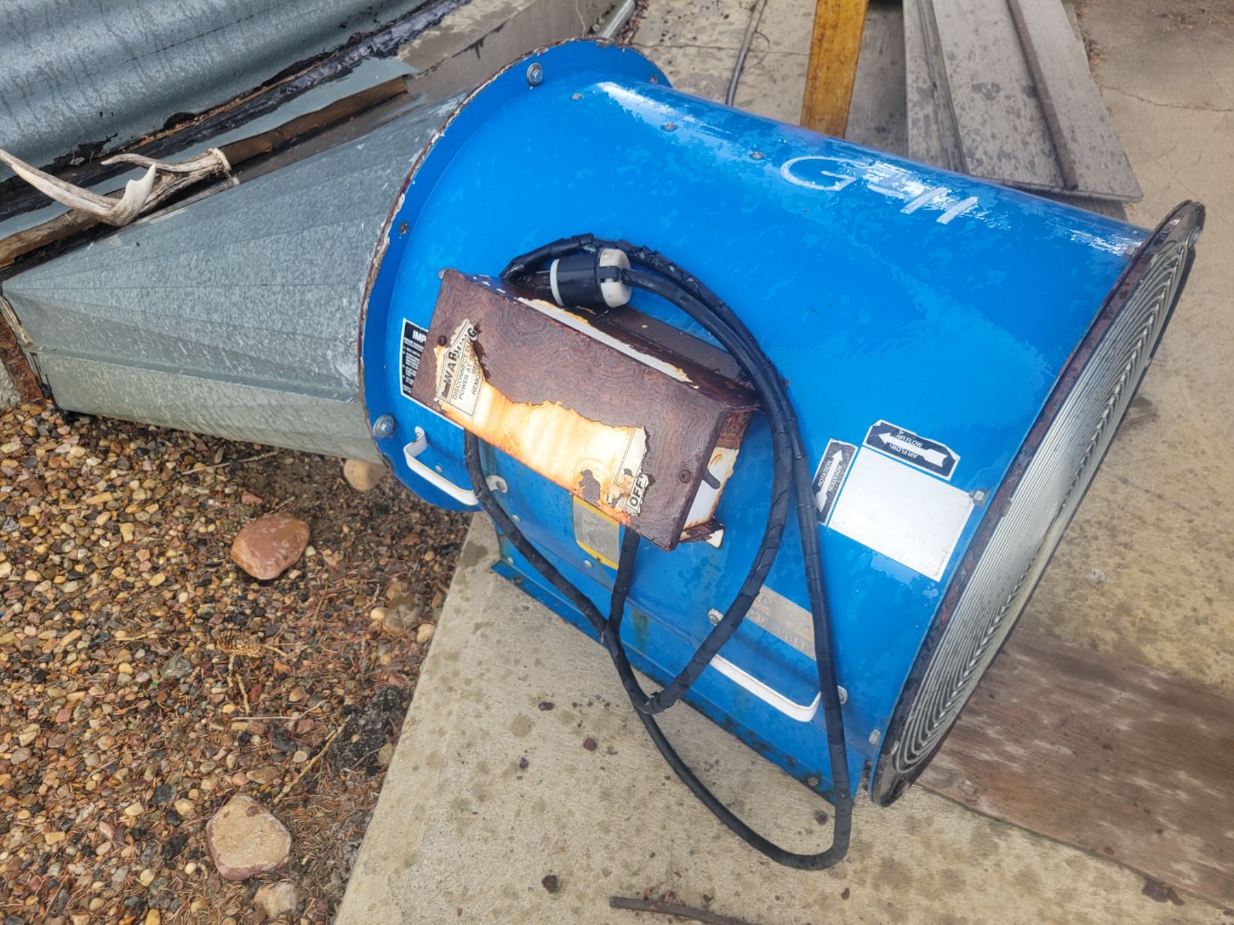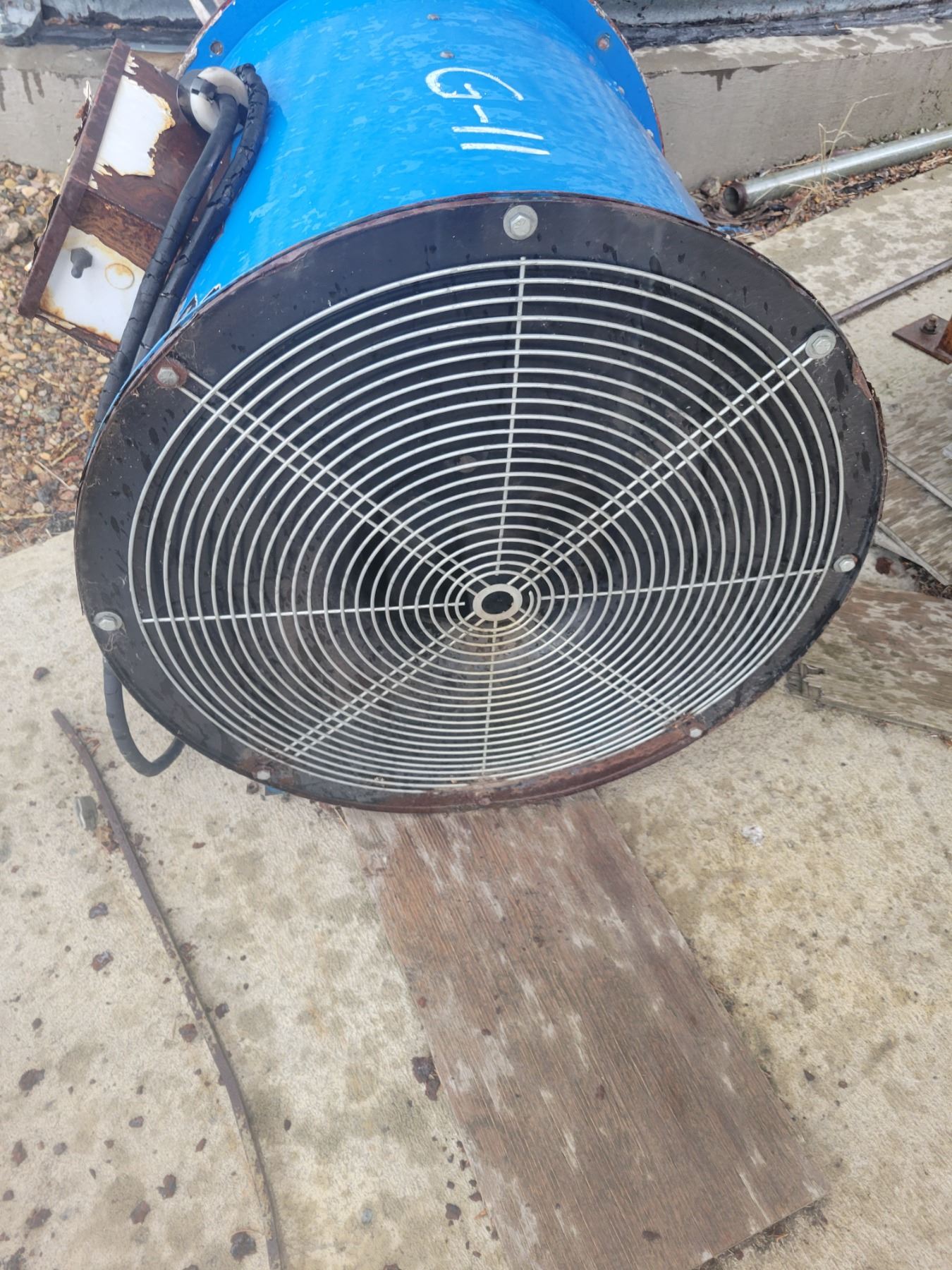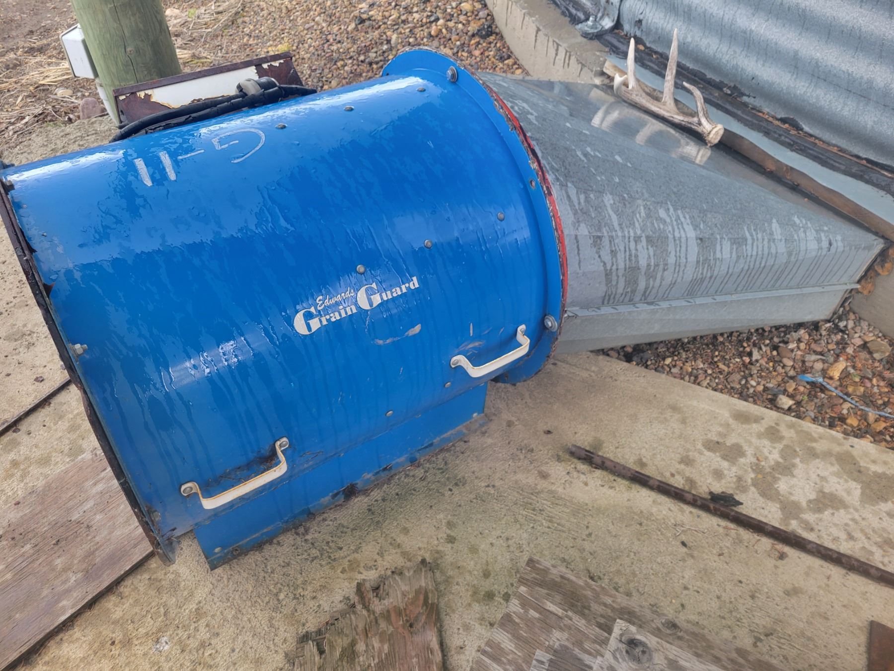 Blue aeration fan, approx. 5 Hp (mounted on Bin Lot 190) Absolutely NO REMOVAL Between July 31st to Aug 4th, PH: Conrad (780) 818-6179