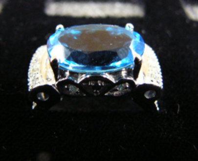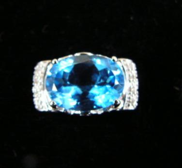 Blue topaz and diamond lady's rings, 14K white gold, topaz: oval faceted, approx 4 carats, clarity transparent, color medium blue, accent diamond, full cut, approx. .50 carats, clarity SI3, color H-I, estimated retail value $3170 (12)
