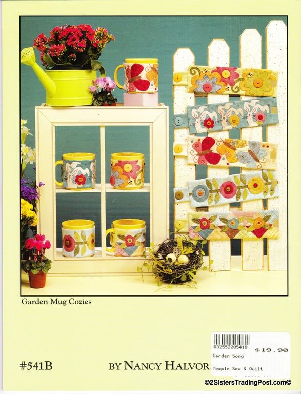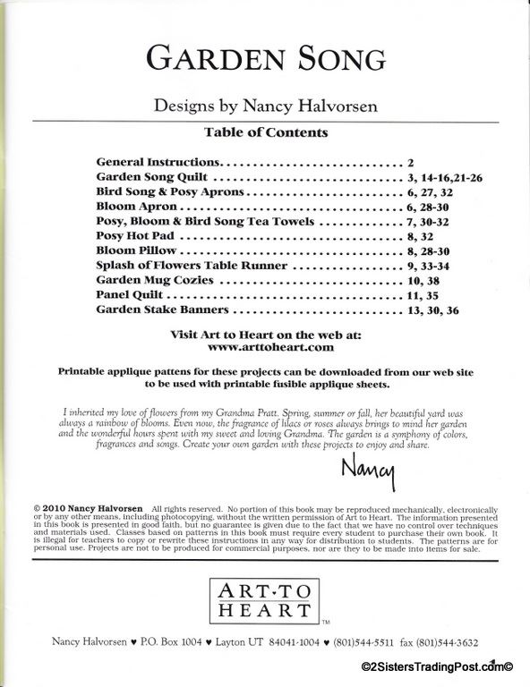 Soft cover book 'Garden Song' designs by Nancy Halvorsen for Art-To Heart. This is a 36 page book with quilt, aprons, tea towels, hot pad, pillow, table runner, mug cozies & banner patterns. Book is in like new condition MSRP $18.00