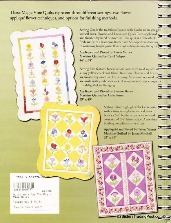 Spiral bound book ''Quilt in a Day The Magic Vine Quilt' by Eleanor Burns. 230 Page book contains 22 different flower patterns with instructions for quilts, wall-hangings, pillow shams, and the book is loaded with help full hits. Book is in very good condition. SRP $27.95