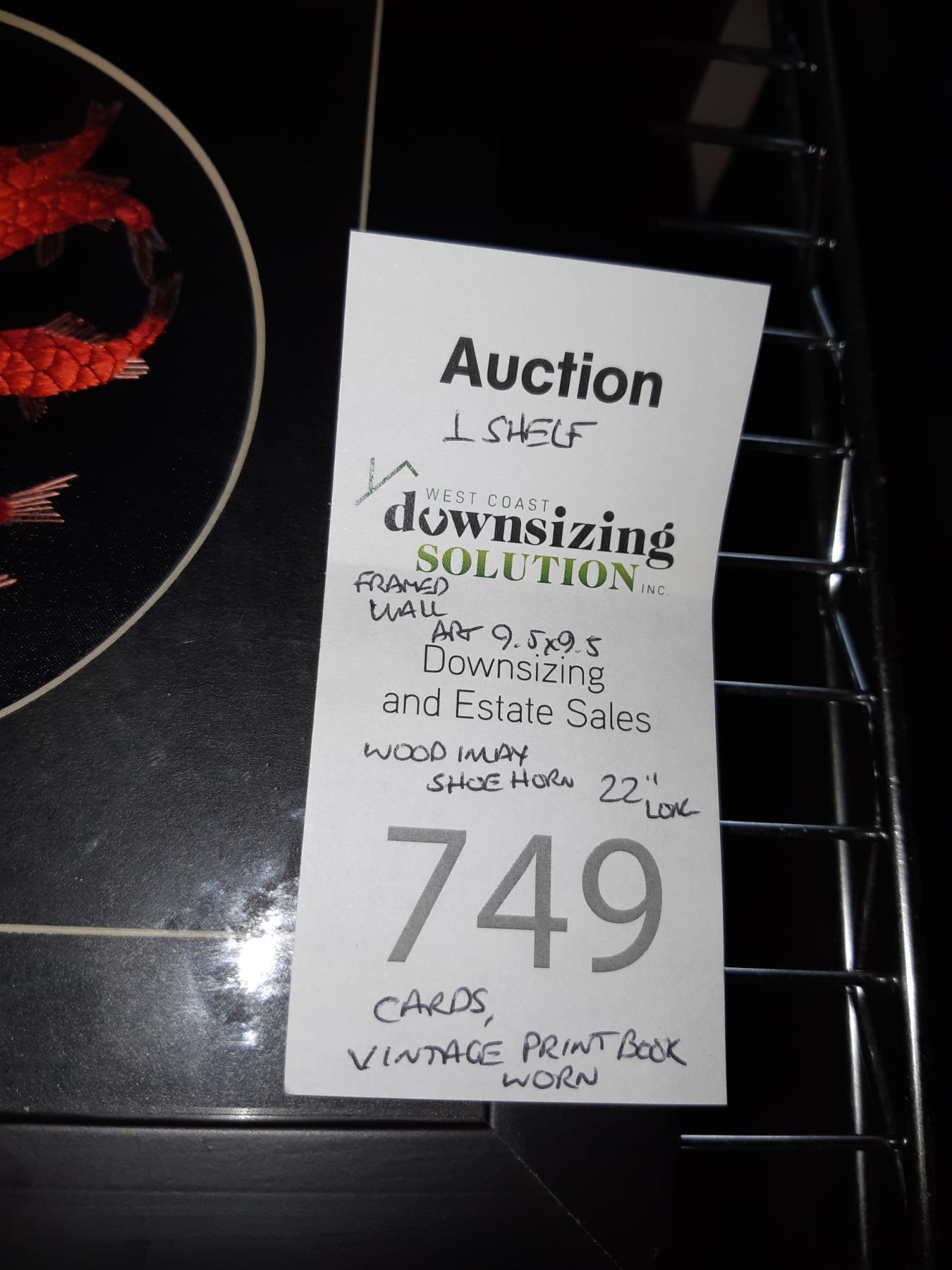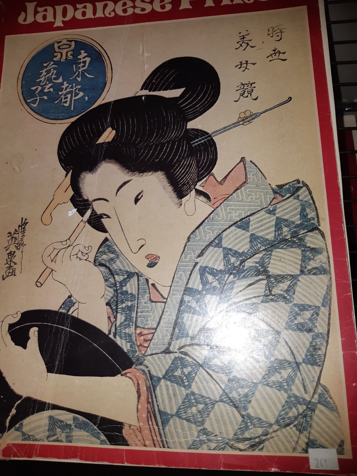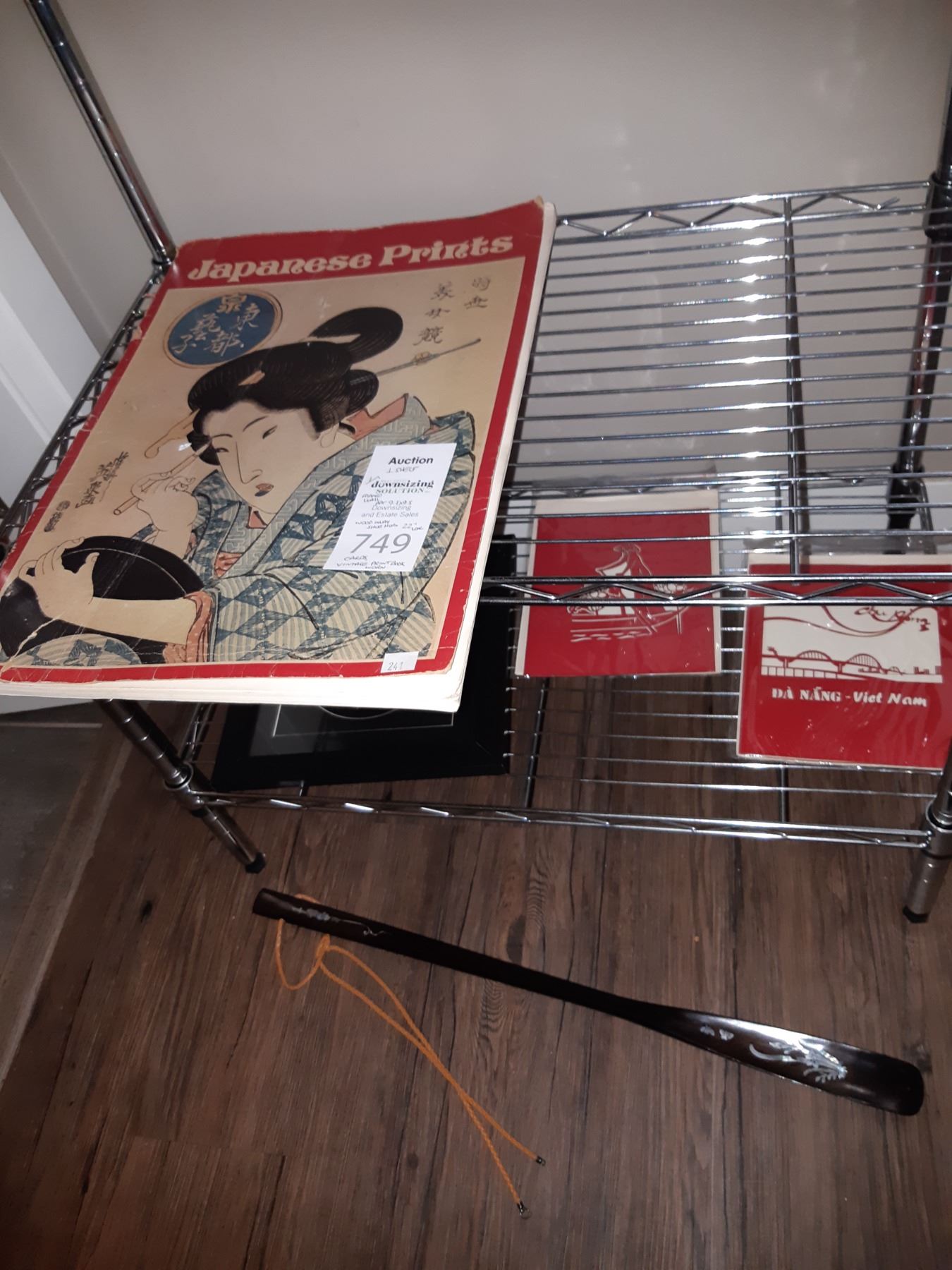 Vintage Japanese prints, cover detached, framed needlepoint 9x9, shoe horn, pickup 9am