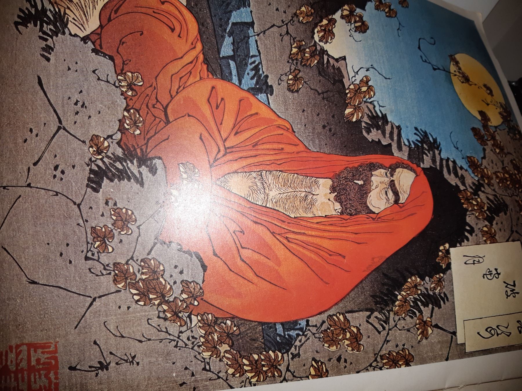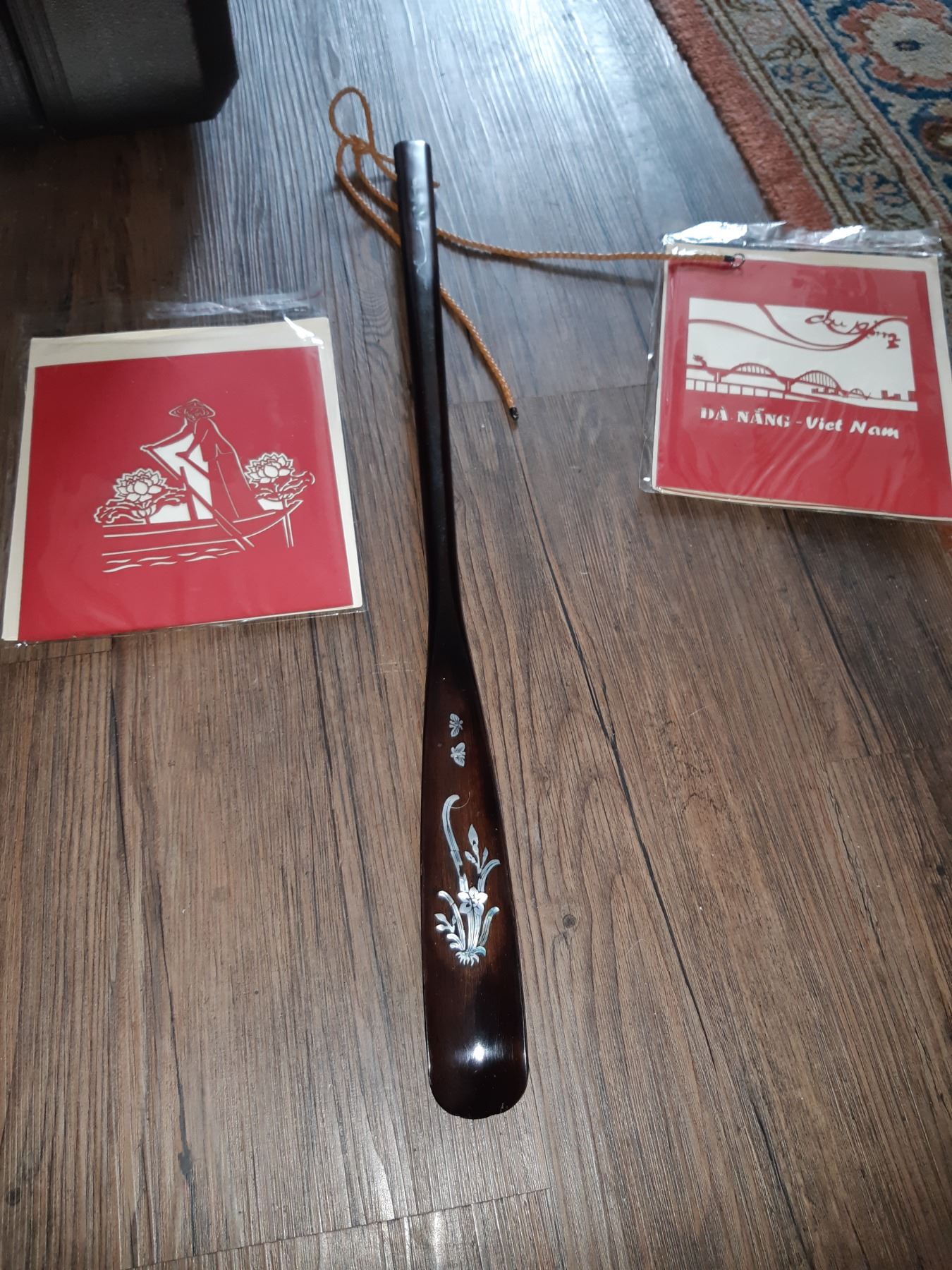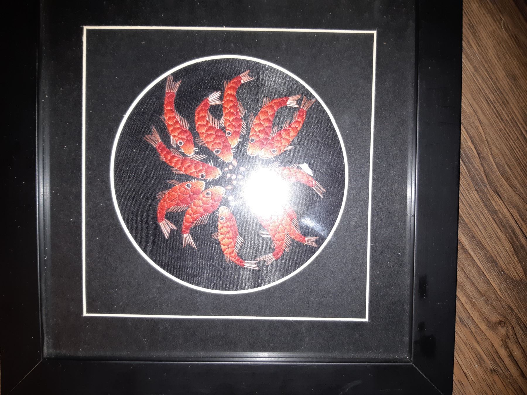 Vintage Japanese prints, cover detached, framed needlepoint 9x9, shoe horn, pickup 9am