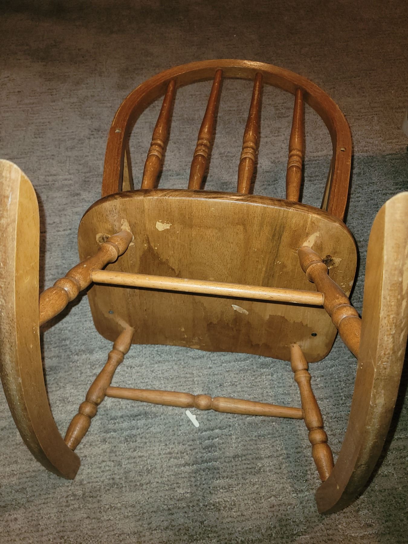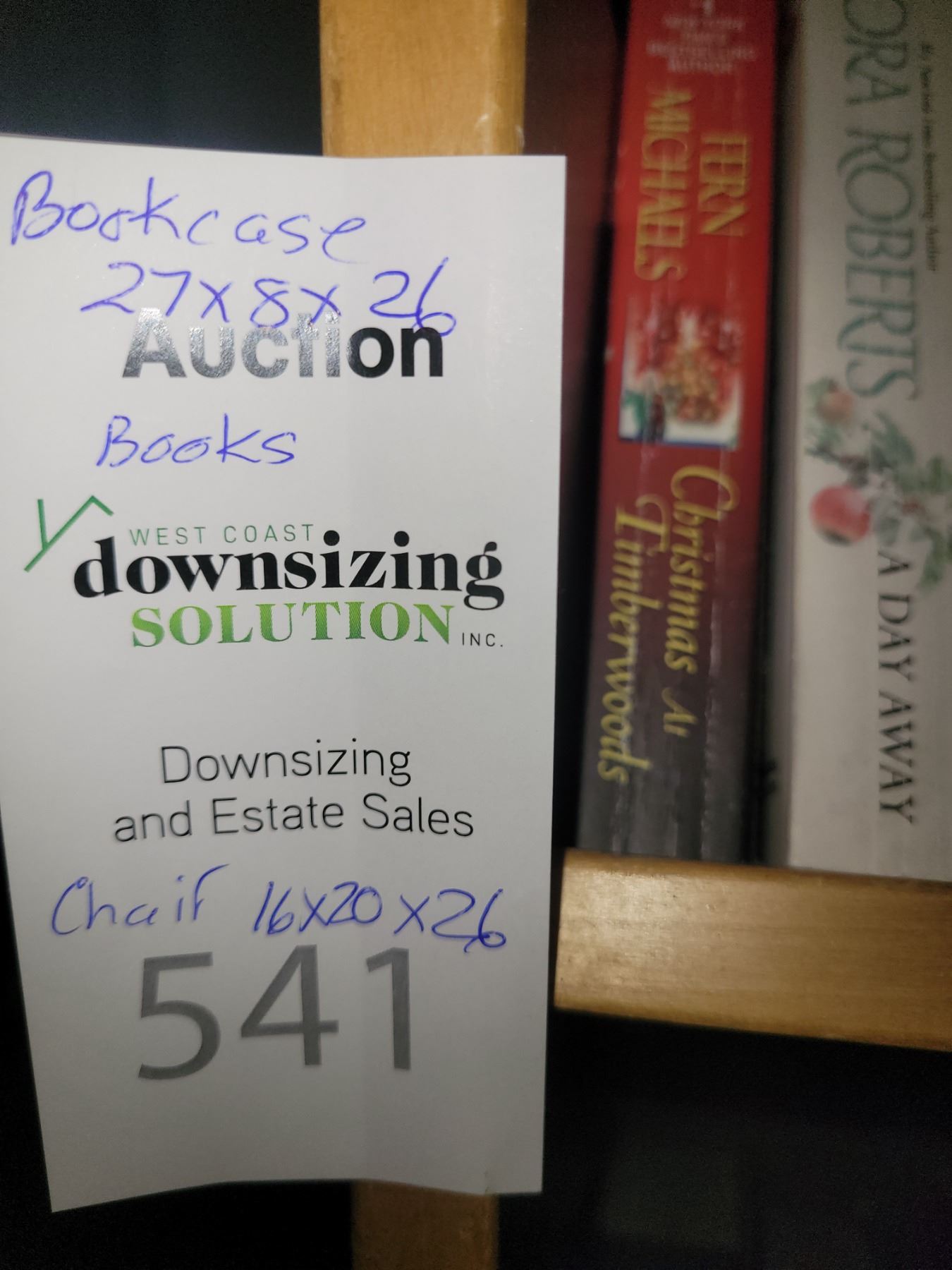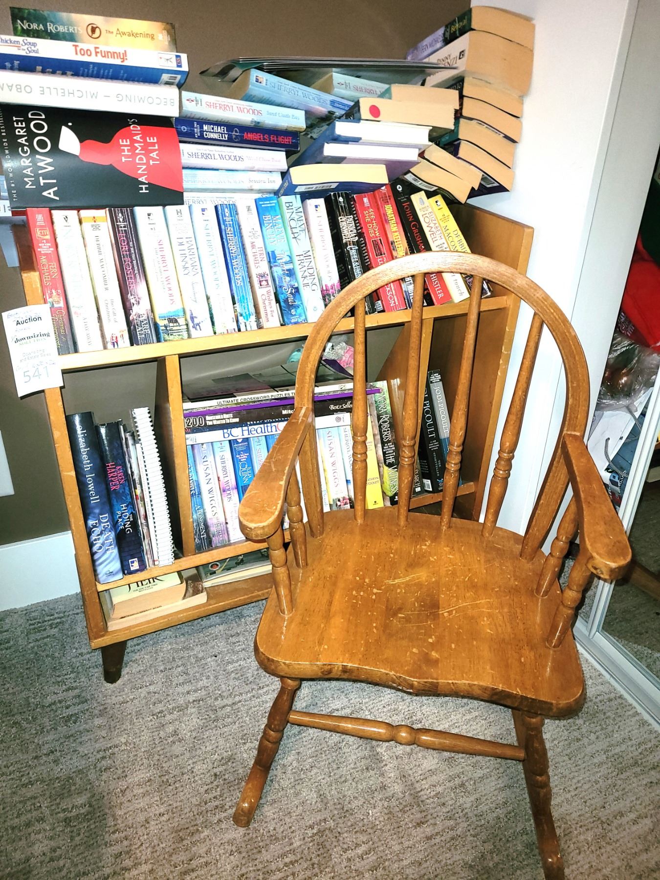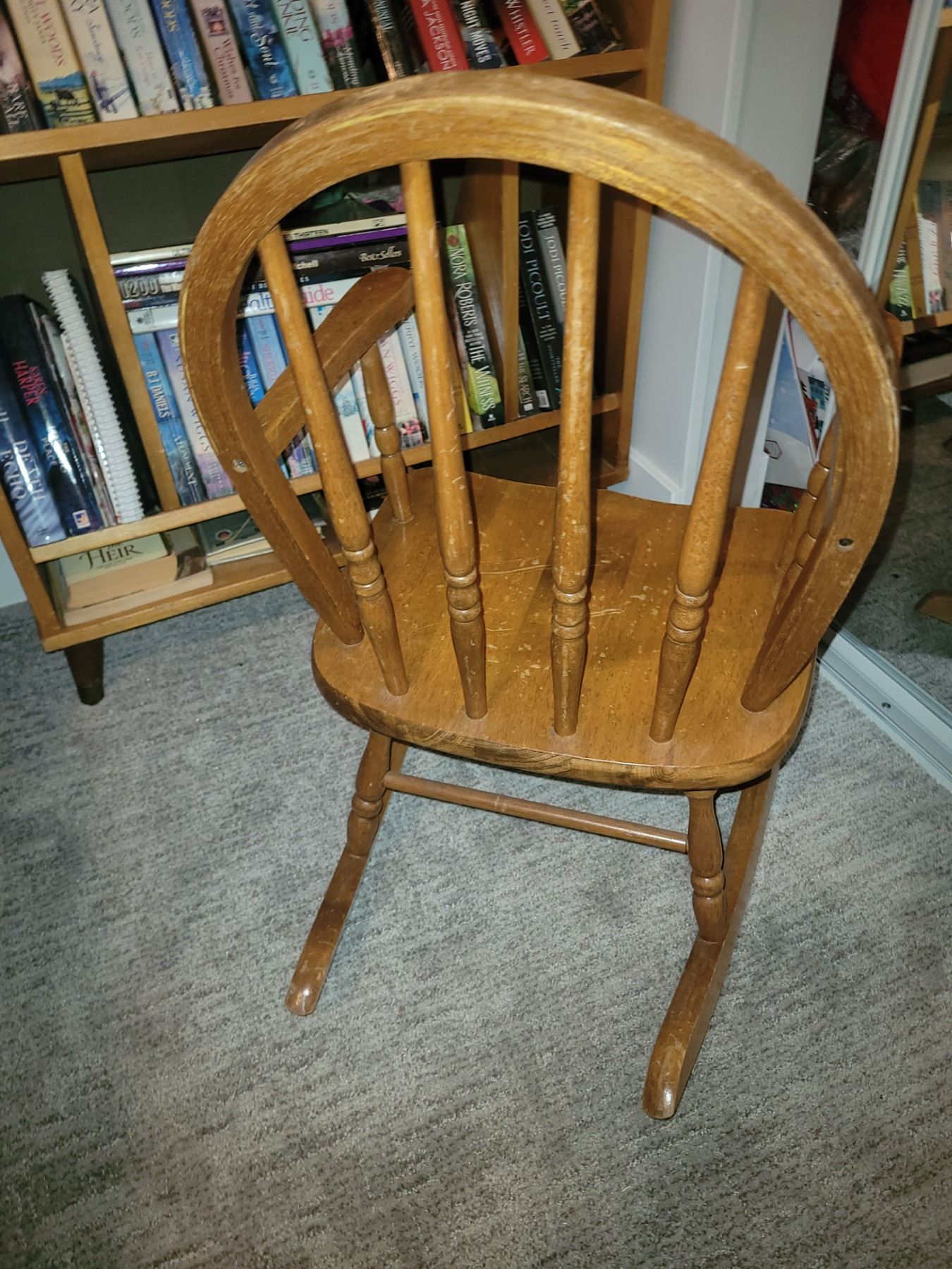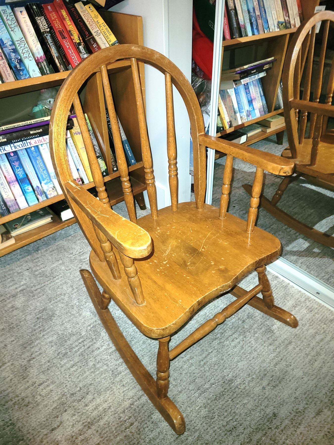 Wood bookcase & books 27x8x26, assortment of books. Childs size rocking chair. Pickup at 11 am