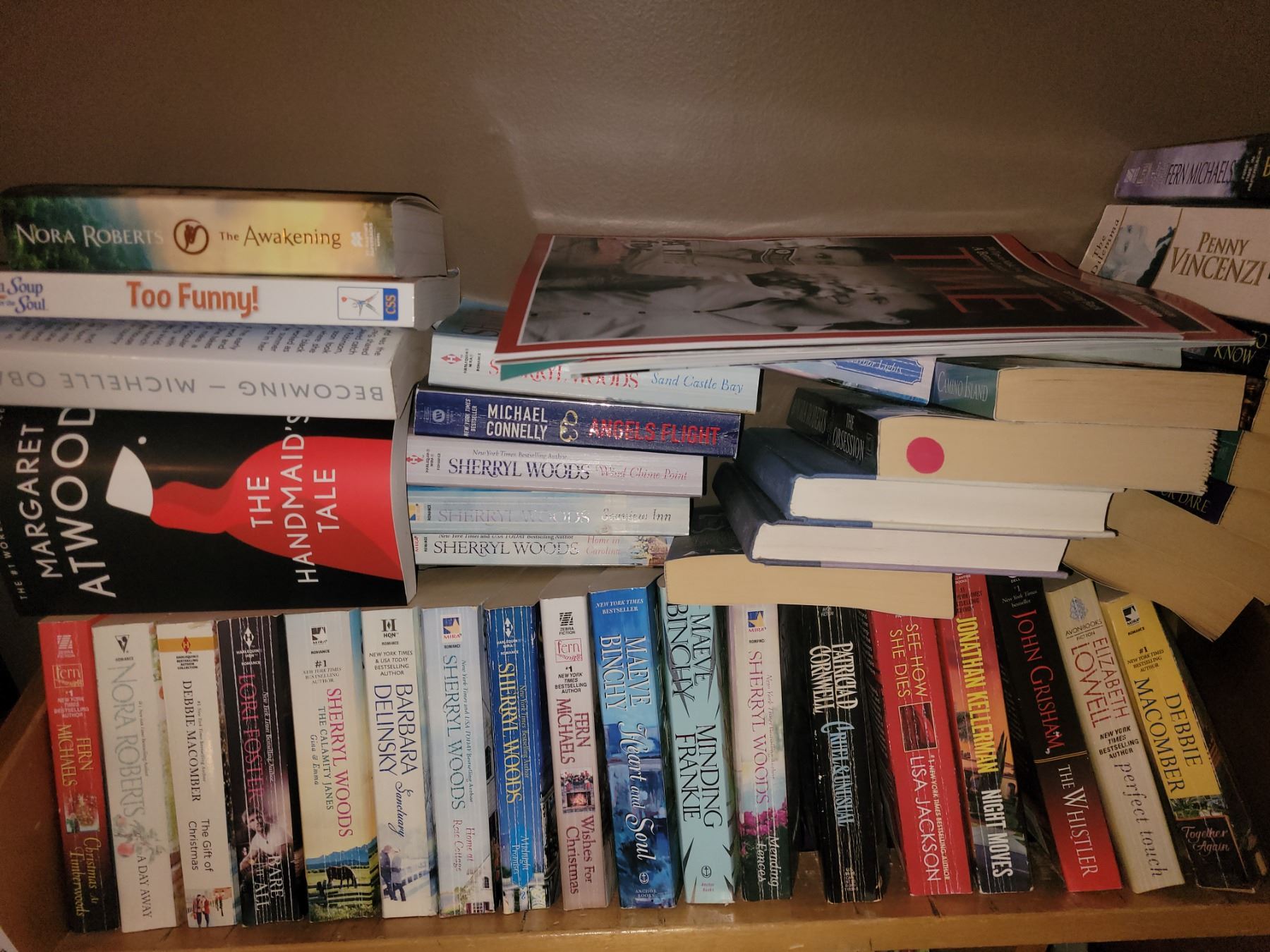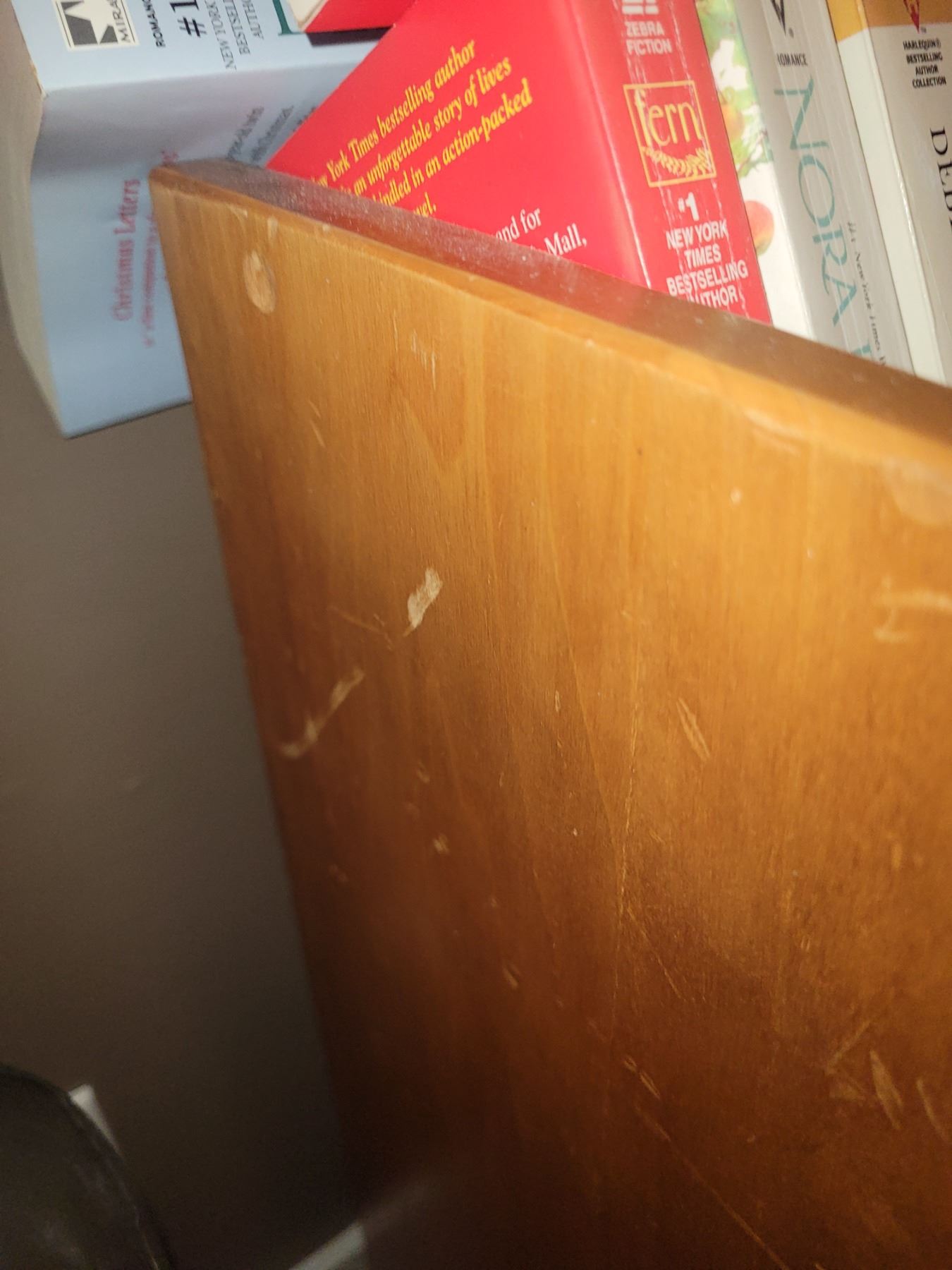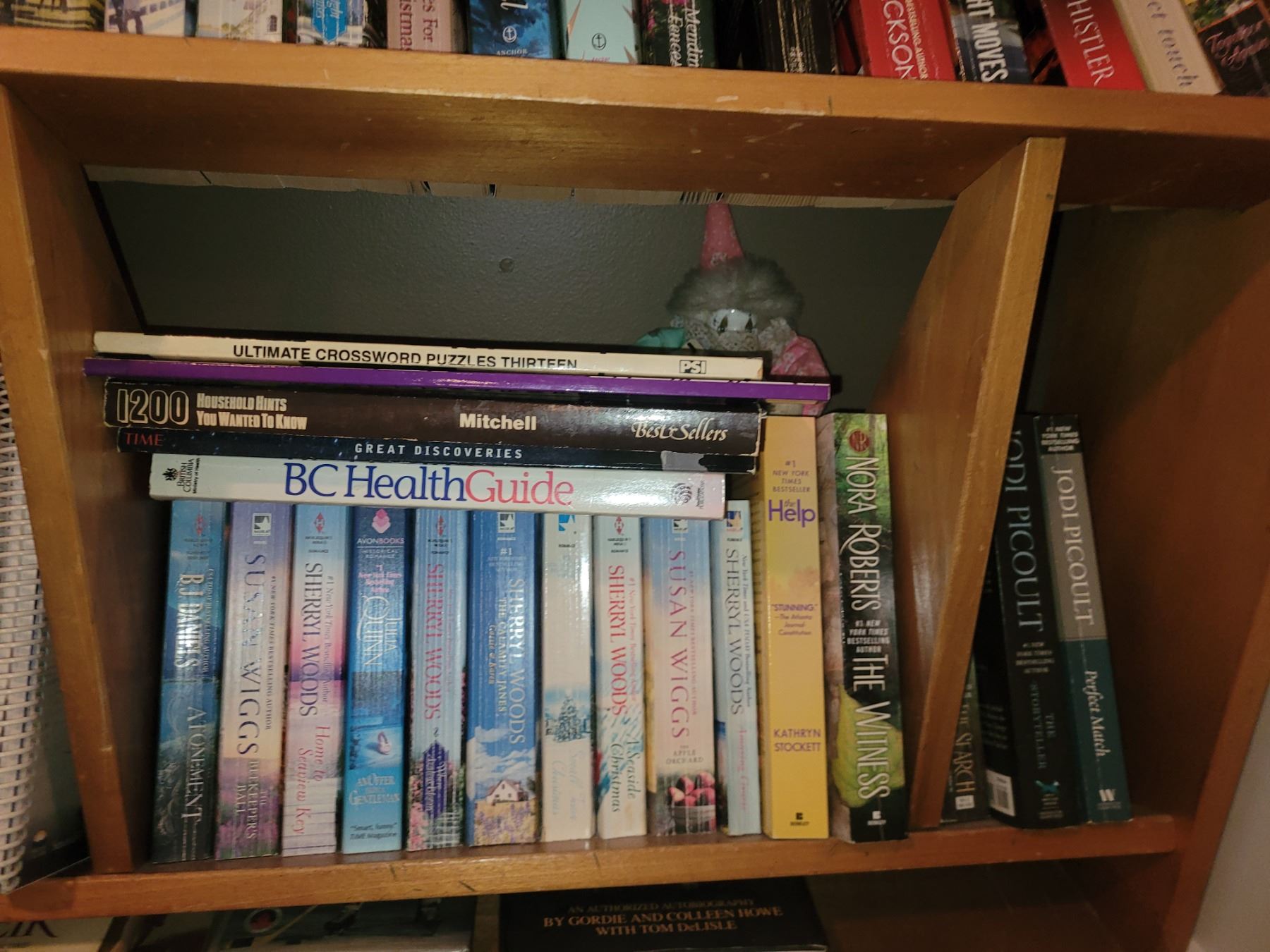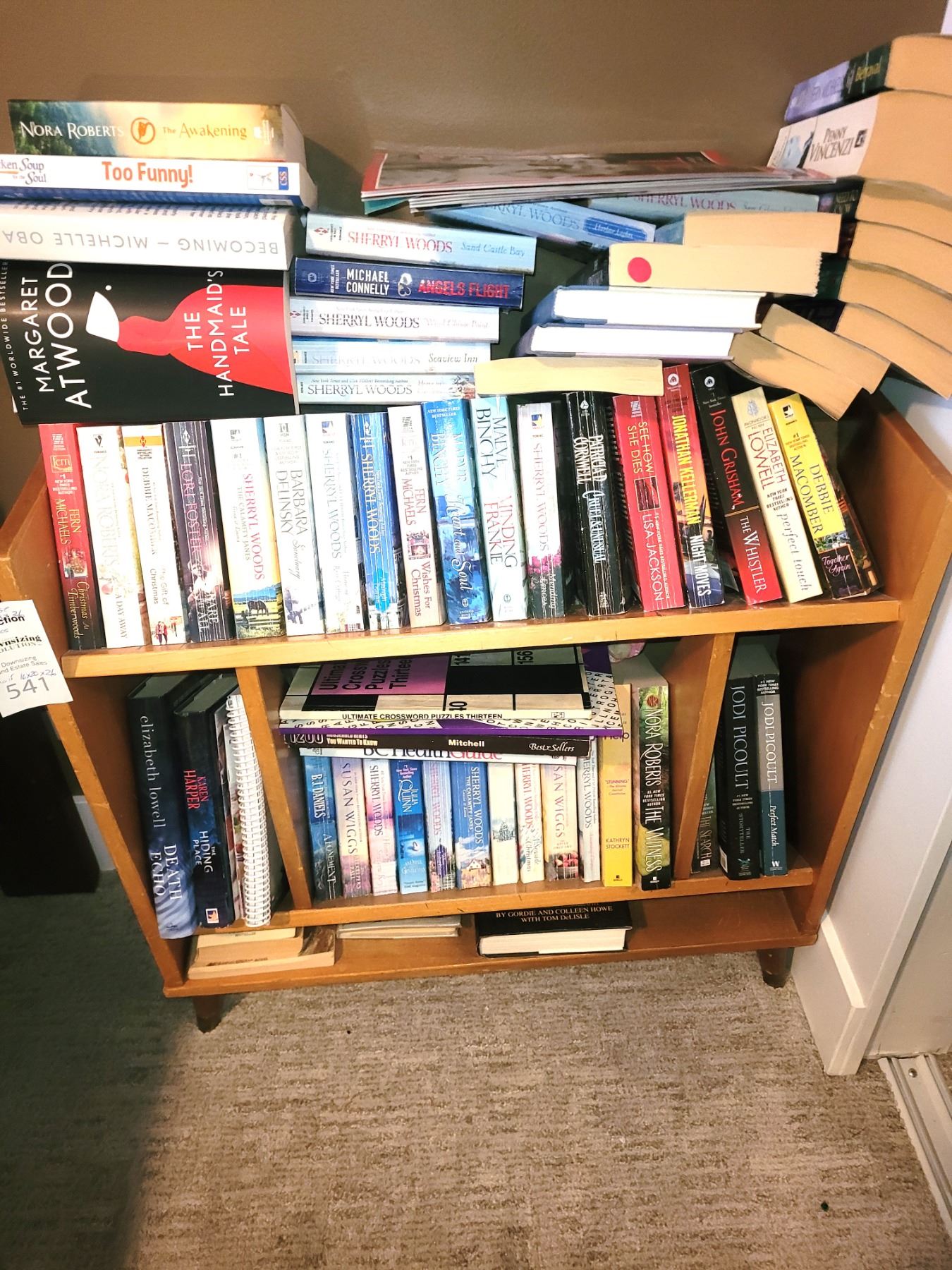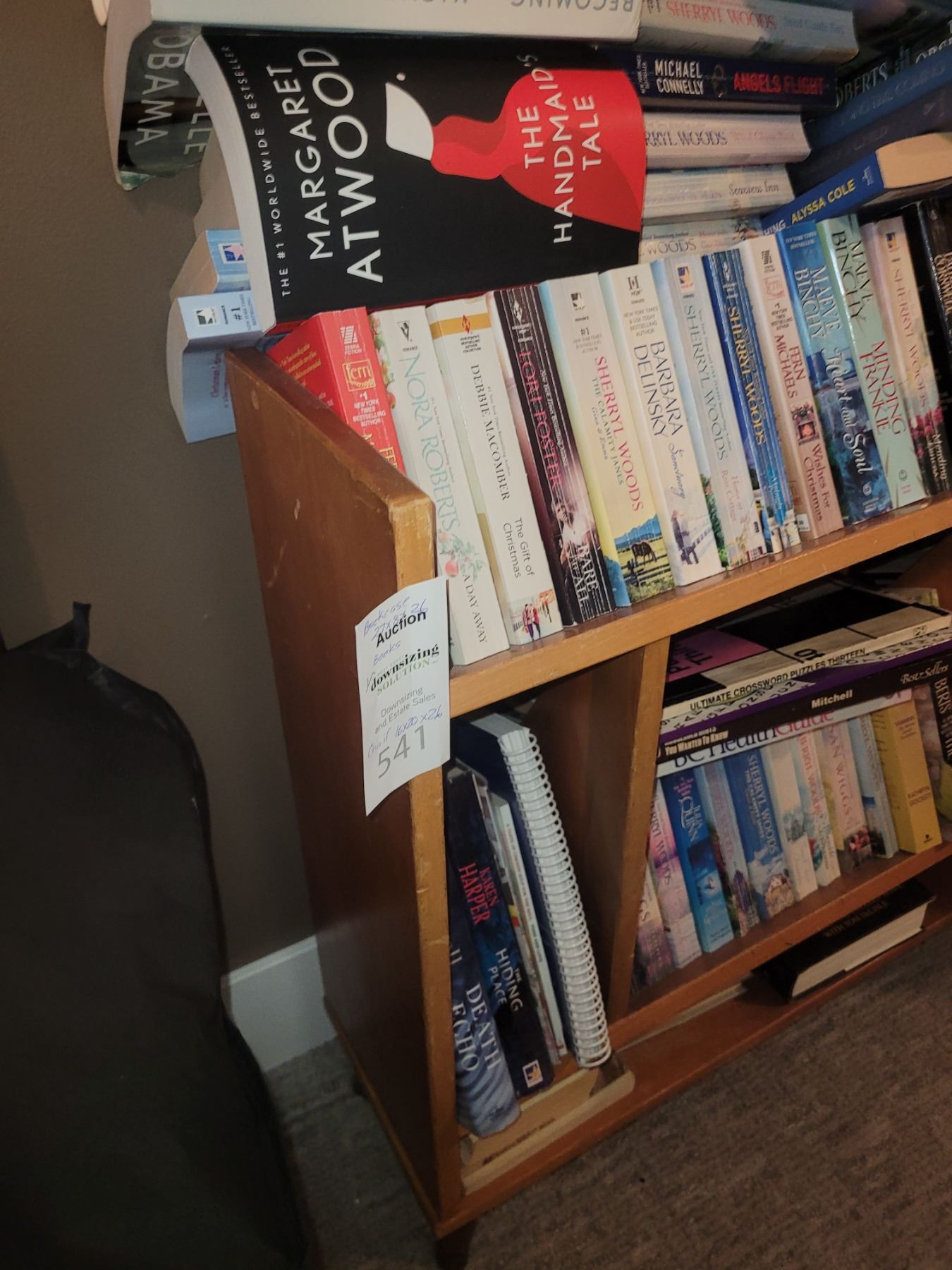 Wood bookcase & books 27x8x26, assortment of books. Childs size rocking chair. Pickup at 11 am