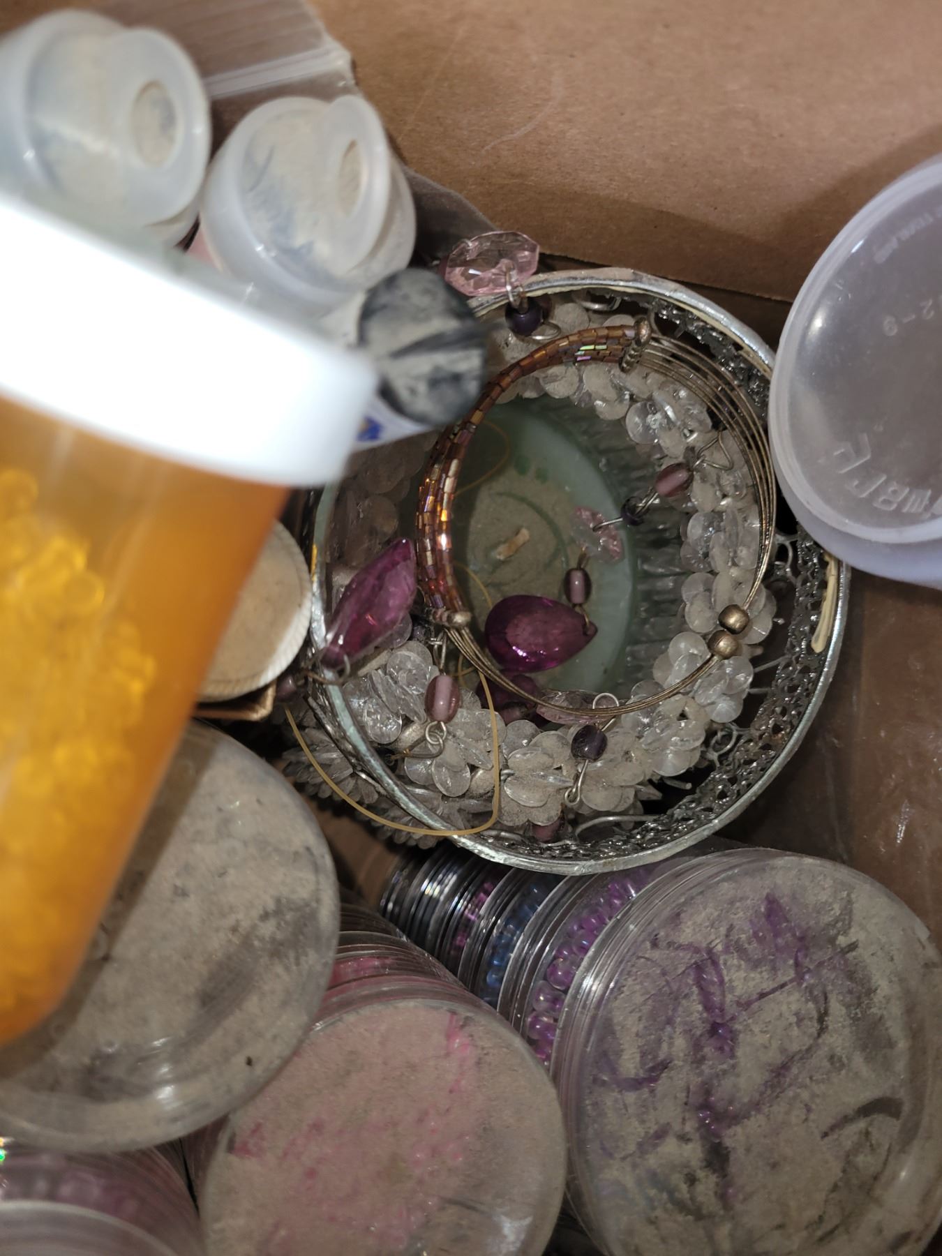 Box full of containers of beads for jewelry making and other crafts. SC2 Pickup a 9 am