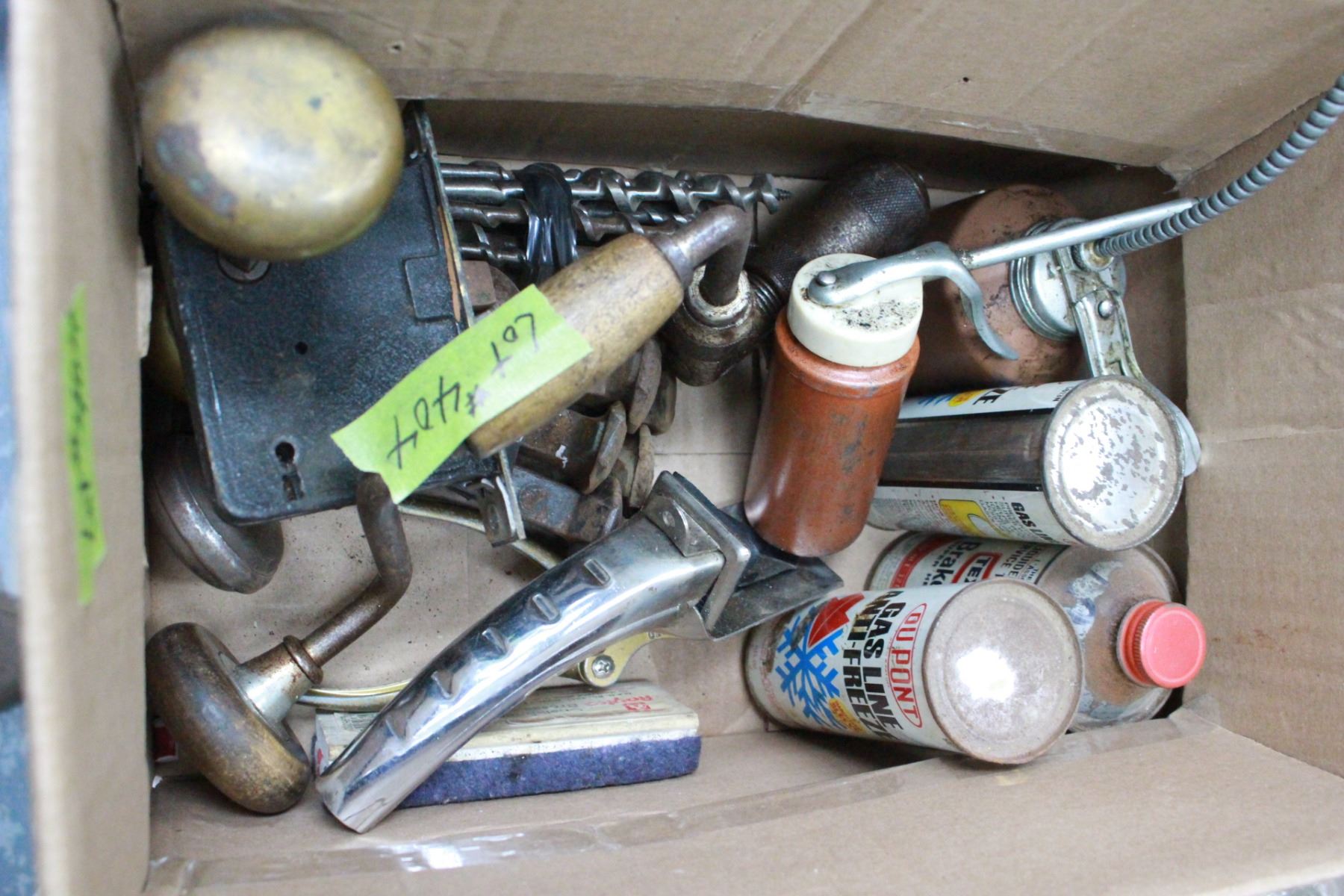Door Knobs (2 sets); Brace; 2 Oil Cans, 2 Anti-freeze; Texaco Tin, Bits; Railroad Spikes; Saw Set & a Brush