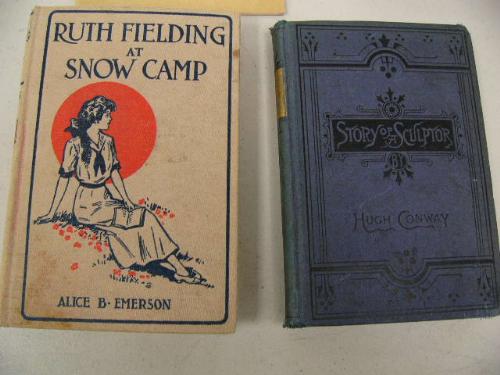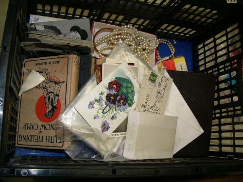 Box of: books; costume jewelry; old movie star postcards and stamps; old radio; set of wood checkers; cellulite bracelet (16)