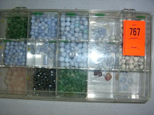 Box of semi-precious stone beads. Chips, carved & 8mm-10mm round.