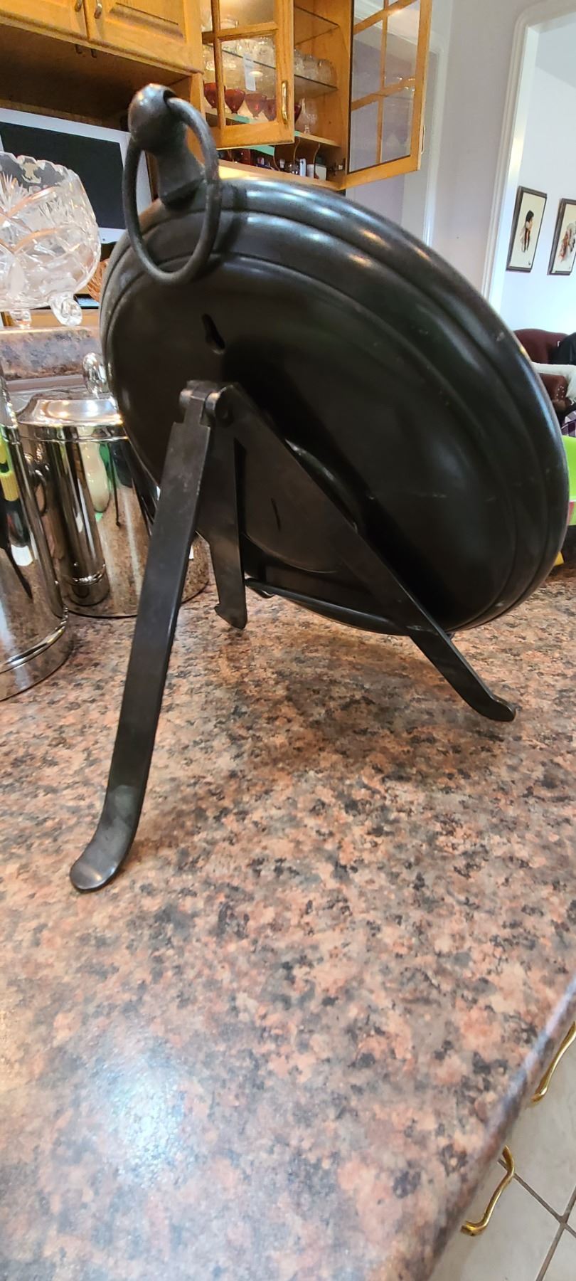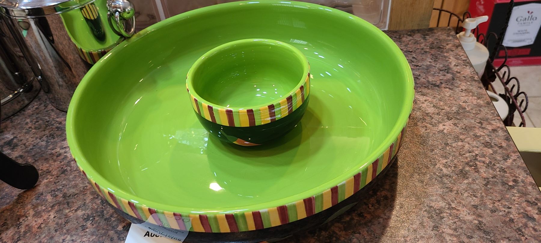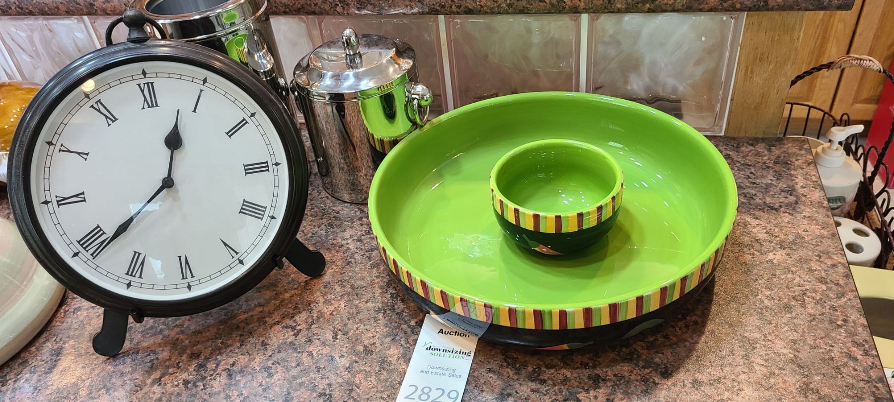 Brass, battery operated clock, quite heavy 10". Wine cooler and ice bucket. Crate & Barrel ceramic veggie & dip server. Pickup at 9 am
