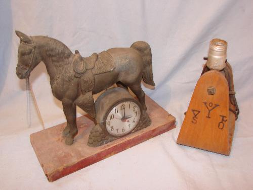 Brass horse clock, stirrup lamp base (cond. Unknown)