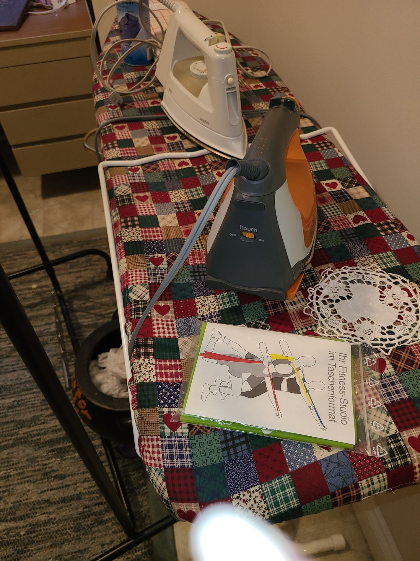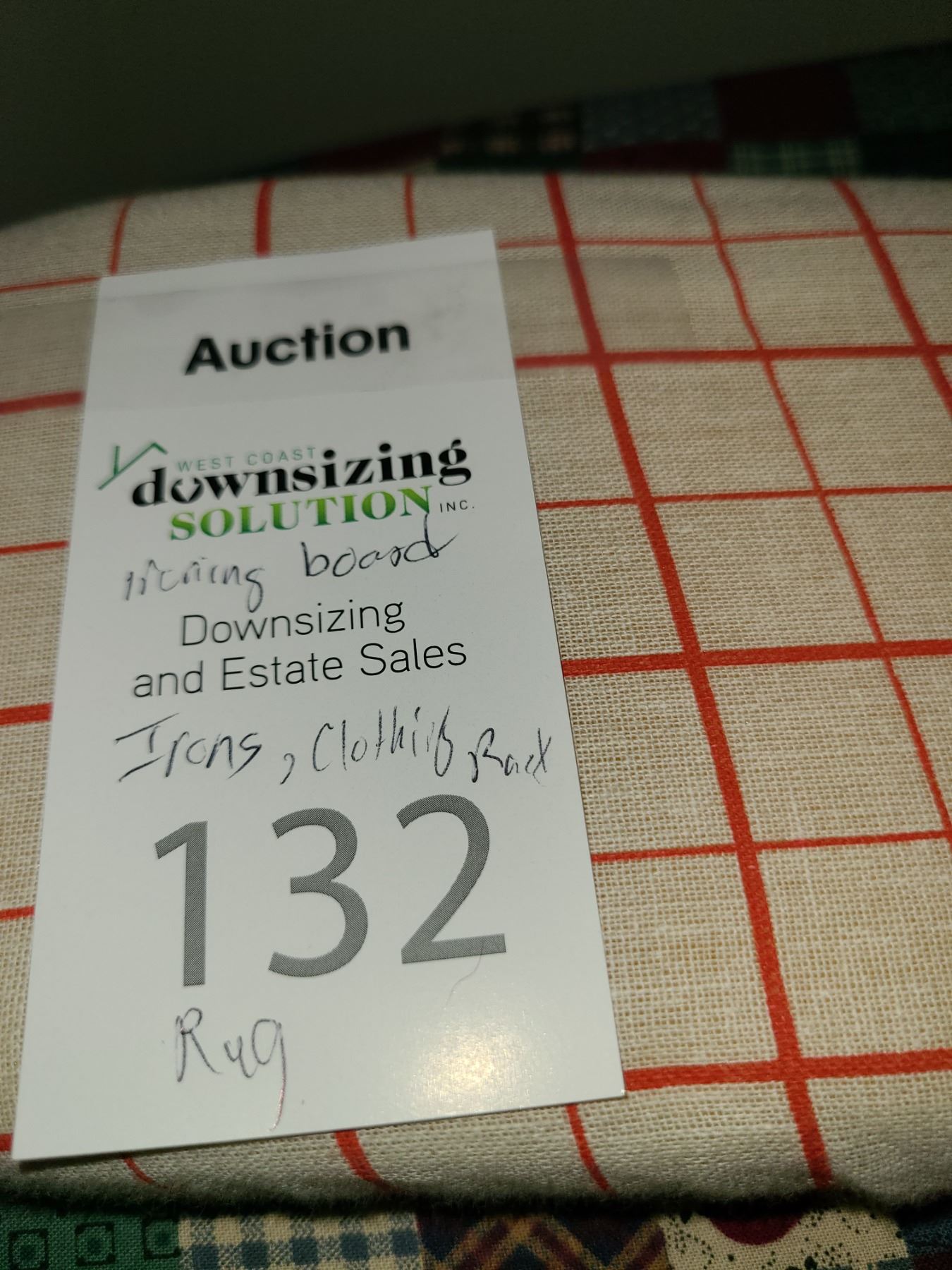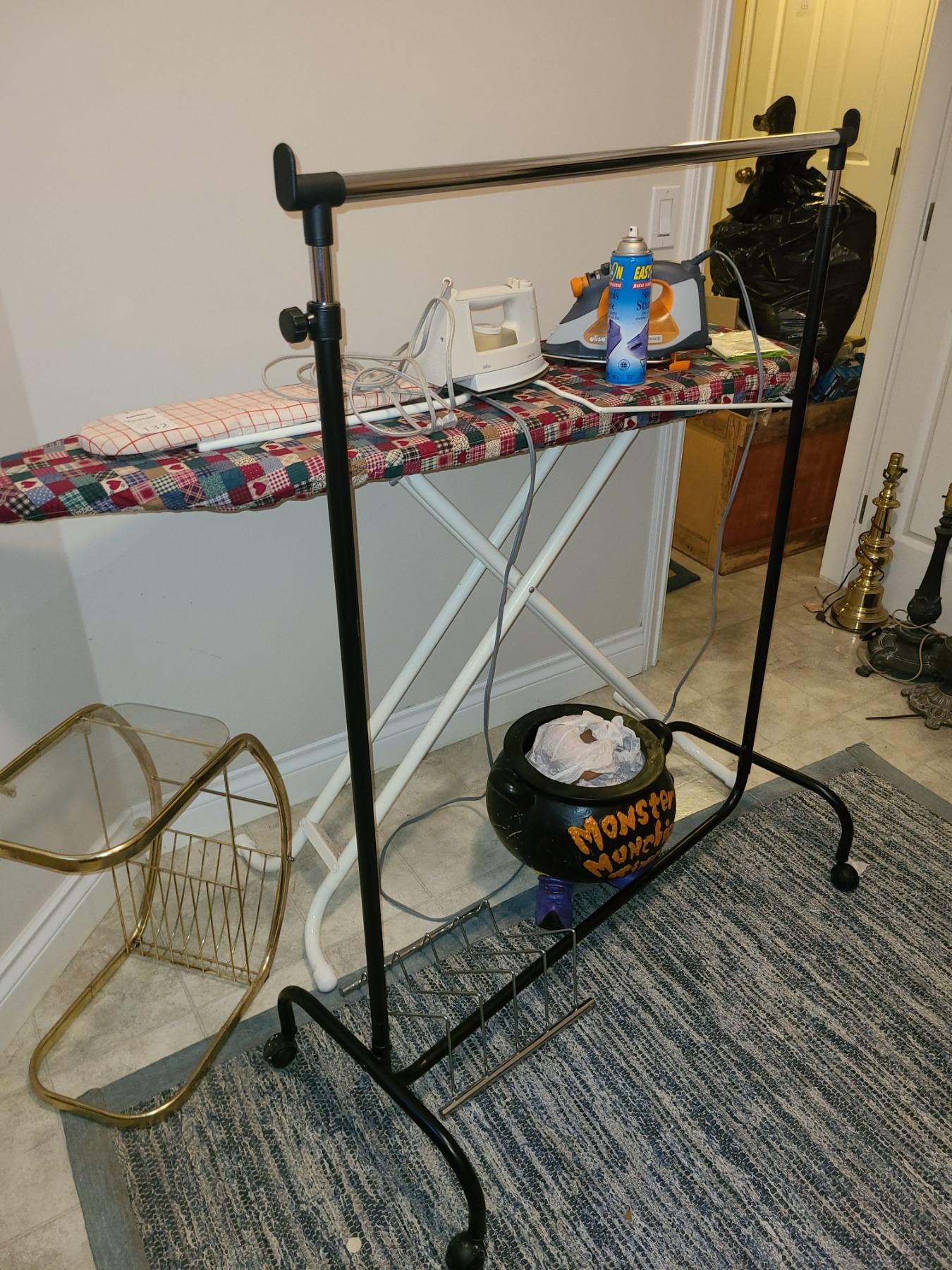 Ironing board, clothes rack & rug and more. 9 am