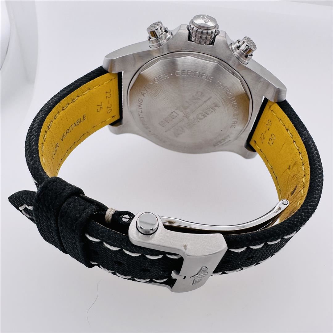 One Breitling Avenger Stainless Steel Chronograph Black Dial Wristwatch. This watch is in excellent condition. The watch photographed is the actual watch.