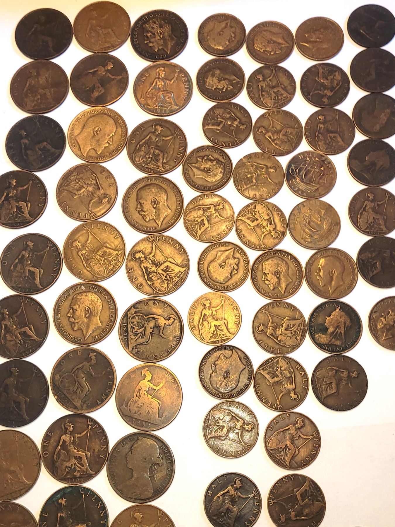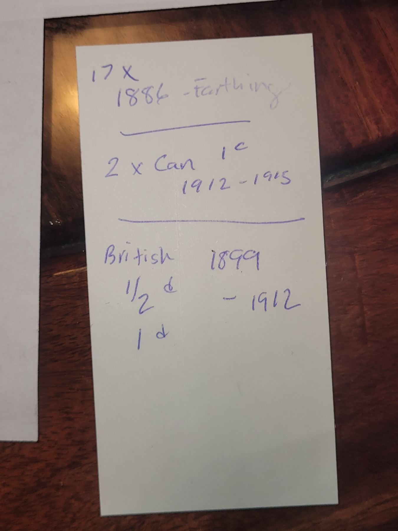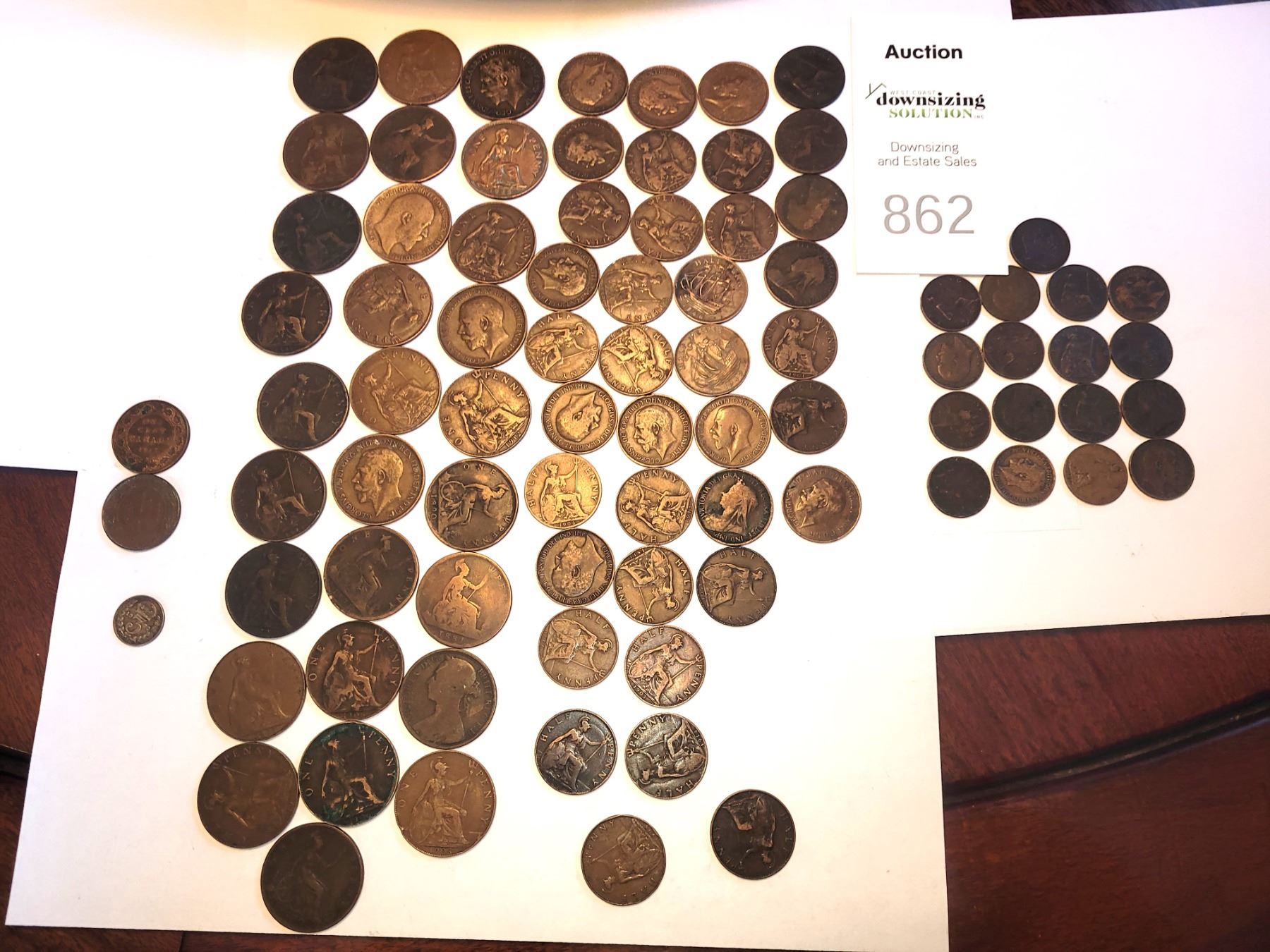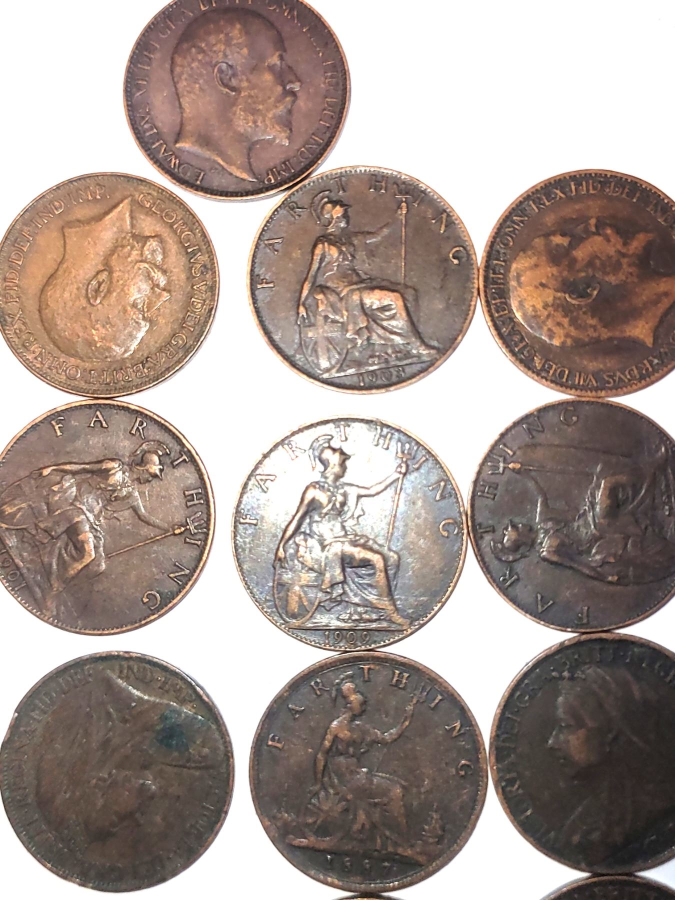 17 x 1/2 Farthings 1886, 1/2 penies, pennies 1899 - 1912. and 3pence. 2x 1 cent Canadian coins 1912 & 1919 Pickup at 9 am