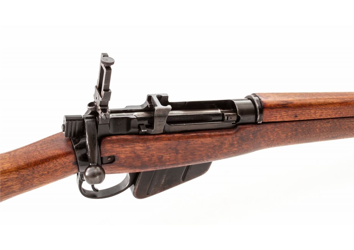 British No. 5 MK I Bolt Action Jungle Carbine, receiver additionally marked M/47C (1945), #BF7311, .303 cal., 19'' barrel, blue finish, English walnut stock. Condition is excellent retaining approx. 95% blue/black finish, stock with minor soiling. Top of barrel with English proofmarks. Crisp action, bright bore. Est.: $500-$750. (C&R)