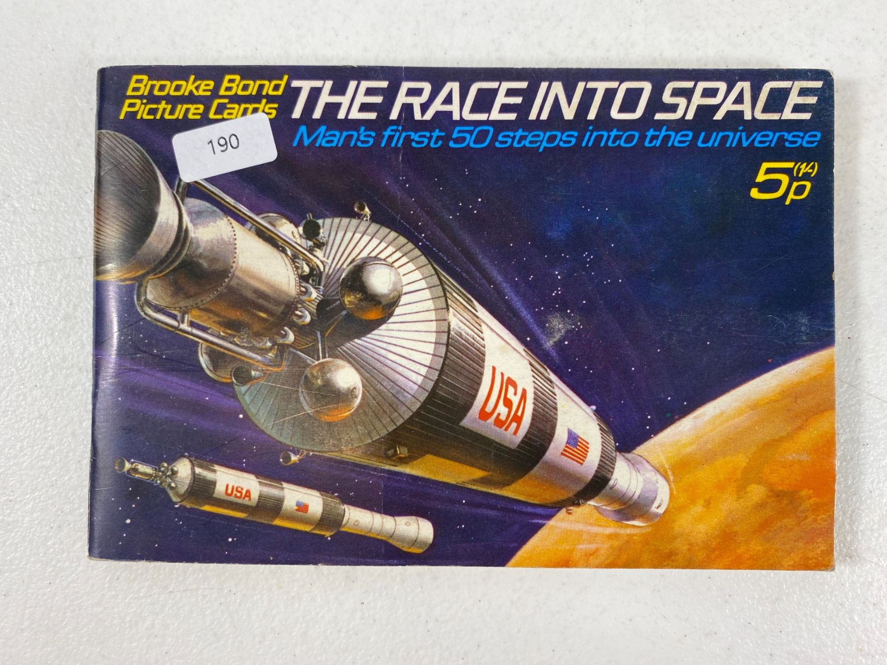 A fully illustrated Brooke Bond “The Race Into Space” picture card album highlighting early manned exploration and technological milestones of the space age. Appears complete or mostly complete based on included cards.