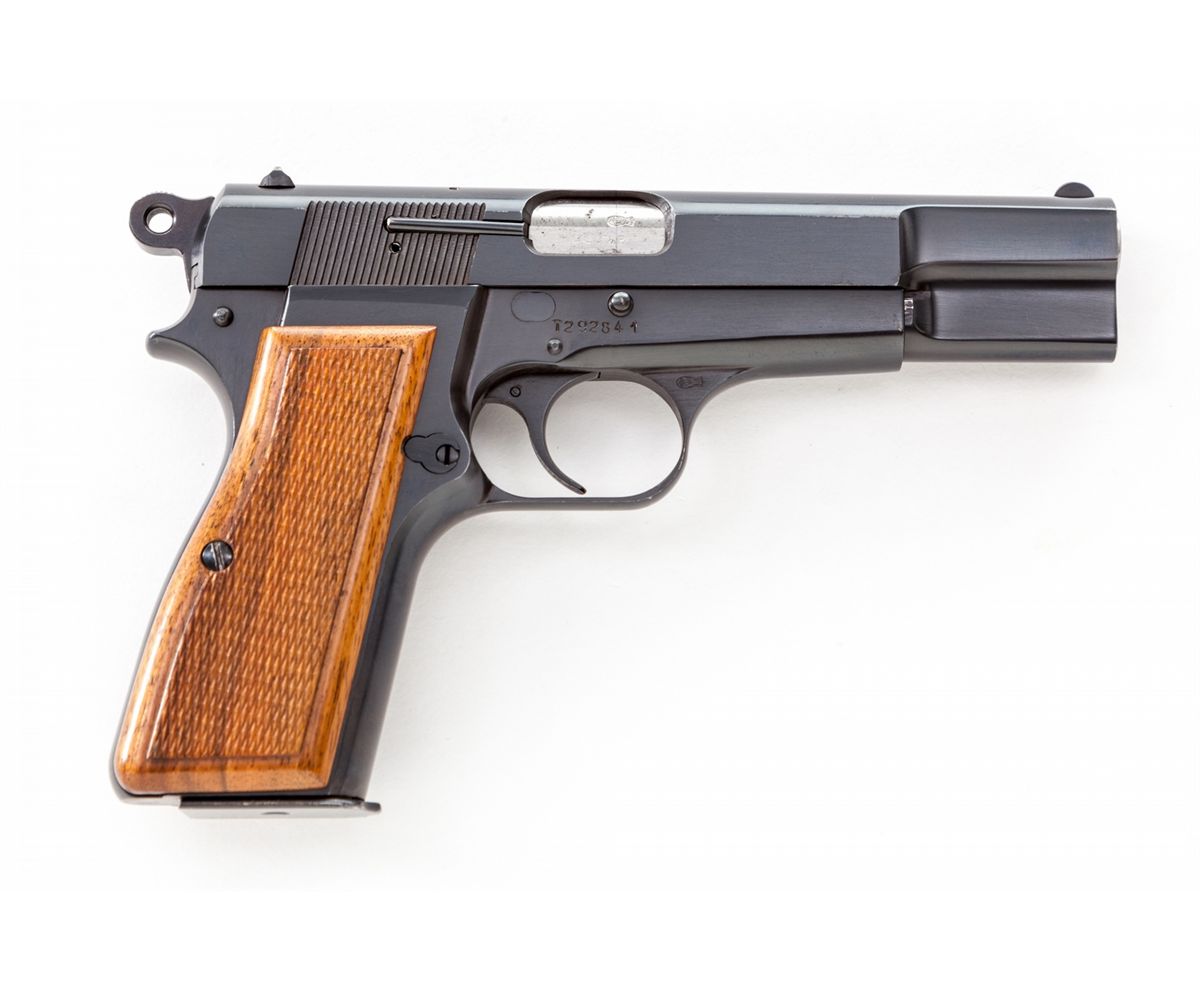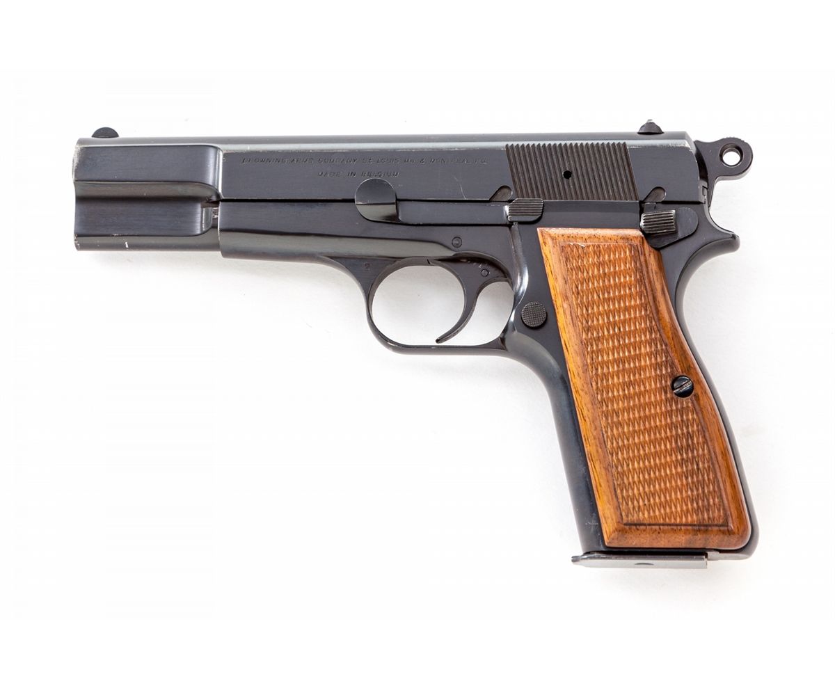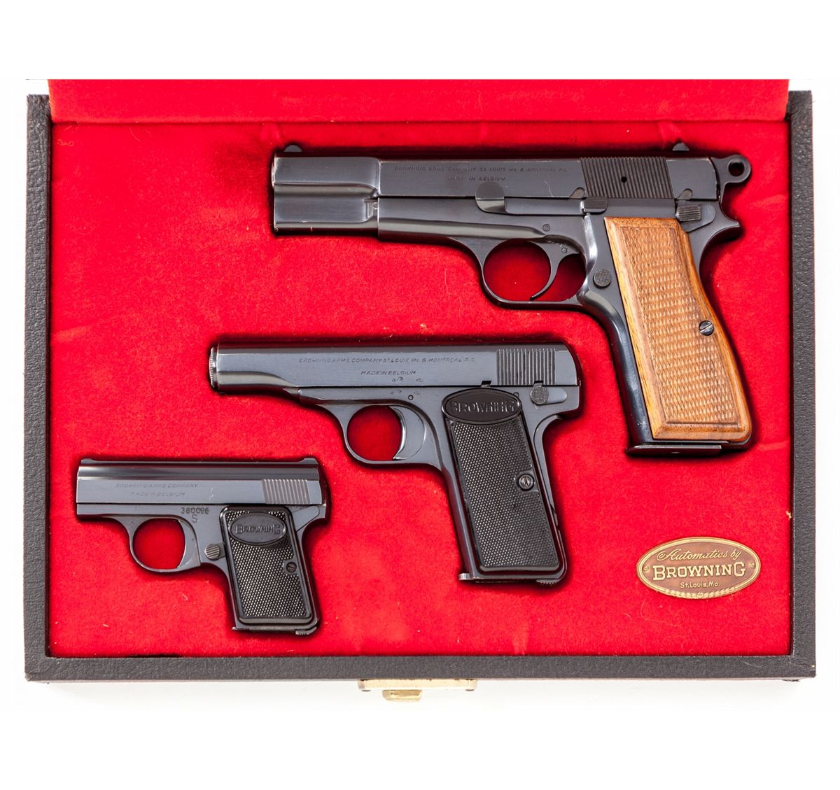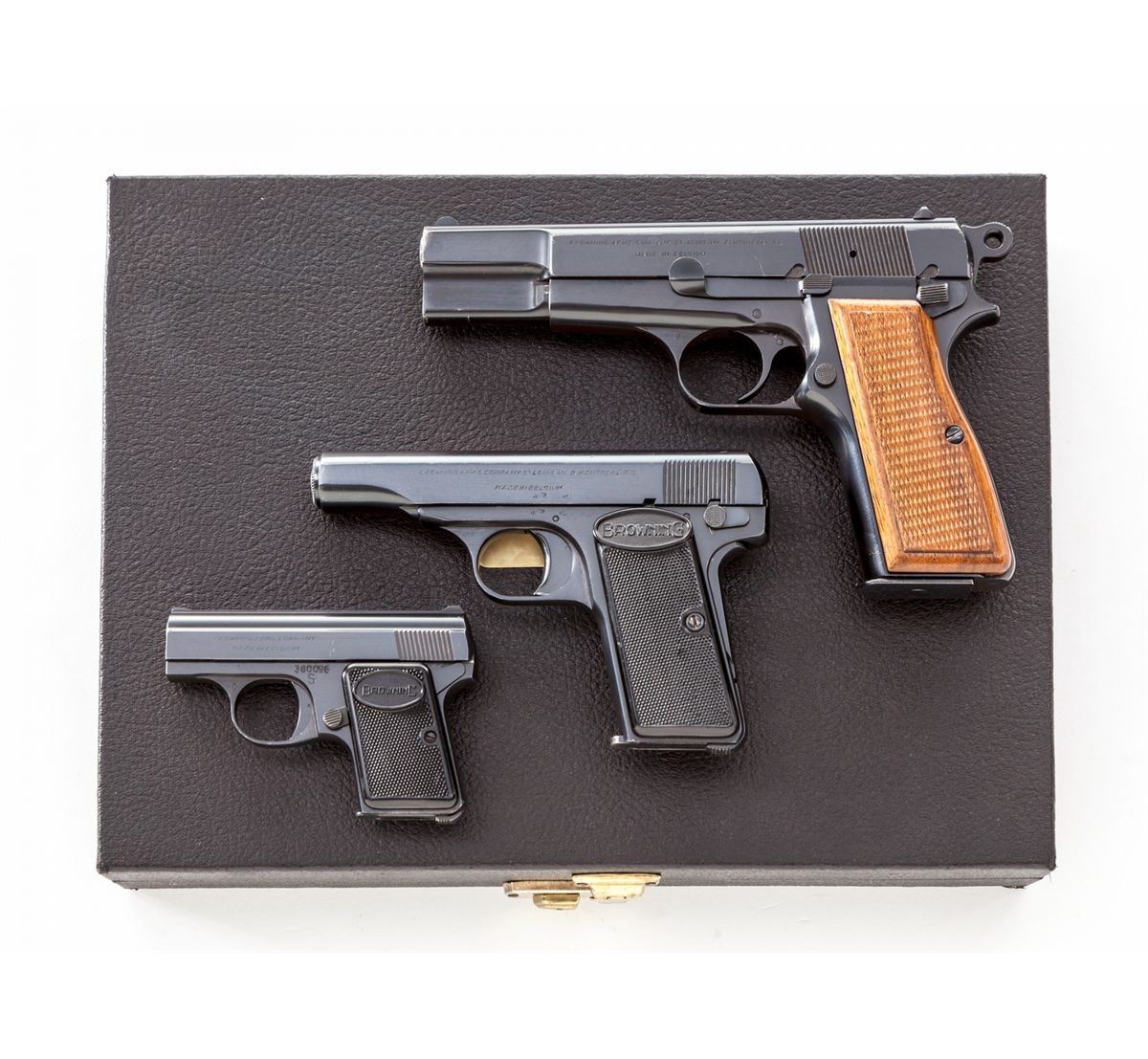 Browning Three-Gun Semi-Automatic Pistol Set: (1) Browning High Power, #T292841, 9mm, 4-3/4'' barrel, blue finish, factory checkered walnut grip, with one mag. Condition is excellent with very light high edgewear to slide and at muzzle. (2) Browning Model 1955, #559334, .380 cal., 3-1/2'' barrel, blue finish, black checkered factory plastic grips. Condition is excellent showing only the slightest marks from handling. (3) Baby Browning, #380096, .25 ACP cal., 2'' barrel, blue finish, factory checkered black plastic grips. Condition is excellent with only slight marks from handling. Condition to red-lined leatherette covered case is excellent with just light marks at corners. With all associated paperwork and Browning naugahyde for all three pistols. Est.: $1,500-$2,000/set. (Modern)