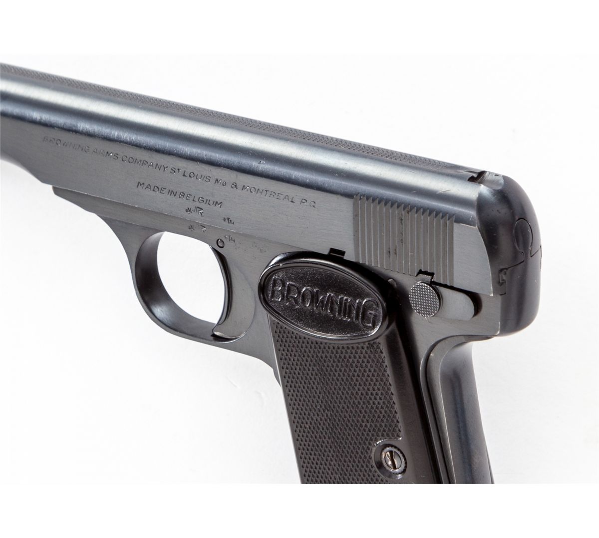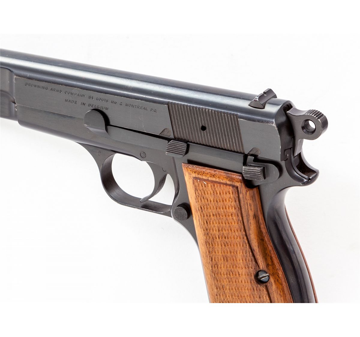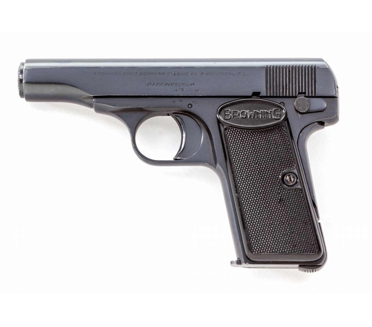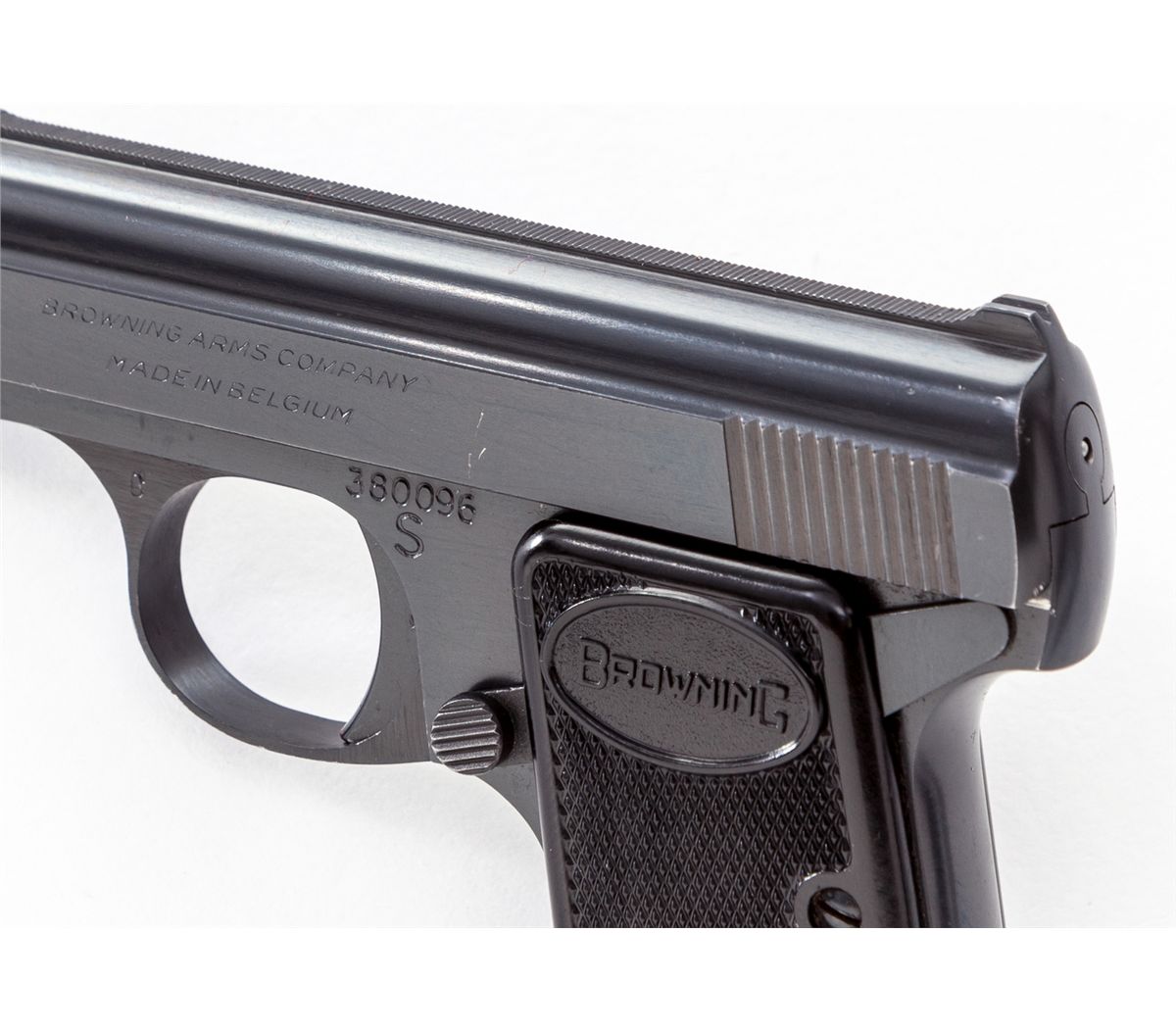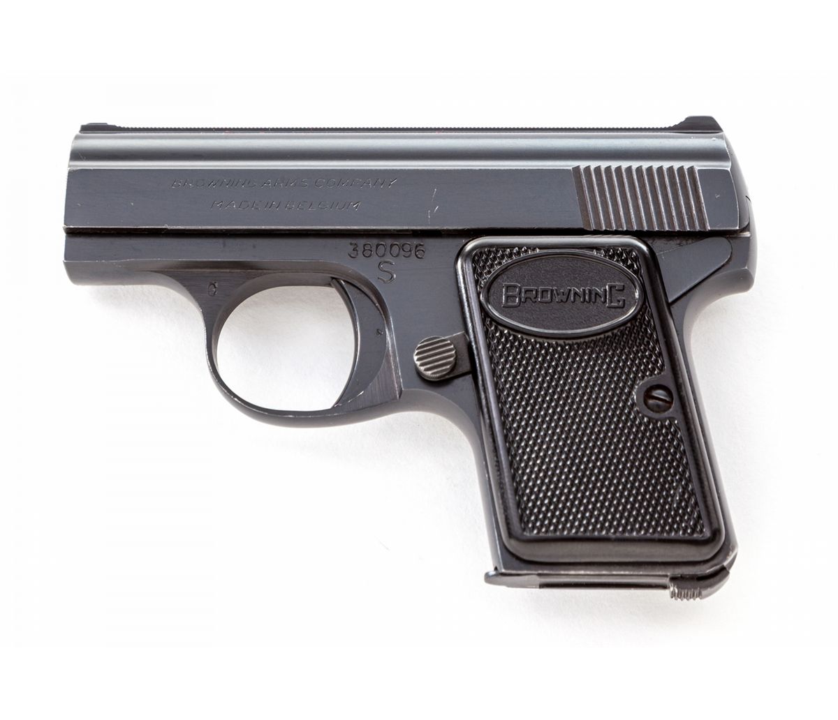 Browning Three-Gun Semi-Automatic Pistol Set: (1) Browning High Power, #T292841, 9mm, 4-3/4'' barrel, blue finish, factory checkered walnut grip, with one mag. Condition is excellent with very light high edgewear to slide and at muzzle. (2) Browning Model 1955, #559334, .380 cal., 3-1/2'' barrel, blue finish, black checkered factory plastic grips. Condition is excellent showing only the slightest marks from handling. (3) Baby Browning, #380096, .25 ACP cal., 2'' barrel, blue finish, factory checkered black plastic grips. Condition is excellent with only slight marks from handling. Condition to red-lined leatherette covered case is excellent with just light marks at corners. With all associated paperwork and Browning naugahyde for all three pistols. Est.: $1,500-$2,000/set. (Modern)