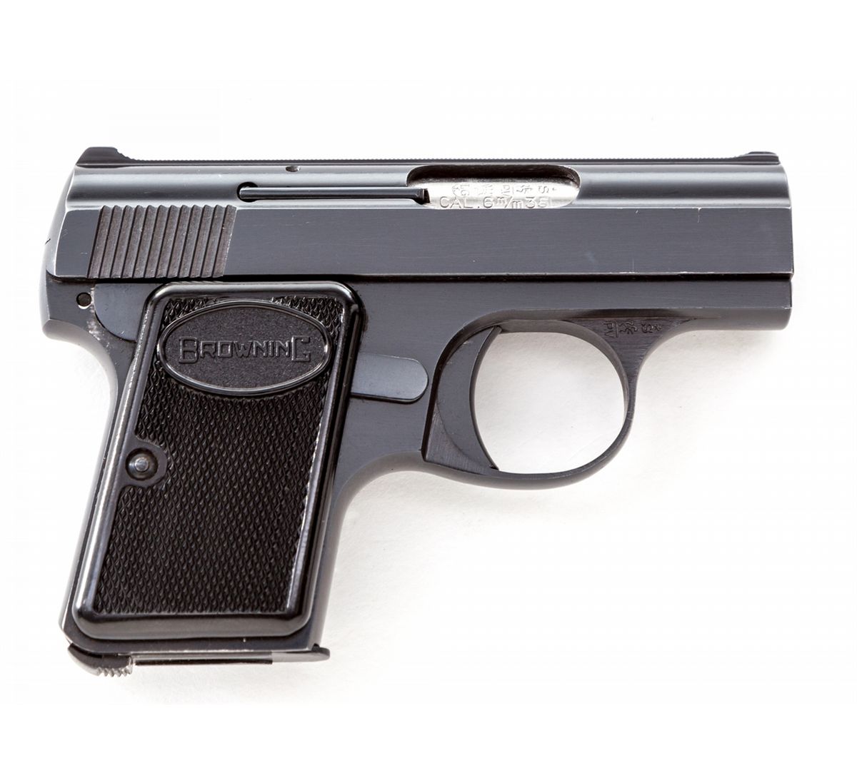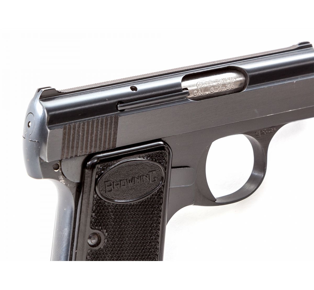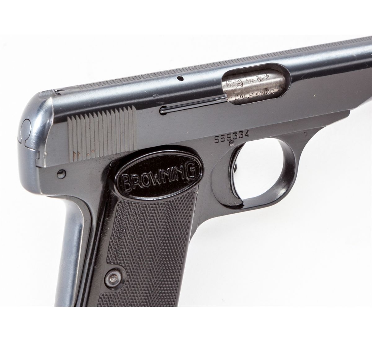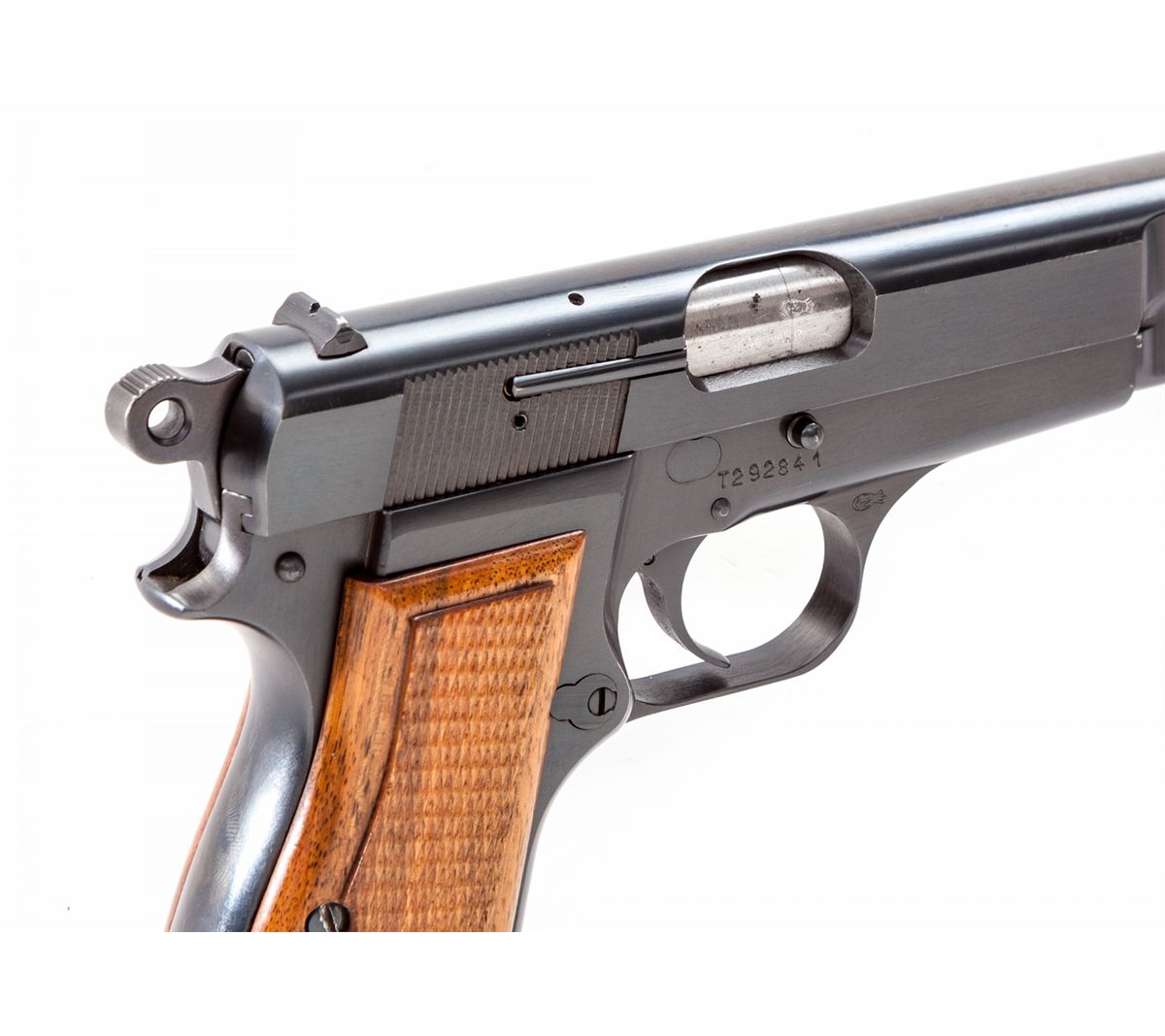 Browning Three-Gun Semi-Automatic Pistol Set: (1) Browning High Power, #T292841, 9mm, 4-3/4'' barrel, blue finish, factory checkered walnut grip, with one mag. Condition is excellent with very light high edgewear to slide and at muzzle. (2) Browning Model 1955, #559334, .380 cal., 3-1/2'' barrel, blue finish, black checkered factory plastic grips. Condition is excellent showing only the slightest marks from handling. (3) Baby Browning, #380096, .25 ACP cal., 2'' barrel, blue finish, factory checkered black plastic grips. Condition is excellent with only slight marks from handling. Condition to red-lined leatherette covered case is excellent with just light marks at corners. With all associated paperwork and Browning naugahyde for all three pistols. Est.: $1,500-$2,000/set. (Modern)