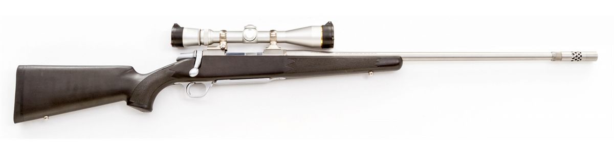 Browning A-Bolt Bolt Action Rifle, #96960NW8S7, .300 Win. mag. cal., 24'' compensated barrel, stainless steel finish, black synthetic stock. Topped with a Leupold 3.5x10 Vari-X III bright finished scope. Condition is excellent, showing only light use. Action is crisp, bore is bright, optics are clear. Est.: $750-$1,000. (Modern)