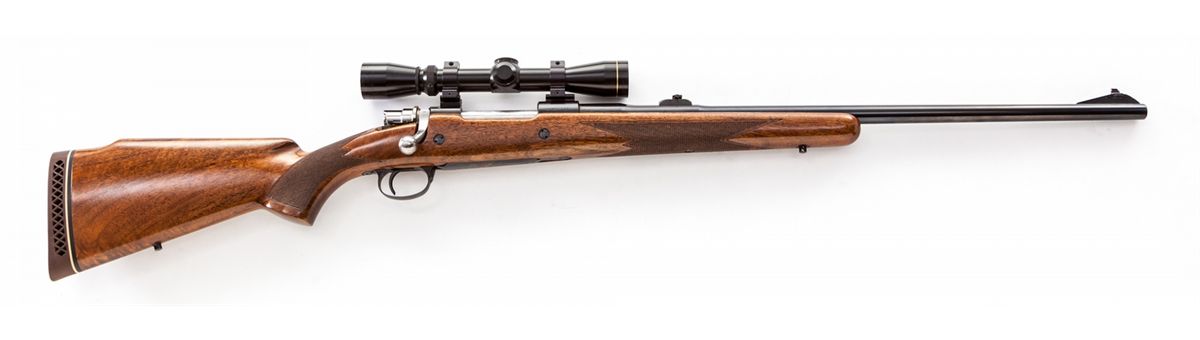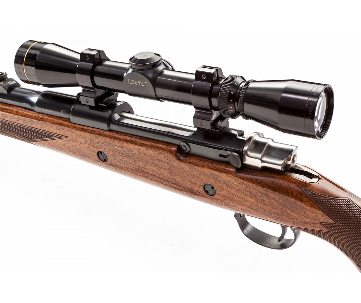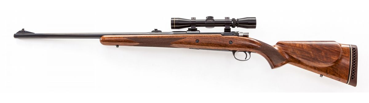 Browning FN High-Power Safari Grade Bolt Action Rifle, #64761L73, .338 Win. mag. cal., 24'' barrel, blue finish, checkered pistol-grip walnut stock, with Weaver rings and mounts and 2x7 Leupold scope; standard sights are present as well. Dating from 1973. Condition is excellent showing light handling marks to stock and minor thinning to finish at balance point of floorplate. Action is crisp, bore is bright. Est.: $1,500-$2,000. (Modern)