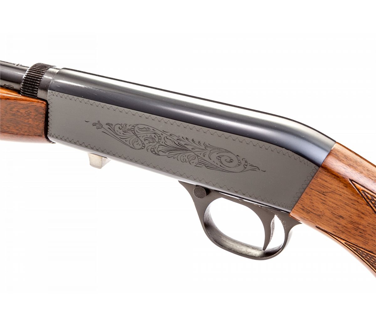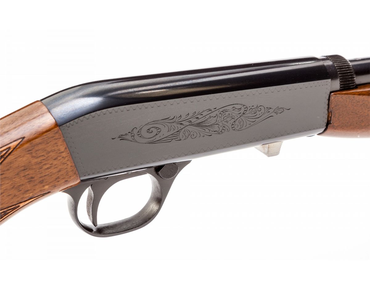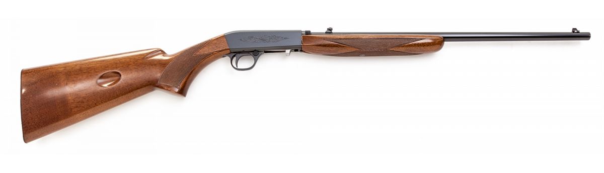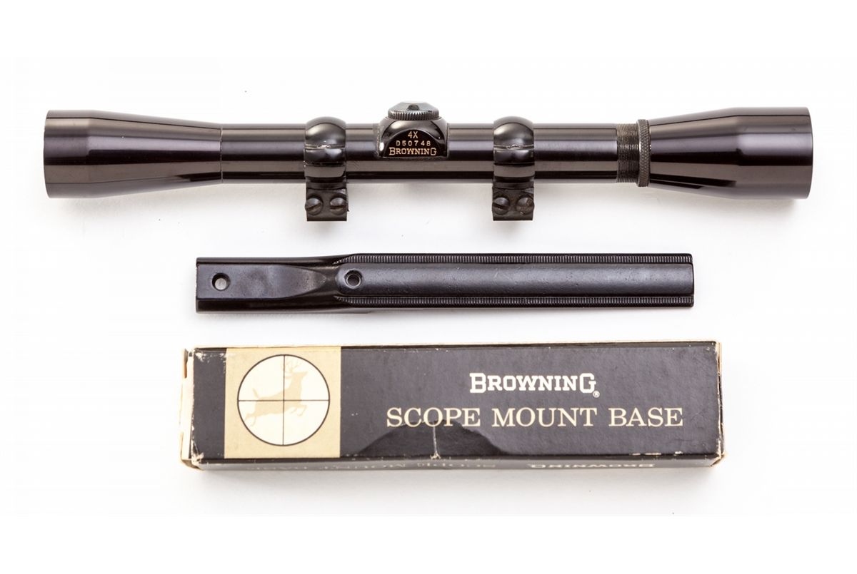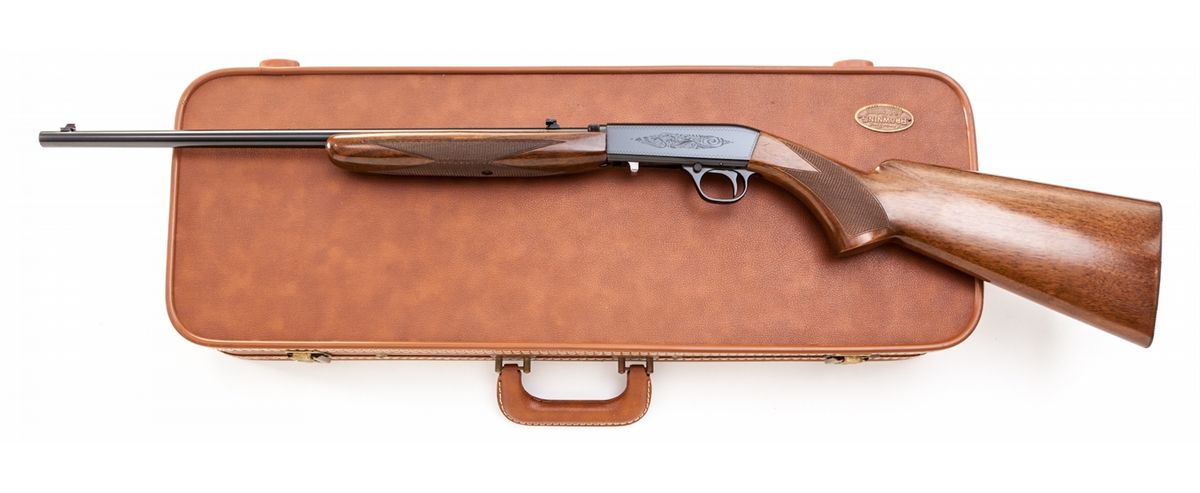 Browning Grade I Takedown Semi-Automatic Rifle, #69T26953, .22 LR cal., 19-1/4'' barrel, blue finish, with checkered walnut stock and forend. With Browning scope mount, rings, and Browning marked scope, along with three boxes of Browning ammo and original instructions. In Browning leather travel case, with keys and hang tag. Condition is in excellent as new condition, with toning to metal components on handle of case. Est.: $1,000-$1,500. (Modern)