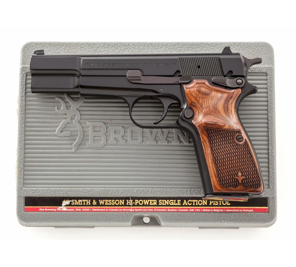 Browning Hi-Power Semi-Automatic Pistol, #2W5NT50957, .40 S&W cal., 4-3/4'' barrel, satin black finish, laminated checkered hardwood grips with fleur d'lis pattern, as well as original black plastic grips, with two (2) factory 10-round magazines and one competition 10-round magazine. Condition is excellent, appearing near new, in original box with instructions. Est.: $500-$750. (Modern)