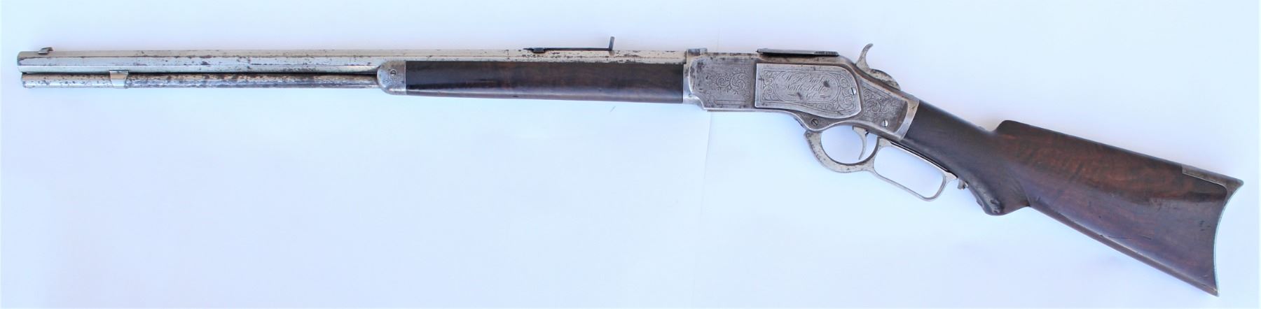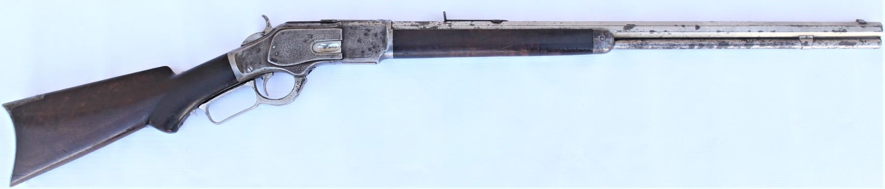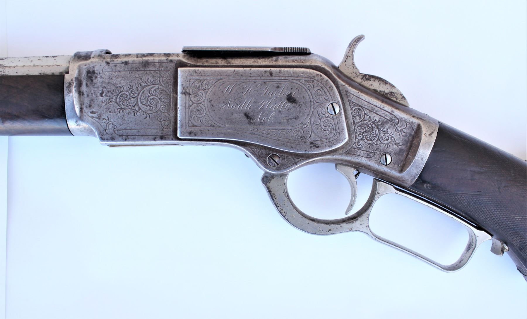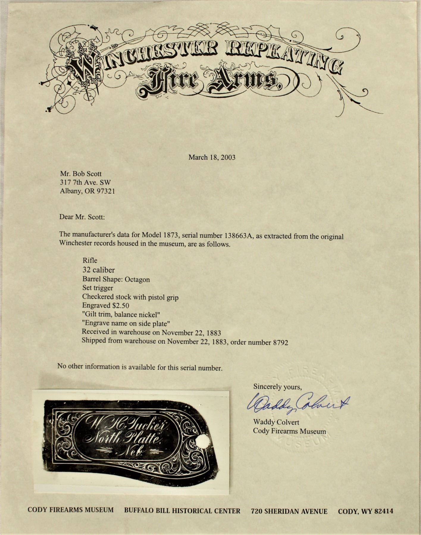A phenominal piece of Wild West Show history, this Winchester 1873 deluxe rifle belonged to the well known sharp shooter that was a decorated US Cavalry soldier and then later toured with Buffalo Bills Wild West Show. W.H. Tucker's photograph is found at the lower left of the 1885 show poster where he is known as "Ogallala Tucker". As the rifle is presentation engraved "W.H. Tucker North Platte, Neb.", which is where Tucker lived, and Ogallala is a nearby town. The rifle comes with documents of Tucker's life and also information of how the rifle has been passed along, which includes a 1972 Winchester Museum build sheet that states its history back to 1934 and that it was currently in the collection of DW Roberts. It is notated with statistics on the build sheet just how rare this rifle is, being 1 of 700 engraved, 1 of 600 plated, and 1 of 260 with a name. It is also an oddity in the way that this rifle may be one of the very first 32 calibers, as serial #138,000 is barely inside the 3rd model range and there were only 44-40 calibers available in second model, making it even more special. W.H. Tucker is extensively talked about in the well known book "Buffalo Bill: His Family, Friends, Fame, Failures, and Fortunes", by Nellie Yost, where she notes that he was the owner of the most prominant saloon in town, and other great details, as Buffalo Bill also had a magnificent ranch in North Platte. Also accompanied by a 2003 Winchester letter where it is documented in the Cody Museum records as being ordered with a $2.50 factory engraved reciever with engraved name on sideplate, nickel finish and gilt (gold) trim, chambered in 32 caliber, octagon barrel, set trigger and checkered fancy stock with pistol grip. The rifle shows wonderful honest condition with much of its original nickel and beautiful engraving.